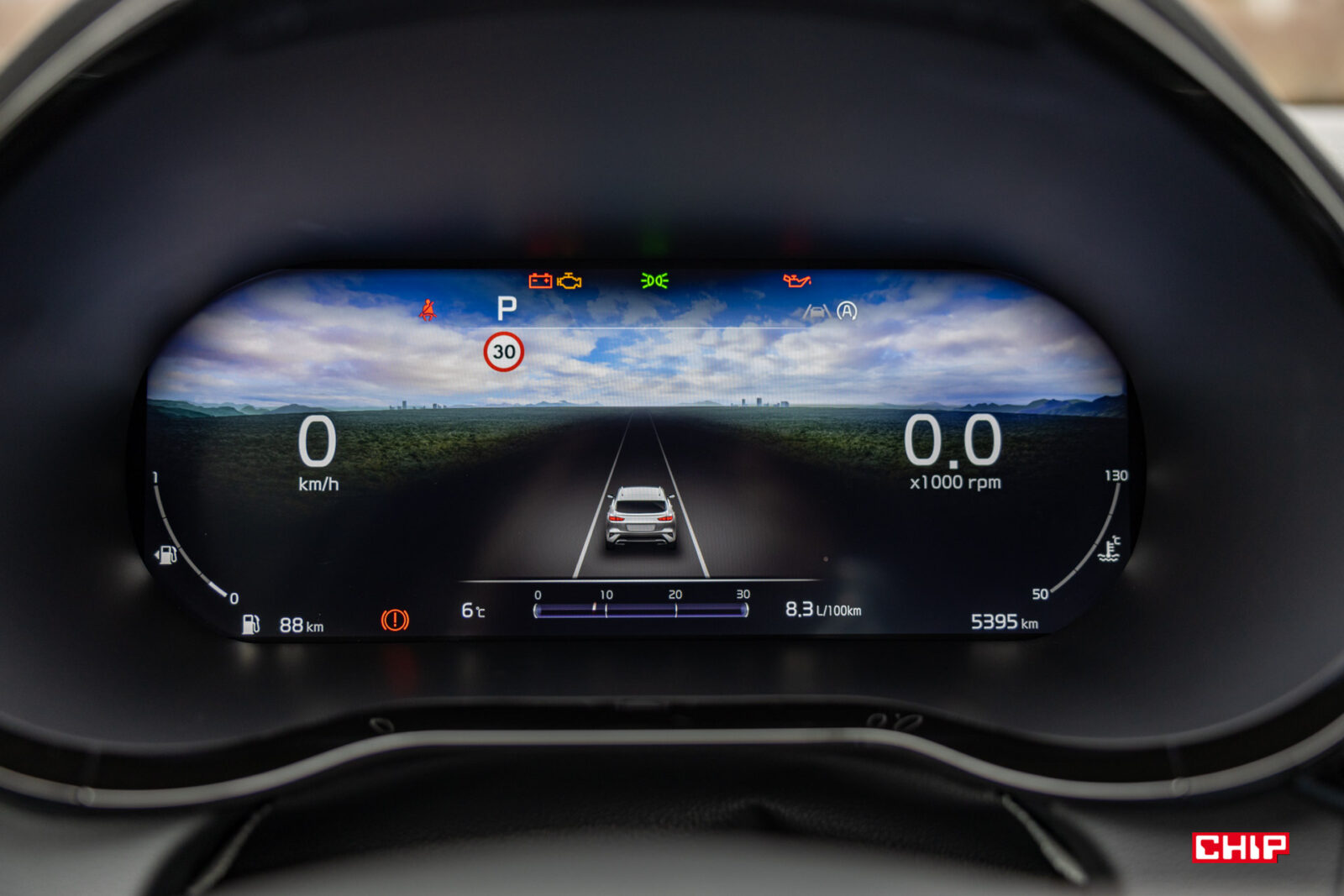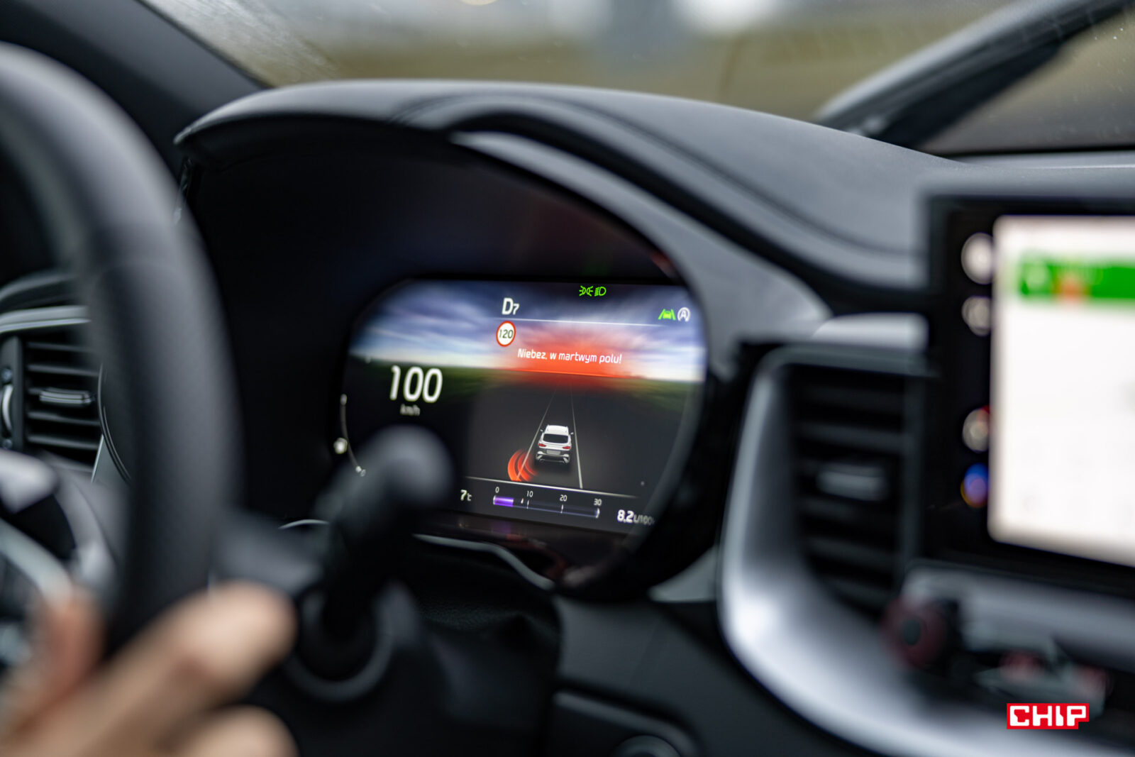 Małe zmiany wizualne pojawiły się też na ekranie kierowcy. Motywy znane z innych modeli producenta zostały lekko zmienione wizualnie. Jest zdecydowanie efektowniej. Do tego pojawił się zupełnie nowy, animowany motyw. Widzimy na nim zmieniający się krajobraz. Inny w dzień, inny wieczorem, zmieniający się wraz z pogodą. Jeśli pada deszcz, na ekranie zobaczymy pojedyncze, spływające krople wody. Bajer, ale szalenie efektowny. Po włączeniu widoku asystentów jazdy, na ekranie jest sygnalizowane pojawienie się innego auta w martwym polu. Obok standardowego podświetlenia ikony umieszczonej na lusterku. To użyteczna funkcja.