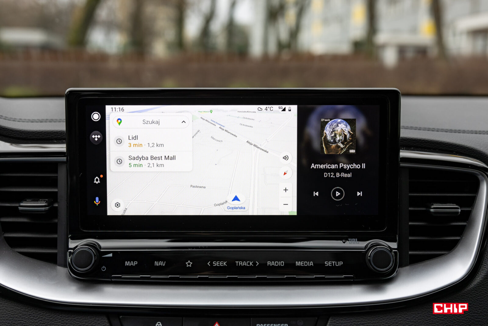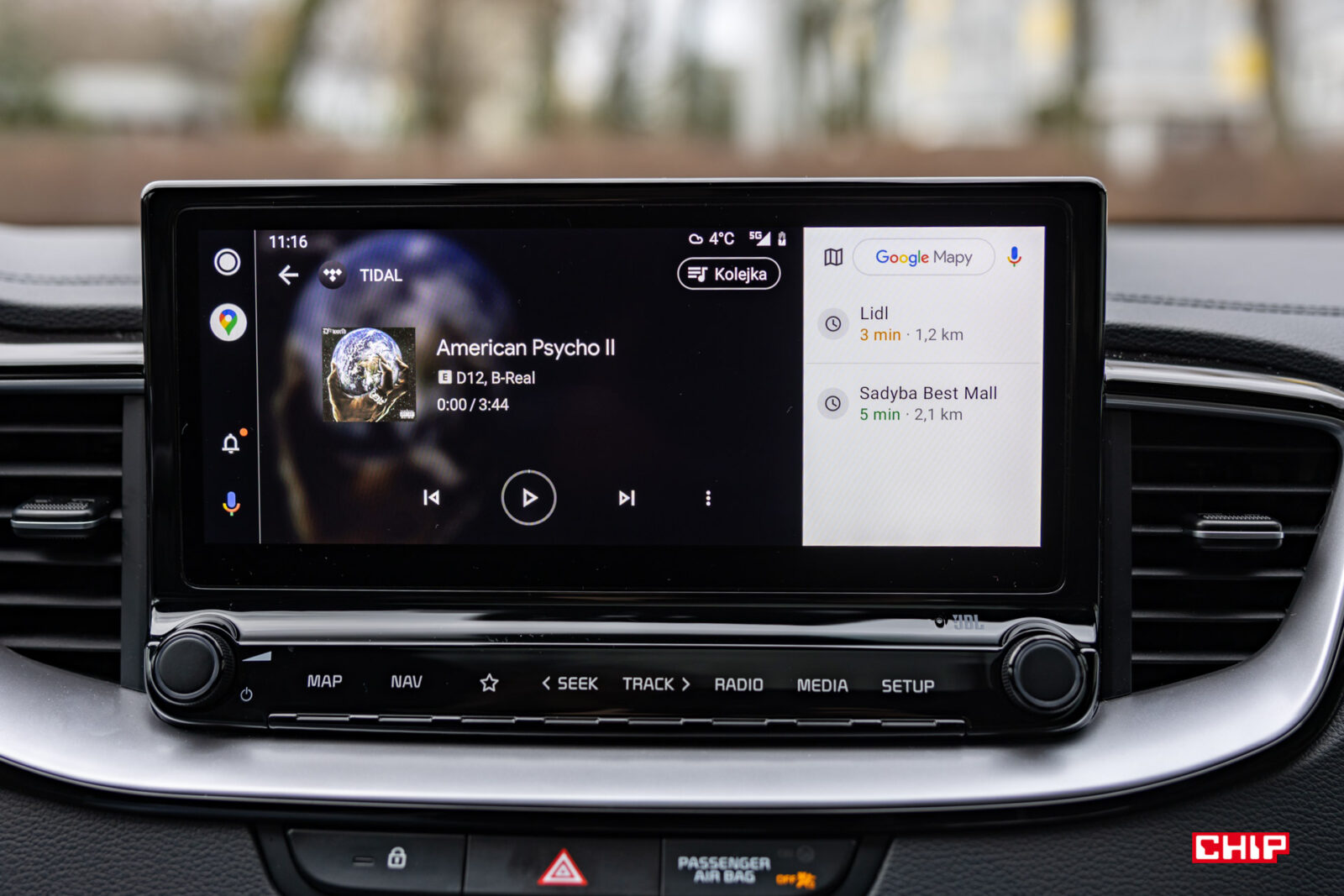 Magia zadziała się po podłączeniu smartfonu z aktywnym Android Auto (po kablu). Aż chce się powiedzieć, że narzekanie się opłacało. W końcu ekran jest funkcjonalnie dzielony! Nie mamy już zmarnowanej 1/3 powierzchni ekranu na bezsensowną czarną wstawkę z nazwą podłączonego smartfonu. Teraz bez problemu możemy mieć obok siebie Mapy Google i np. Tidala. Do tego łatwo zamieniać je miejscami. Cywilizacja! A to nie koniec, bo komunikaty z Android Auto może też być wyświetlane na wydzielonej części ekranu kiedy poruszamy się po interfejsie auta.