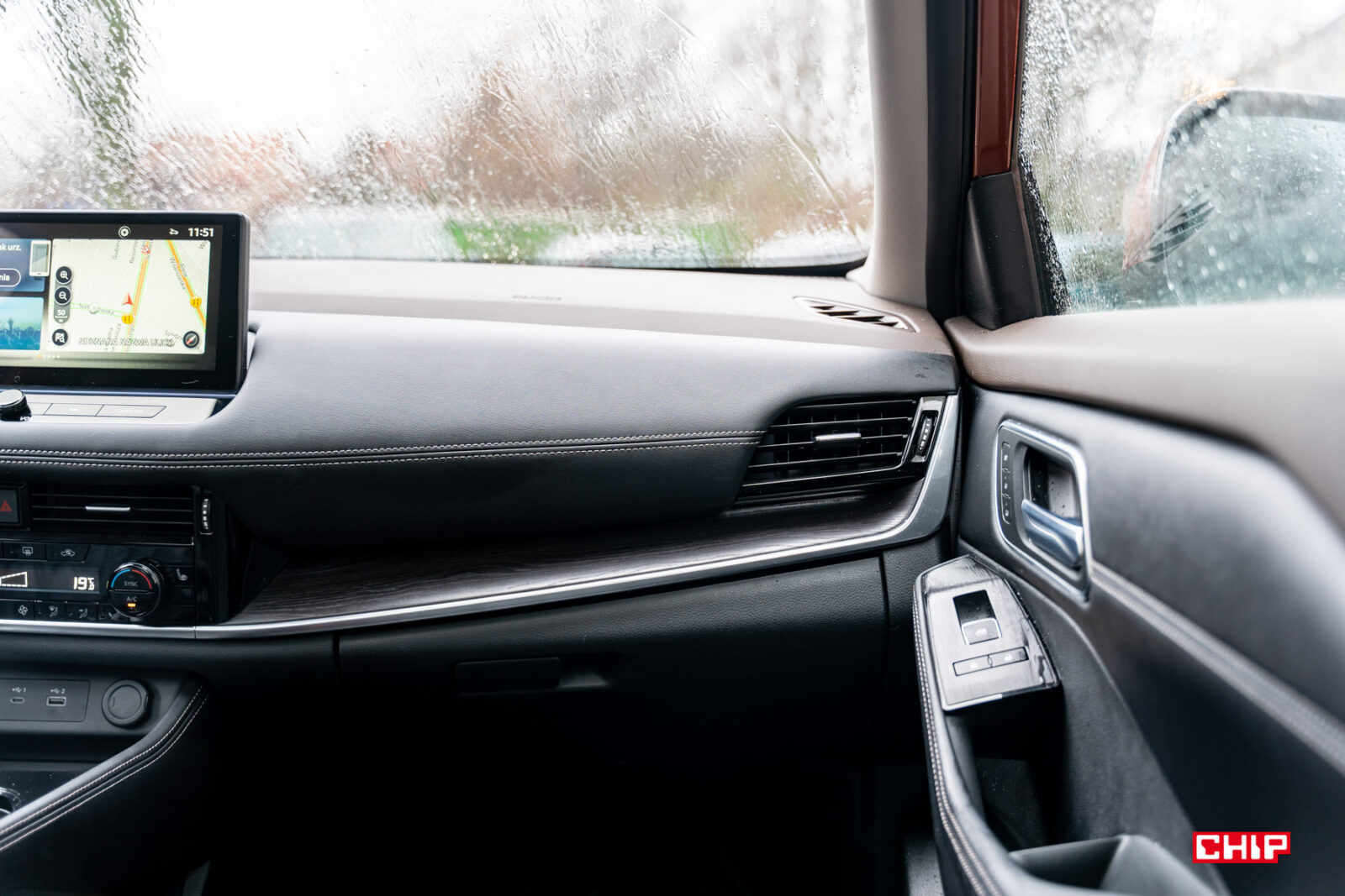 Terenowe zacięcie nowego X-Traila znika po zajrzeniu do wnętrza. Tu jest już tylko luksus, ale bardzo znajomy. Wiele elementów będzie znana osobom, które miały styczność z nową odsłoną Qashqaia. Mowa o panelu sterowania klimatyzacją, który niezmiennie przypomina mi stary magnetowid. Taki sam jest też plastik imitujący drewno na desce rozdzielczej, drzwiach i środkowym panelu. Wbrew pozorom nie jest tandetny, a to i tak o wiele lepsze rozwiązanie niż tragiczny plastik piano black. Ten trafił w formie małej wstawki pod ekran.