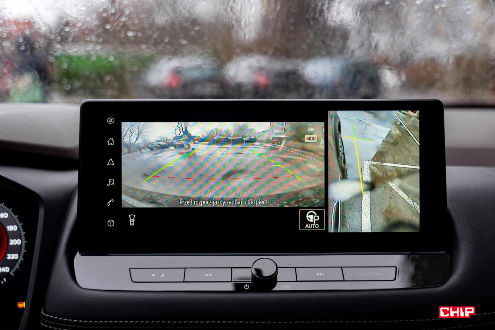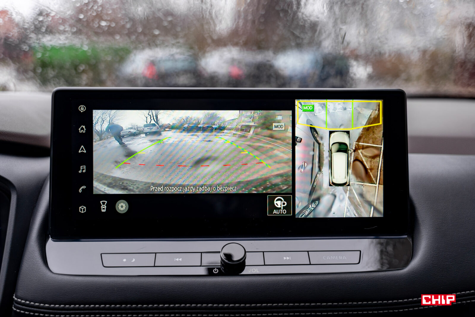 Do dyspozycji mamy bardzo użyteczny zestaw kamer 360, z bardzo przydatnym widokiem z kamery umieszczonej na prawym lusterku. Jeśli wjedziecie w wąską przestrzeń albo trudniejszy teren, daje bardzo dobry podgląd na to, co aktualnie dzieje się wokół przedniego koła. Do tego mamy asystenta parkowania, który działa tak samo (dobrze) co w Nissanie Ariya. Po szczegóły odsyłam Was do poniższej recenzji: