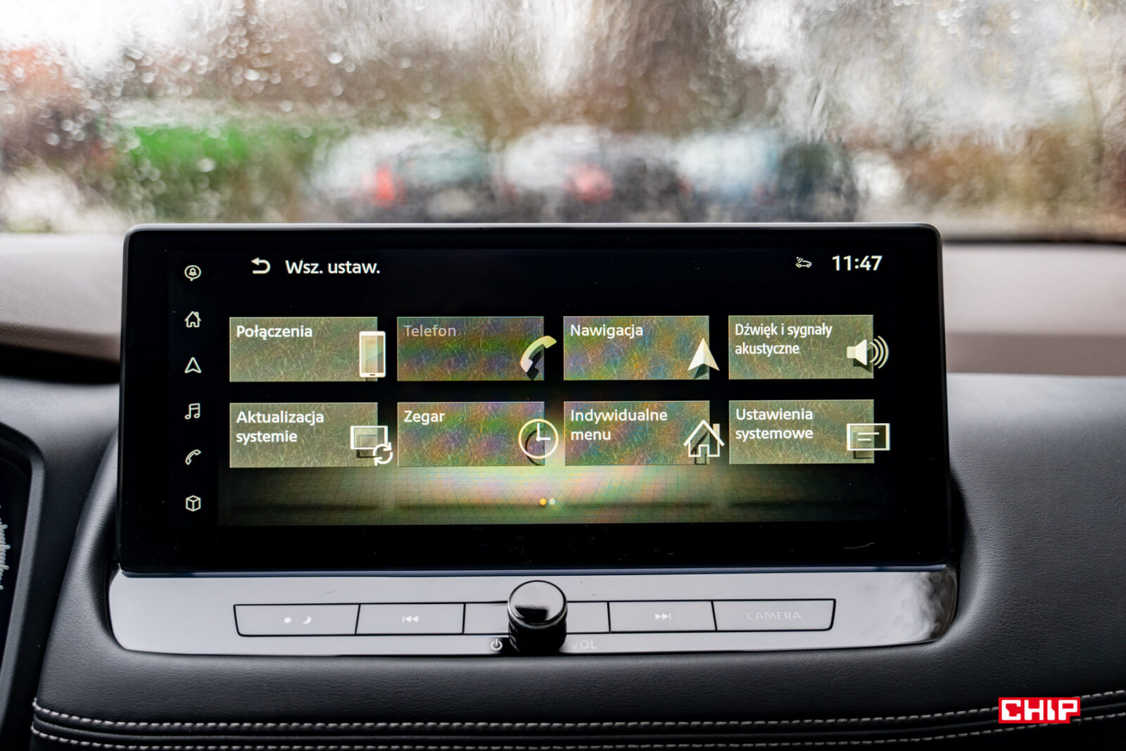 Ekran główny jest przyjemnie szeroki i otoczony cienkimi ramkami, co daje +10 do efektowności. Szkoda tylko, że mamy tu ten sam interfejs co w Qashqaiu i Arriyi. Czyli na ekranie głównym korzystamy z nawigacji, multimediów i Android Auto lub Apple CarPlay (przewodowo). Nowy Android Auto na tym ekranie wygląda wręcz obłędnie!