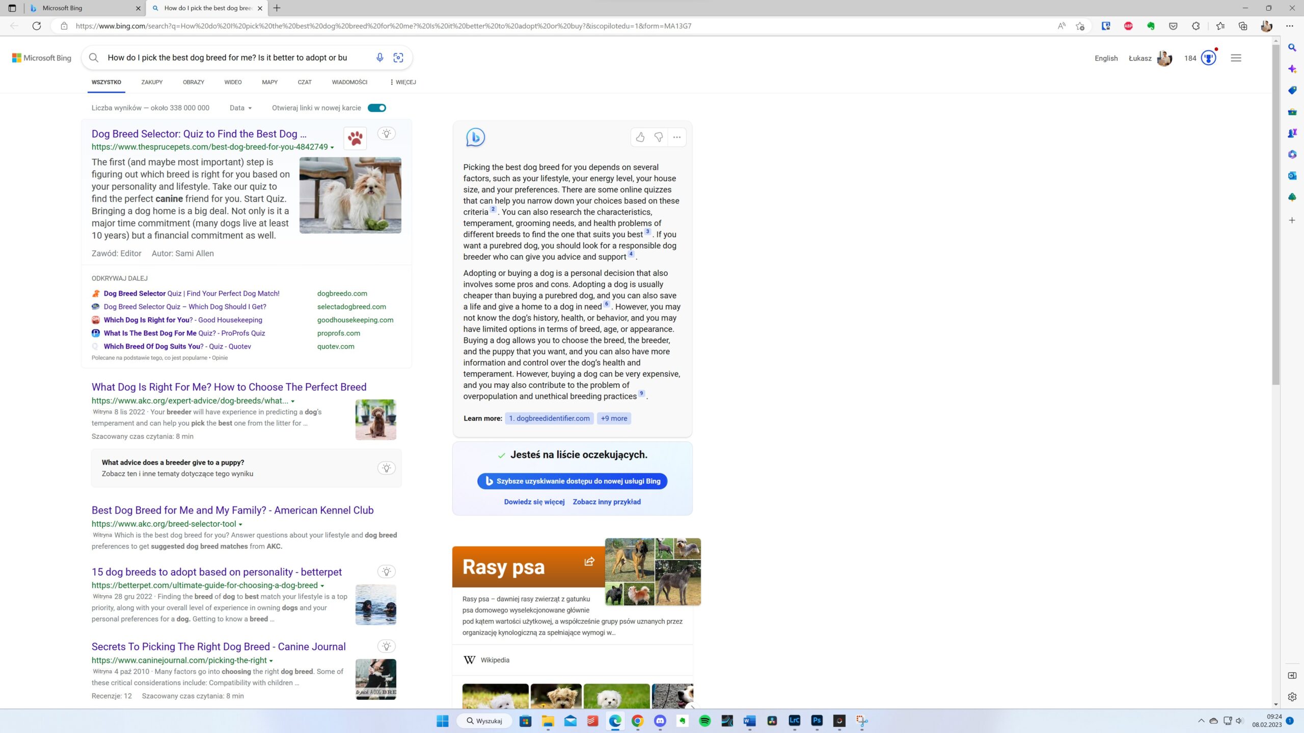 Po kliknięciu w pytanie wyszukiwarka przenosi nas do nowego widoku. Nowy Bing będzie podzielony na dwie części – po lewej stronie zobaczymy klasyczne wyniki wyszukiwania, a po prawej, czyli w miejscu, gdzie dziś widzimy podsumowania ze stron internetowych, zobaczymy okno sztucznej inteligencji. Przedziwnie wygląda moment, w którym puste okienko nagle samo zaczyna zapełniać się treścią, ale nie trwa to długo. Po chwili widzimy zarówno listę wyników znalezionych w Sieci, jak i koherentne podsumowanie przygotowane przez AI.