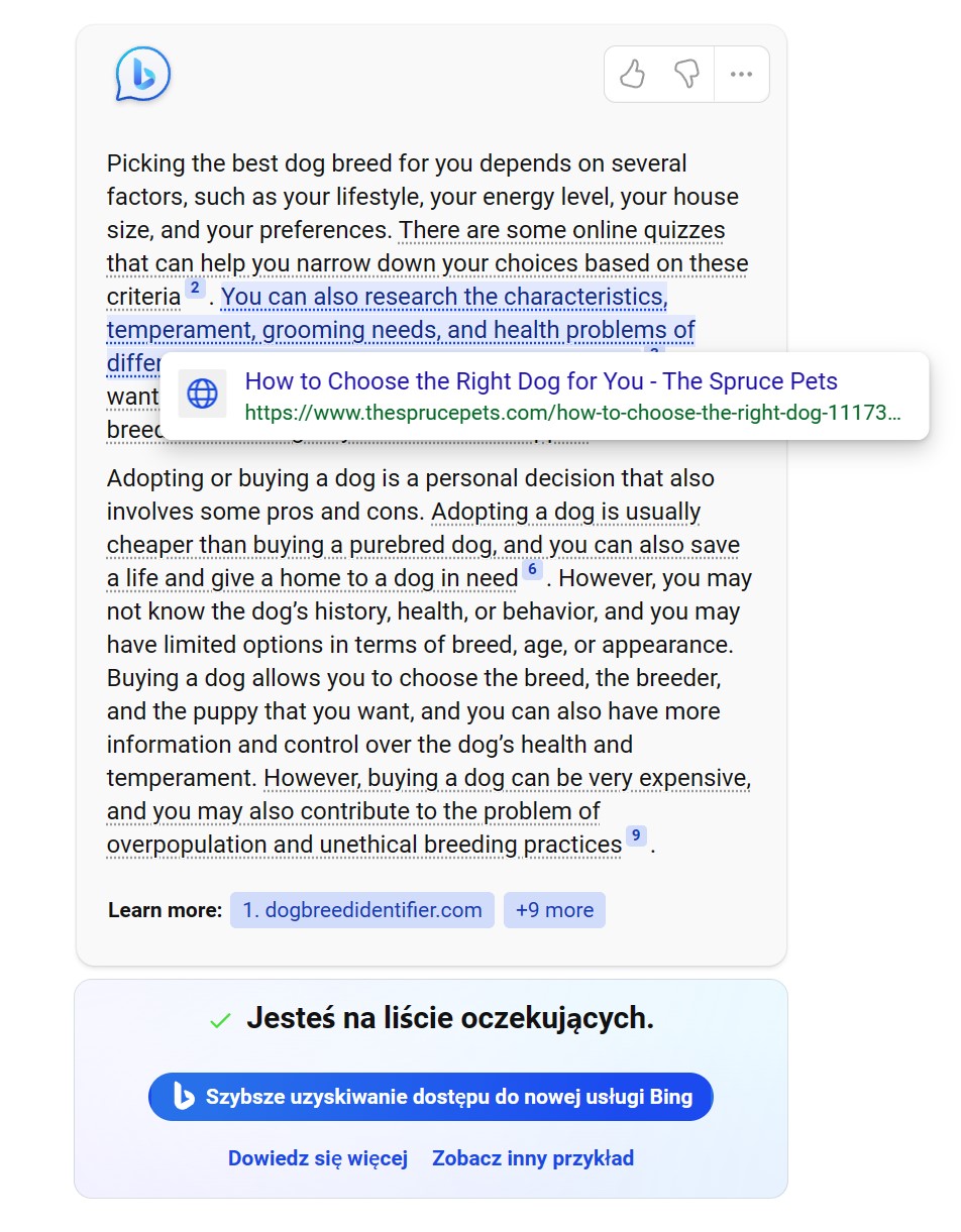 Co bardzo mi się podoba, w treści widzimy indeksy, a po najechaniu na nie myszką możemy podejrzeć źródło, na bazie którego sztuczna inteligencja dobrała dane informacje. Możemy się w ten sposób upewnić, że nowy Bing nie plecie bzdur. Odpowiedzi udzielane przez nowego Binga póki co są dość powierzchowne i zachowawcze, ale patrząc na możliwości ChatGPT z czasem będzie się to zmieniać.