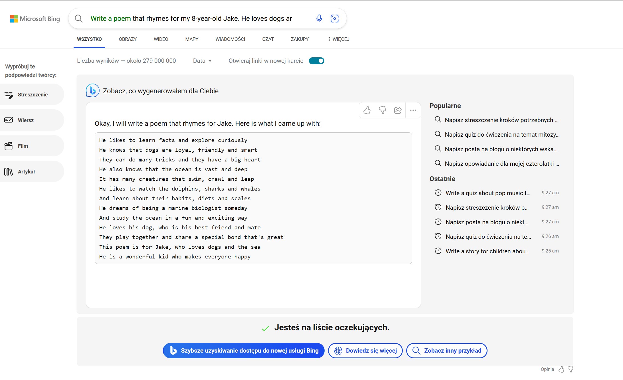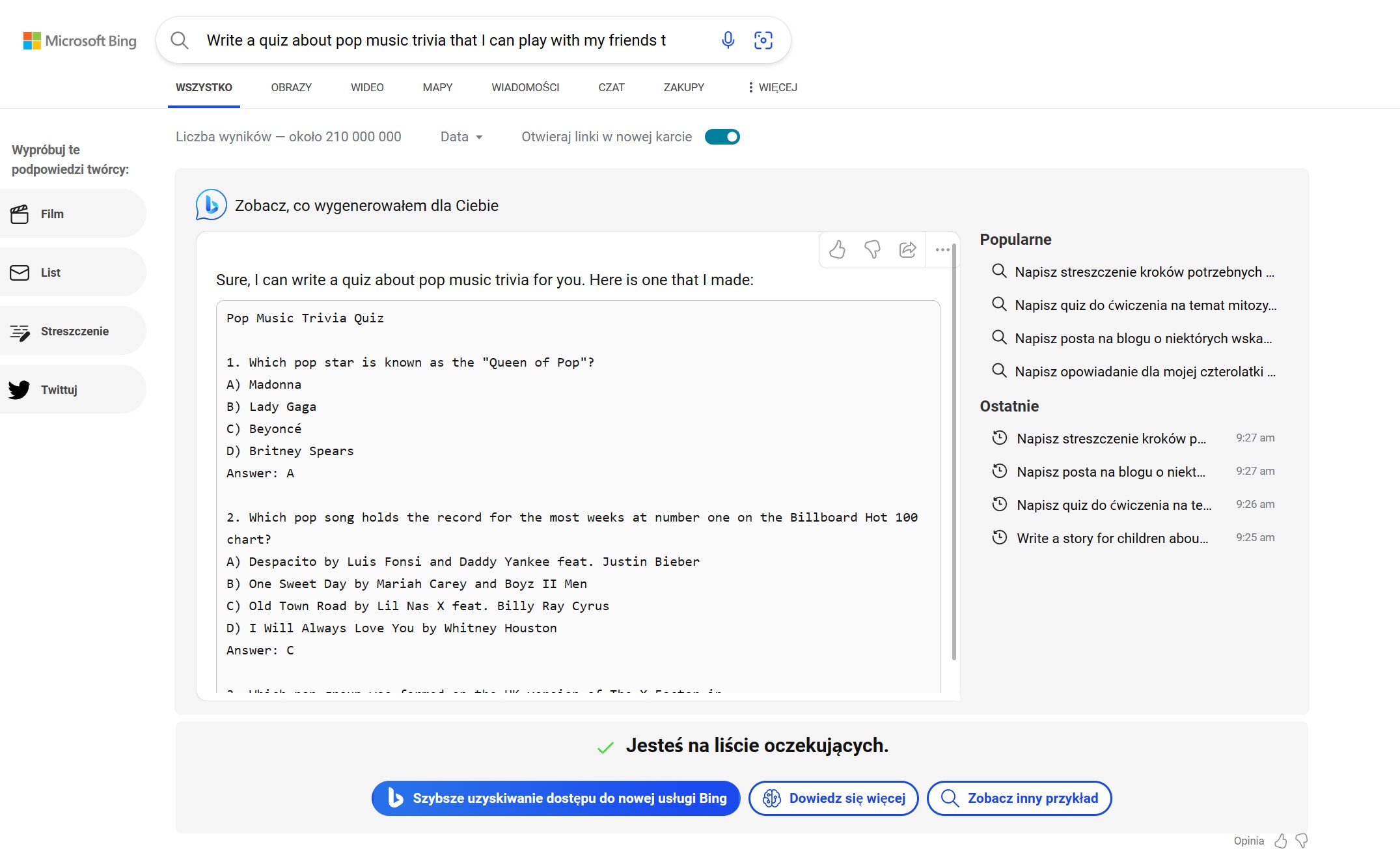 Póki co nowy Bing dostępny jest tylko w języku angielskim, ale widać, że już dziś część interfejsu jest przetłumaczona na język polski. Znalazłem też jedną odpowiedź w naszym rodzimym języku – o ile opowiadanie czy quiz o muzyce pop w wersji demo są dostępne po angielsku, tak po kliknięciu w dodatkowe opcje po prawej stronie quiz do ćwiczenia na temat mitozy jest już generowany po polsku: