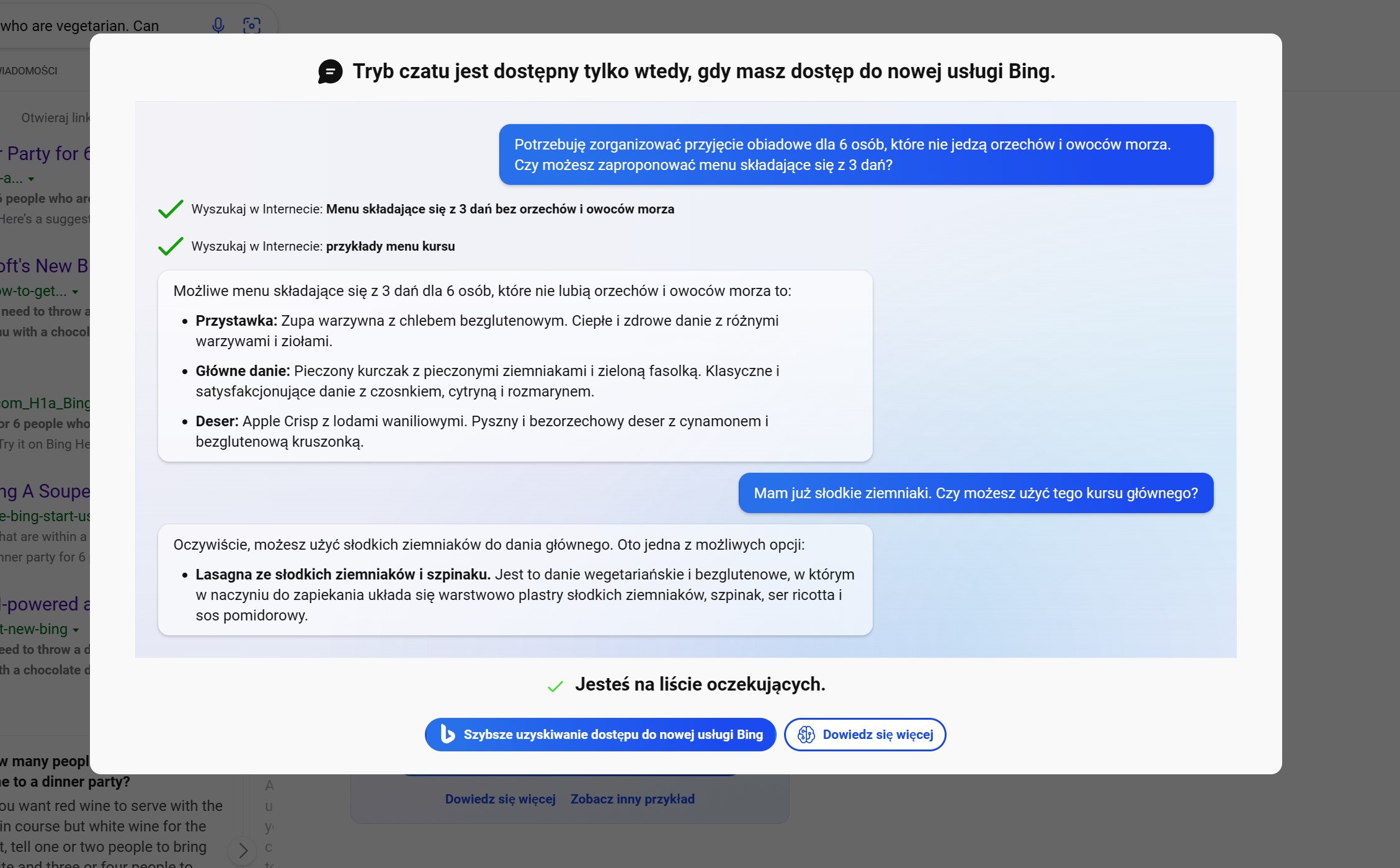 Wskazuje on jednak na to, że nowy Bing w języku polskim jest już prawdopodobnie gotowy, lub jest to tłumaczenie maszynowe przygotowane w czasie rzeczywistym (na to wskazuje np. przetłumaczenie słów main course jako „kursu głównego” zamiast „dania głównego”). Jeśli jednak wierzyć szefostwu Microsoftu, udostępnienie nowej usługi wszystkim użytkownikom to tylko kwestia tygodni.