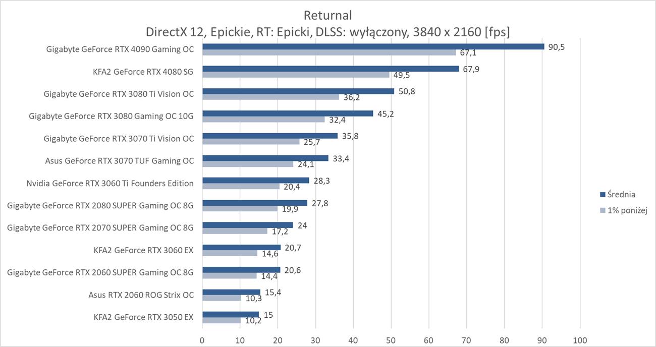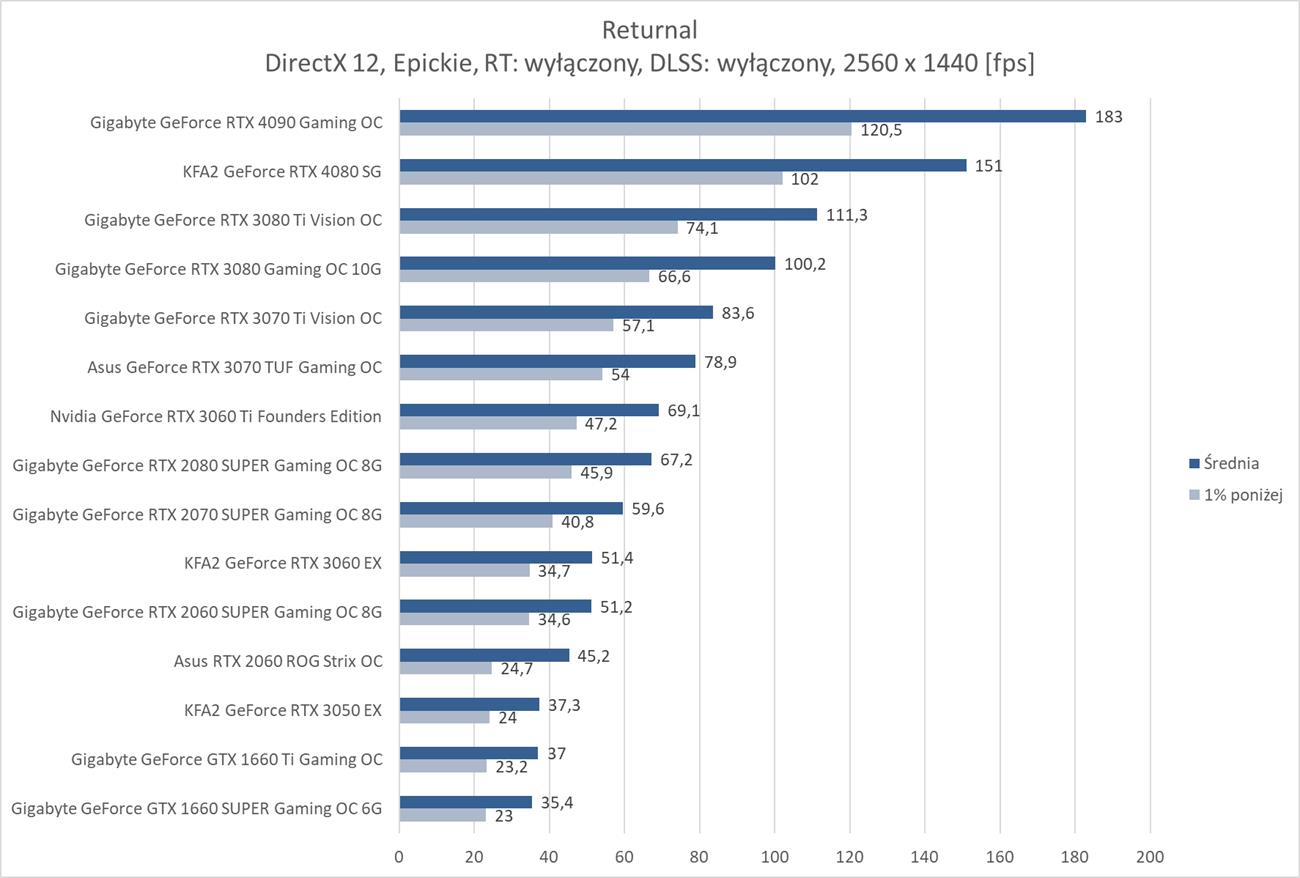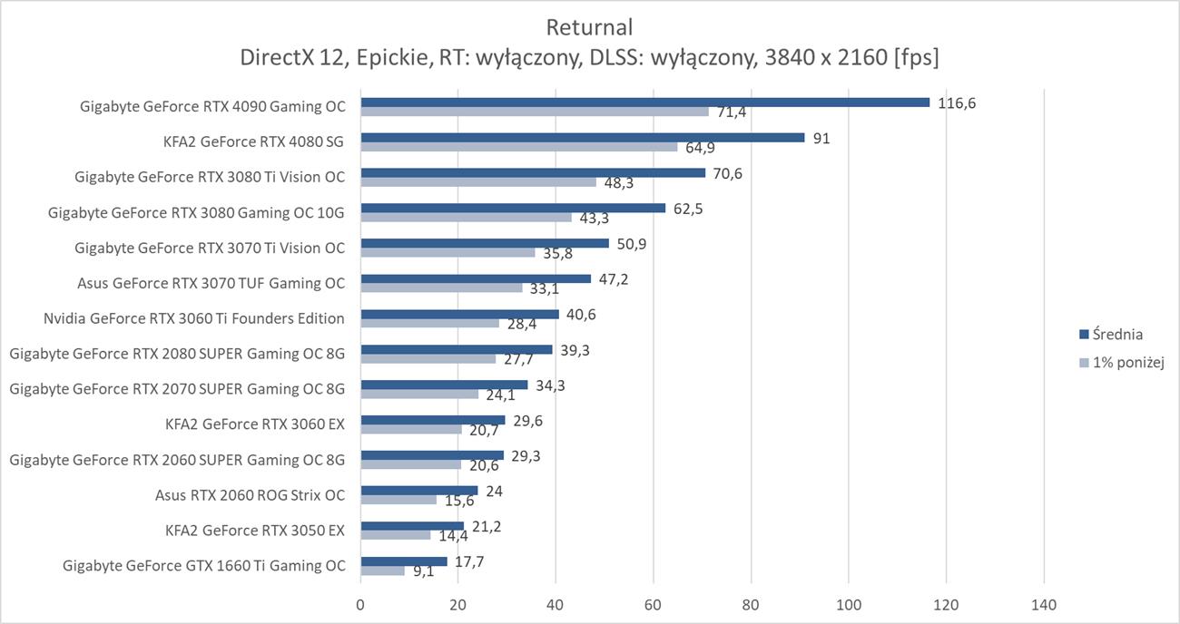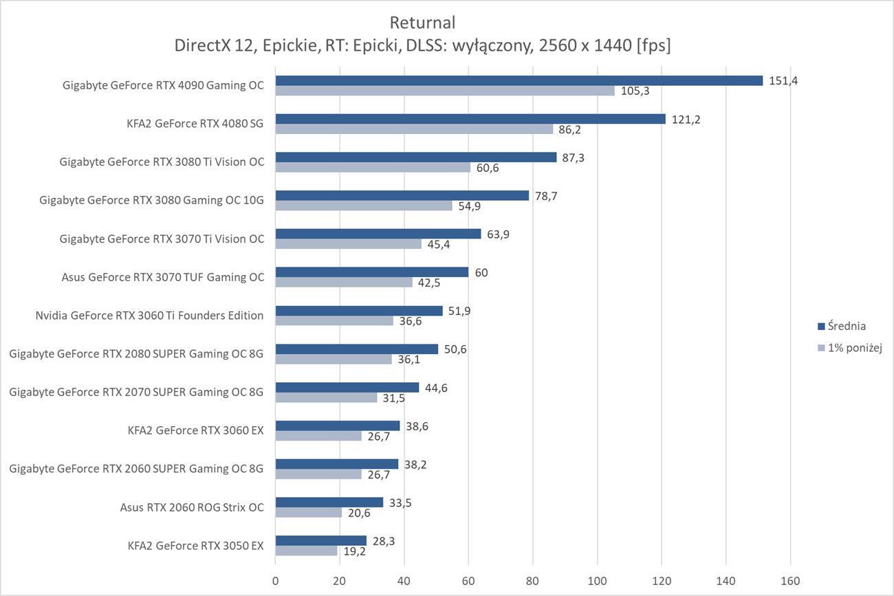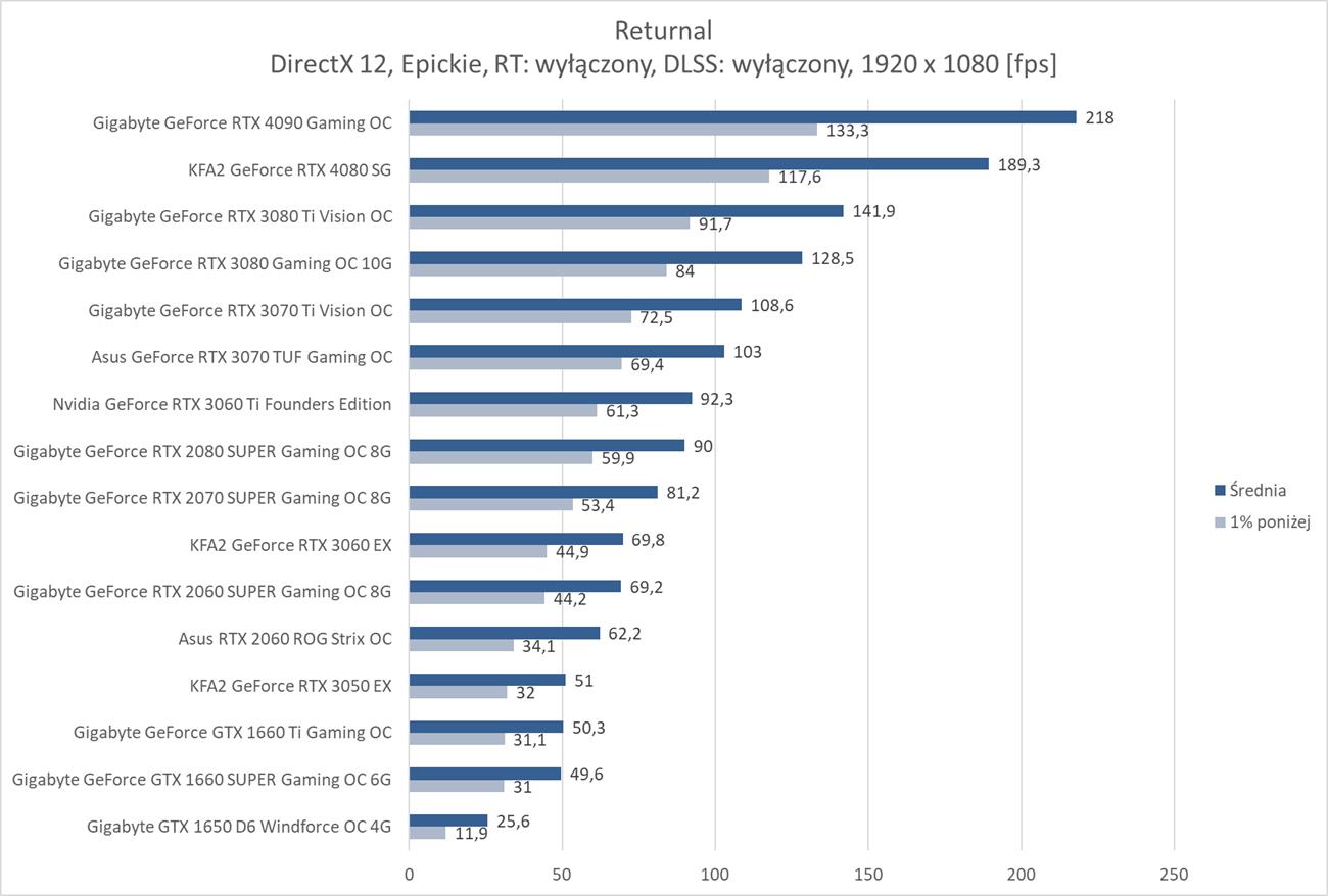 Wyniki są więc świetne i aż chciało by się, żeby więcej gier oferowało taką wydajność na różnych kartach graficznych. Returnal jest więc miłą odmianą po Hogwarts Legacy, gdzie mieliśmy do czynienia z naprawdę sporymi wymaganiami sprzętowymi.