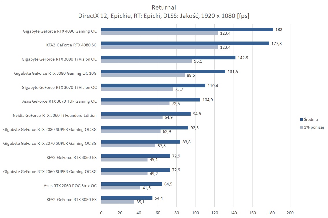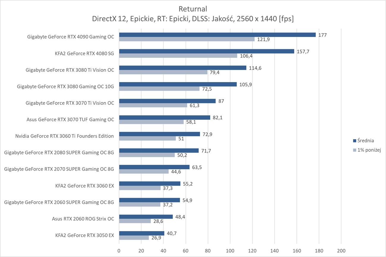 Testy wykonaliśmy przy wybranych ustawieniach Epickich. Returnal wspiera też ray tracing dla cieni i odbić, co również zostało przez nas sprawdzone przy ustawieniach Epickich. Nie zabrakło również DLSS (testowaliśmy w trybie Jakość), ale nie ma tutaj DLSS 3.0 więc nie ma możliwości odpalenia generatora klatek. Testy wykonaliśmy przy wykorzystaniu wbudowanego benchmarka, ale wyniki ściągaliśmy z zewnętrznego programu. Benchmark wyrzuca minimalną ilość klatek, która jest gorszym parametrem niż 1% poniżej. Gra działa na API DirectX 12, a wykorzystane przez nas sterowniki to Game Ready 528.49. Na wykresach znajdziecie karty, które w danej konfiguracji uzyskały średnio powyżej lub blisko 20 fps. Testy wykonaliśmy trzy razy lub do uzyskania powtarzalności.