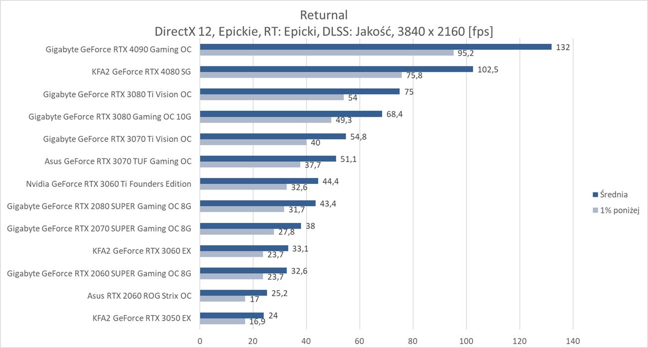 Returnal to gra świetnie przygotowana pod PC. Wymagania nie są wysokie, nawet po włączeniu ray tracingu w najwyższych opcjach. Po kilku tytułach, w których nawet RTX 4090 po włączeniu RT bez DLSS w 3840 x 2160 nie zapewniał średnio 60 fps mamy miłą odmianę. W najwyżej rozdzielczości po włączeniu DLSS jakość już RTX 3080 gwarantuje średnio 60 fps, a 30 fps to nawet RTX 2060 SUPER. Do płynnej rozgrywki w rasteryzacji w 1920 x 1080 wystarczy nawet GTX 1660 SUPER, który osiąga 1% poniżej lekko powyżej 30 fps. Przy takich ustawieniach średnio 60 fps zapewnia też już RTX 2060.