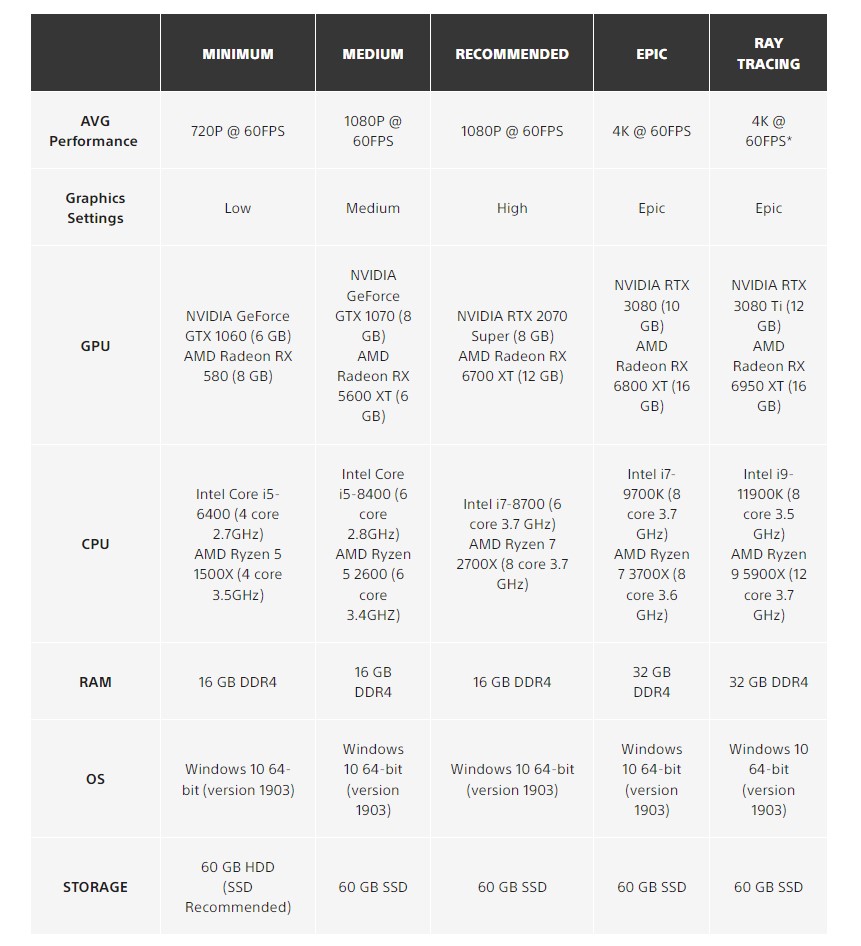 Minimalne wymagania zalecane do gry 720p w 60 fps są naprawdę niskie. GTX 1060 czy RX 580 nie są nowymi czy wydajnymi kartami, podobnie jak procesor i5-6400 czy Ryzen 5 1400X. Mamy też zalecane 16 GB RAM oraz 60 GB miejsca na dysku.