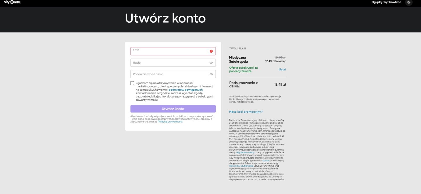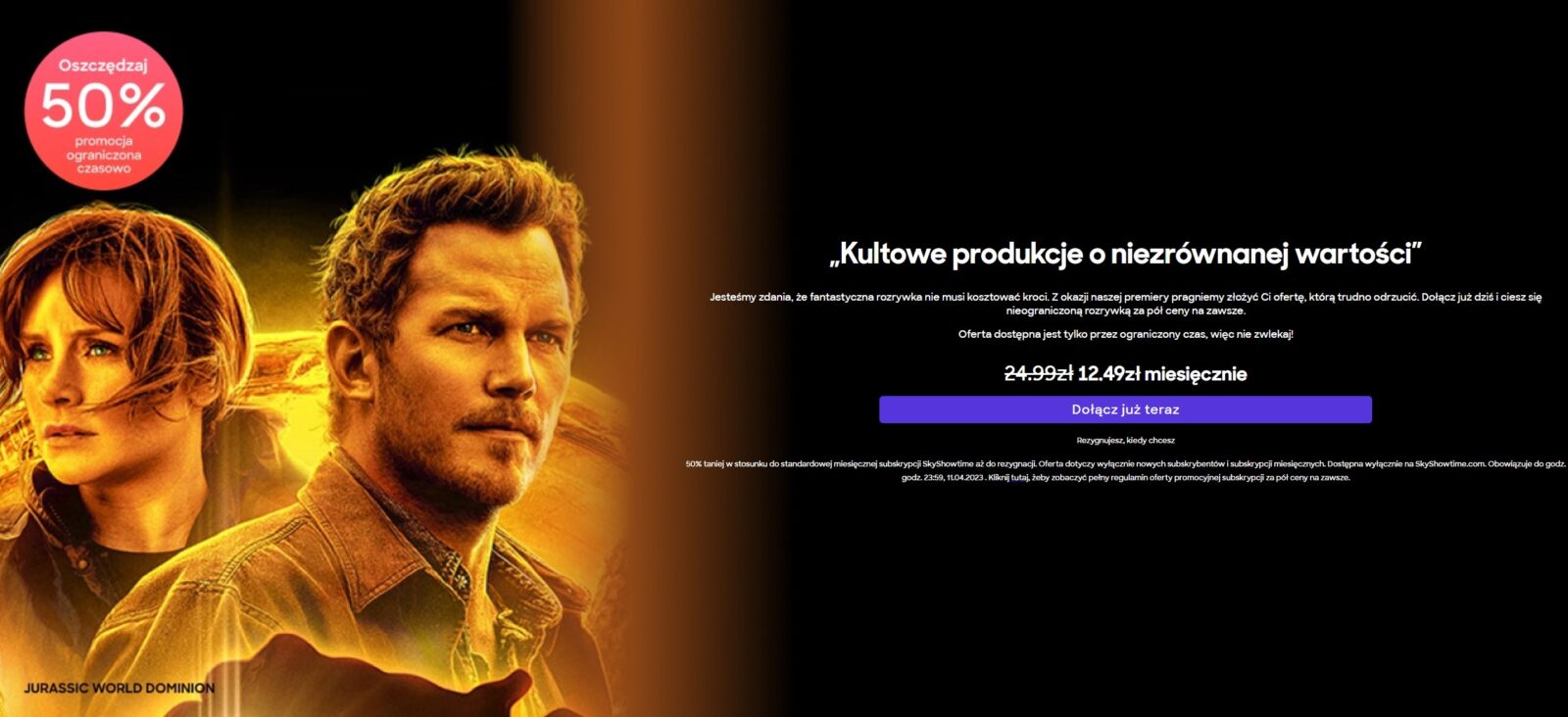 Już na samym wstępie SkyShowtime wita nas promocją „Pół ceny na zawsze”