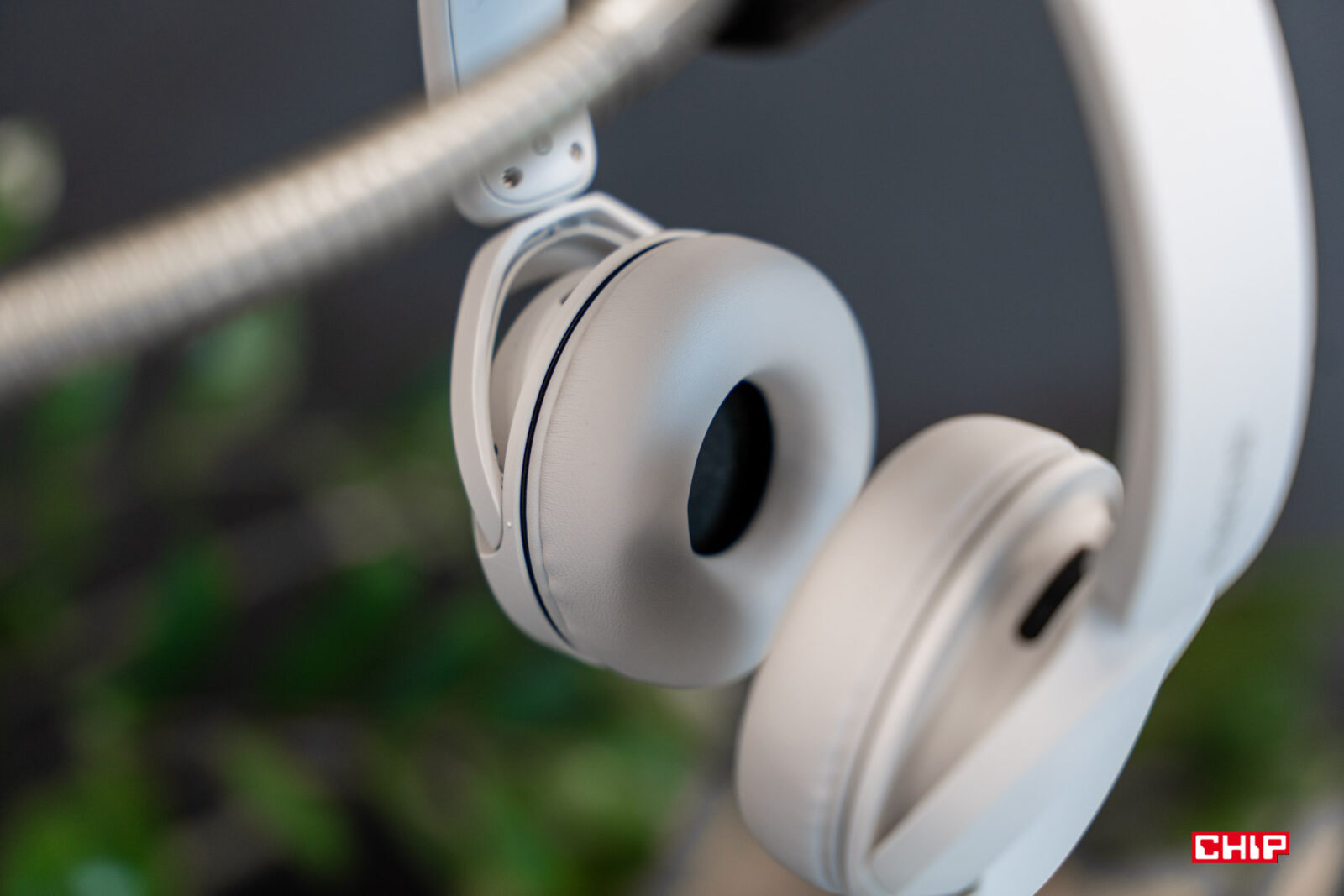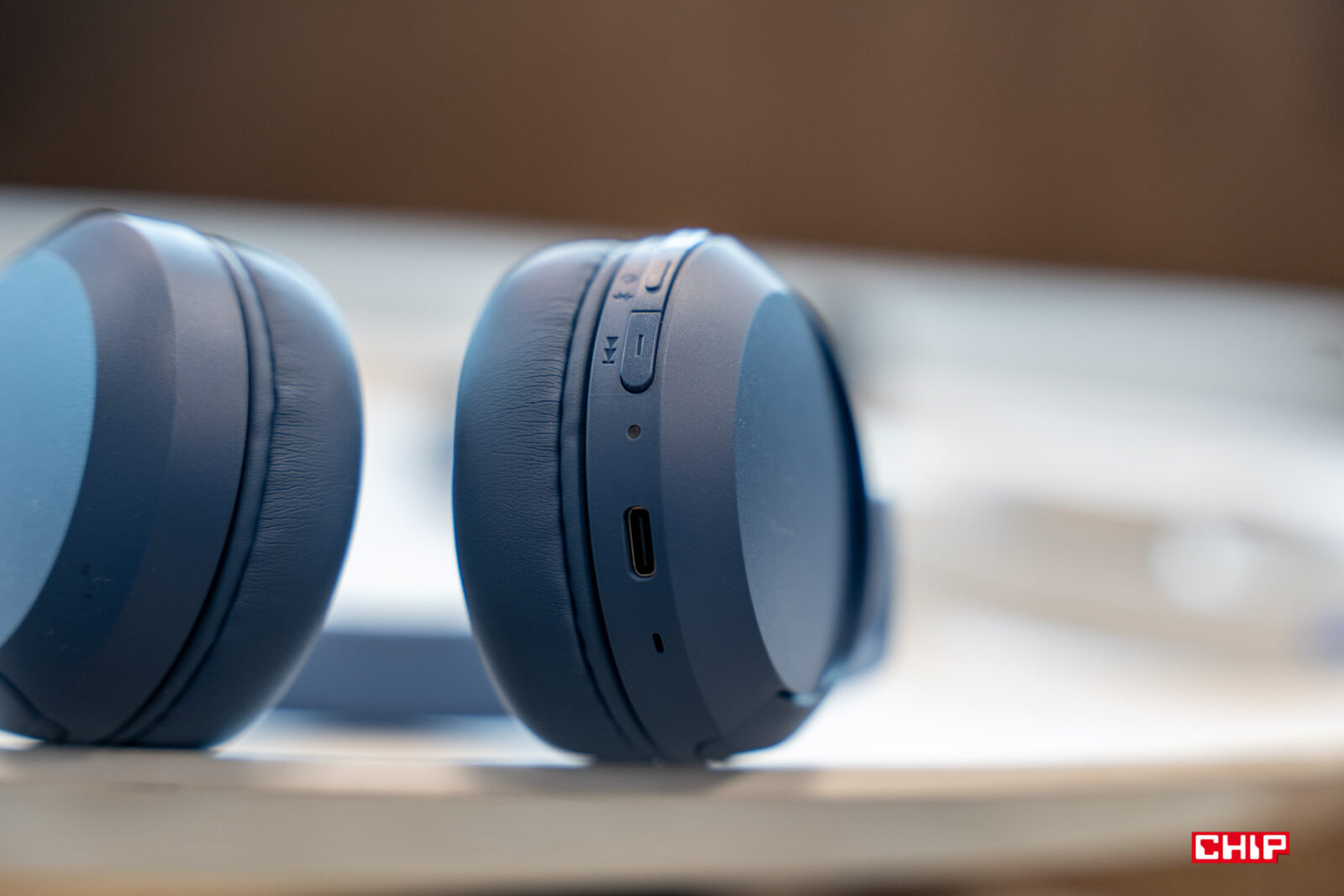 Jeśli już o USB-C mowa, dedykowany wyłącznie funkcji ładowania port znalazł się na dole prawej muszli, a tuż obok niego Sony umieściło diodę funkcyjną oraz zestaw trzech przycisków. Z początku rozróżnienie ich “na ślepo” może być trudne, bo jedynym wyczuwalnym pod moim opuszkiem palców wytłoczeniem była kropeczka na trzecim z kolei przycisku, który odpowiadał za zwiększanie poziomu głośności lub przewijanie playlisty. Trochę czasu zajęło mi więc przyzwyczajenie się do tego, aby bez patrzenia nie klikać bezsensownie w nie te przyciski, które chciałem (ściszania/cofania i włączania/wyłączania słuchawek).