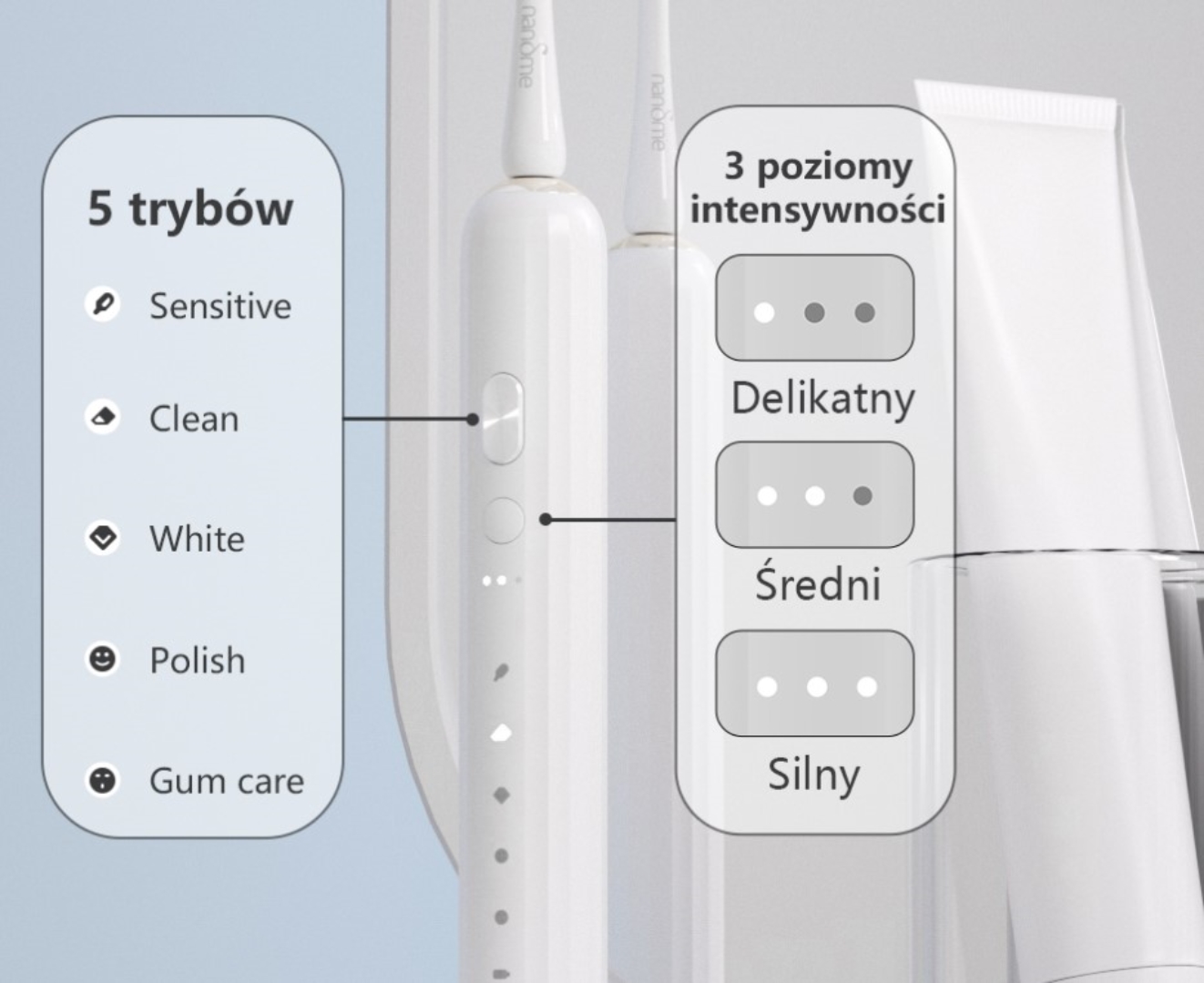 Nandme zadbało o wprowadzenie do NX7000 aż 15 trybów pracy, bo pięć różnych efektów o trójstopniowym natężeniu (niskie, średnie, najwyższe). Z tą szczoteczką soniczną można więc porządnie wyszorować zęby w trybie czyszczenia o najwyższej sile przed snem, zadbać o ich biel o poranku i odświeżyć jamę ustną popołudniowym masażem lub polerowaniem. Czy trzeba czegoś więcej? Wcale nie, ale Nandme przygotowało dla nas coś jeszcze.