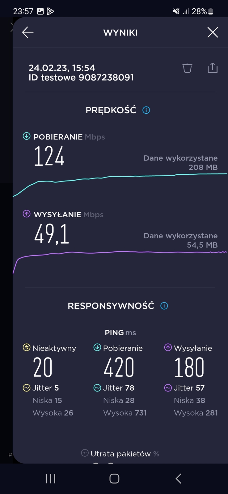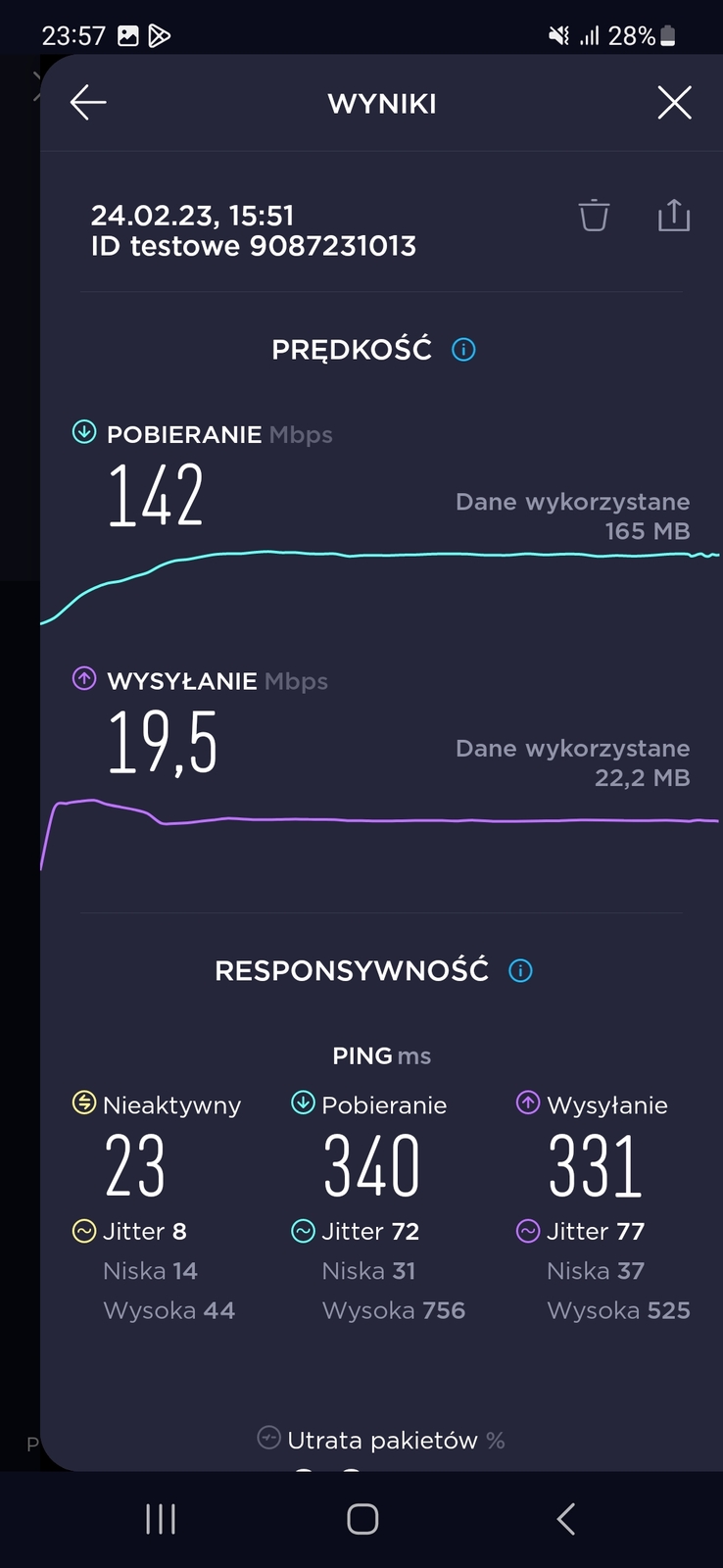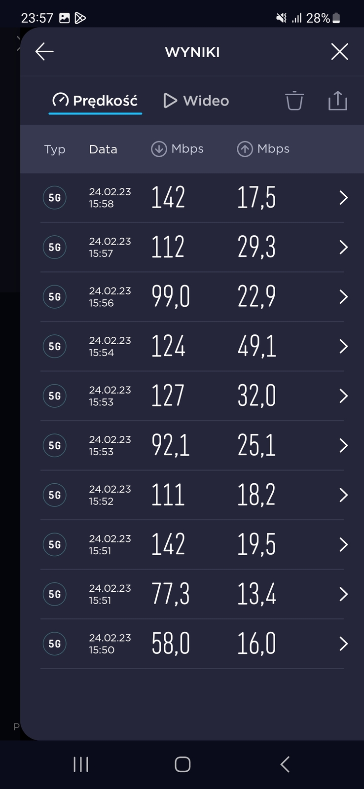 W temacie wyposażenia oczywiście jest „na bogato”, ale nie mogło być inaczej – w końcu to przedstawiciel flagowej linii Samsunga. Mamy więc obsługę sieci 5G i to naprawdę na dobrym poziomie. Pod Warszawą, praktycznie na granicy zasięgu sieci 5G (wg. mapy Orange), w 10 próbach w programie Speedtest, uzyskałem maksymalnie 142 Mb/s (pobieranie) i 49,1 Mb/s (wysyłanie danych). Wynik rewelacja, biorąc pod uwagę, że test odbył się na granicy zasięgu, a nie w dużym mieście. Oczywiście możemy skorzystać również z Wi-Fi w najnowszym standardzie 6e.