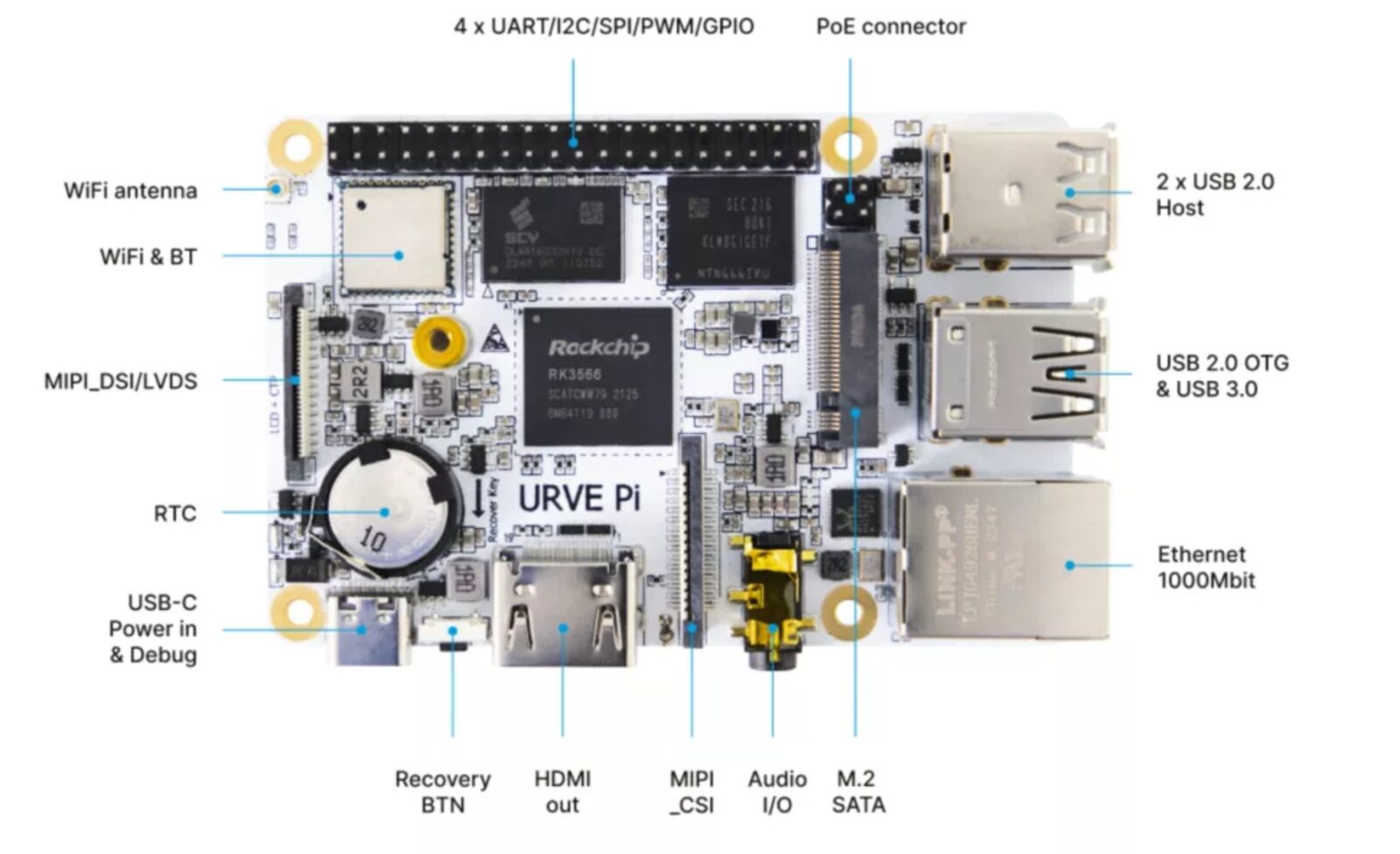 Poza portami USB, Urve Board Pi zapewnia też pełnowymiarowy port HDMI 2.0, który może wysłać obraz o jakości do 4K w 60 FPS, gigabitowy port Ethernet i 3,5 mm jack. Nie zabrało też wbudowanej 8-gigabajtowej pamięci eMMC, złącza kamery MIPI CSI, wyświetlacza MIPI DSI oraz 40-pinowego GPIO, podczas gdy pozostałe elementy uzupełnia wsparcie Wi-Fi, Bluetooth oraz pojedyncze gniazdo dla akumulatora.