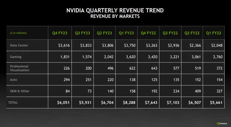 Na tak wysoki przychód miał wpływ przede wszystkim rynek związany ze sztuczną inteligencją, bo wraz ze wzrostem jej znaczenia, firmy zaczęły kupować układy Nvidii stworzone właśnie z myślą o obliczeniach związanych z SI. Większość tego typu procesorów graficznych wpadło pod kategorię centrów, gdzie przychody wzrosły o 11% w ujęciu rocznym (do 3,62 miliarda dolarów). Z drugiej strony kieszeni Nvidii nie rozpieścili gracze, bo ogólne przychody z rynku gier spadły, ale było to zgodnie z oczekiwaniami, bo w ostatnich latach sprzedaż była mocno podwyższona.