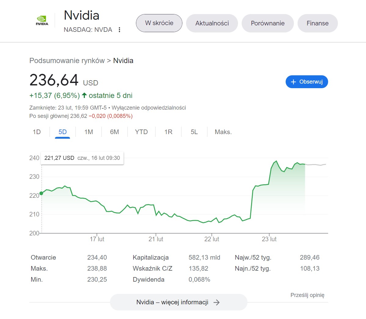 Wystarczyło rzucić okiem na cenę akcji Nvidii, żeby wiedzieć, że jej ujawnione właśnie wyniki finansowe za czwarty kwartał pozytywnie zaskoczyły inwestorów. Nagły wzrost o aż 30 dolarów za akcję jest związany bezpośrednio z przychodami, które odnotowała firma, bo w IV kwartale ubiegłego roku nie pomyliła się z szacunkami. Nvidia zakładała, że zarobi w tym okresie 6 miliardów dolarów wedle własnych szacunków i tyleż też zainkasowała (dokładnie 6,05 mld dol.).