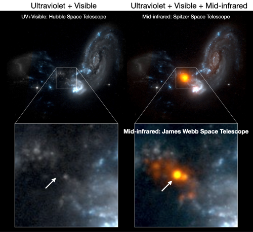 Łączące się galaktyki to zdarzenia o charakterze wielkoskalowym, choć lokalnie może dochodzić do niszczenia planet czy gwiazd. W większości przypadków emitowane jest jedynie światło podczerwone, poza zasięgiem ludzkiej percepcji. W 2010 r. ten sam zespół uczonych użył Kosmicznego Teleskopu Spitzera do zbadania mocy “silnika”, choć nie byli w stanie określić jego dokładnej lokalizacji. Aż do teraz.