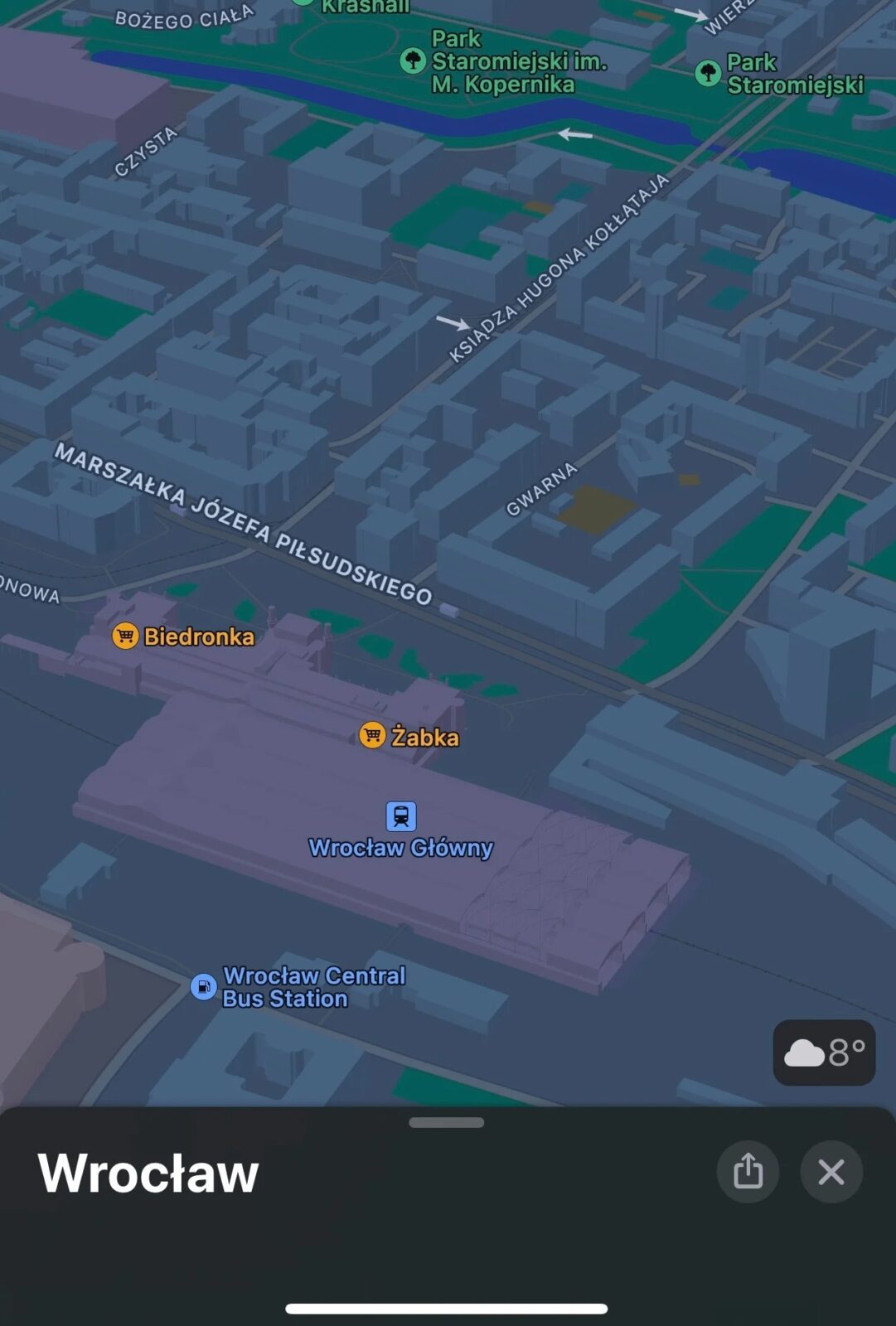 Jeśli nasze przypuszczenia są trafne, aktualizacja powinna obejmować również funkcję Rozejrzyj się, która zapewnia interaktywne obrazy 3D o wysokiej rozdzielczości na poziomie ulicy i płynne przejścia. W 2021 roku po ulicach całej Polski jeździły samochody Apple’a i mapowały dosłownie wszystko, co tylko mogły. Prawdopodobnie właśnie na potrzeby tej funkcji. Na to jednak nie ma potwierdzenia, a że dostęp do nowego interfejsu mają na razie nieliczni, ciężko to zweryfikować. Widać też, że jest to dopiero testowa wersja. Serio Apple, ulica Ksiądza Hugona Kołłątaja?