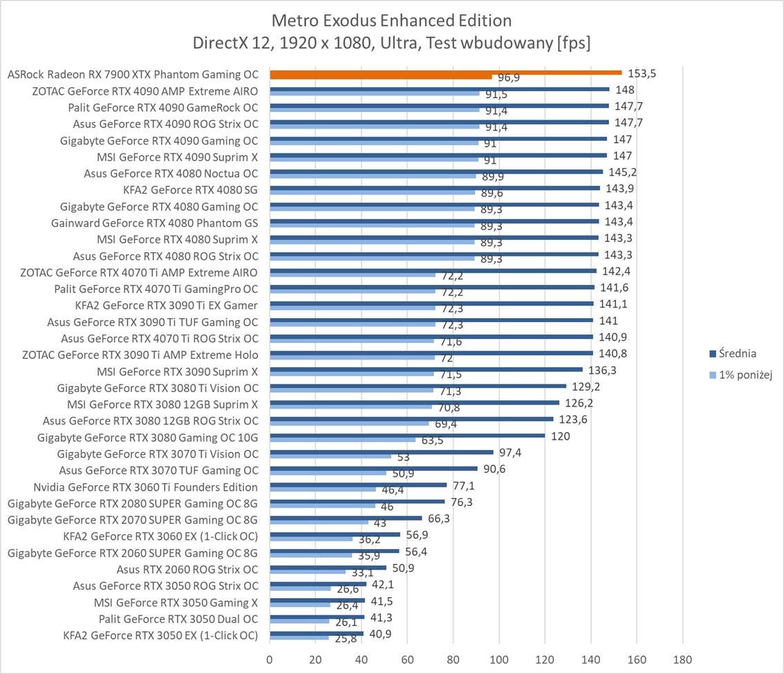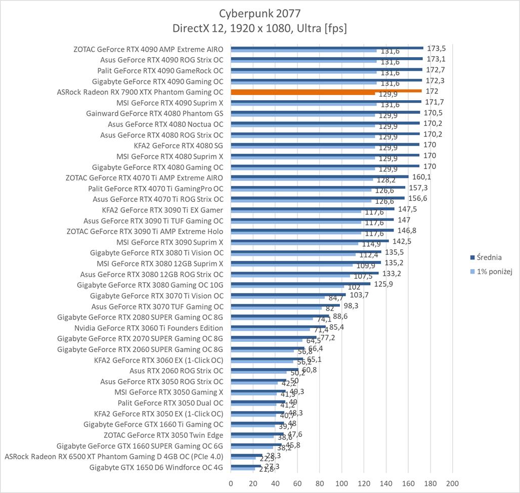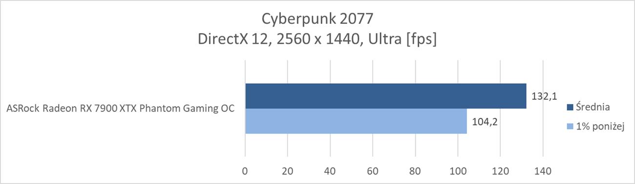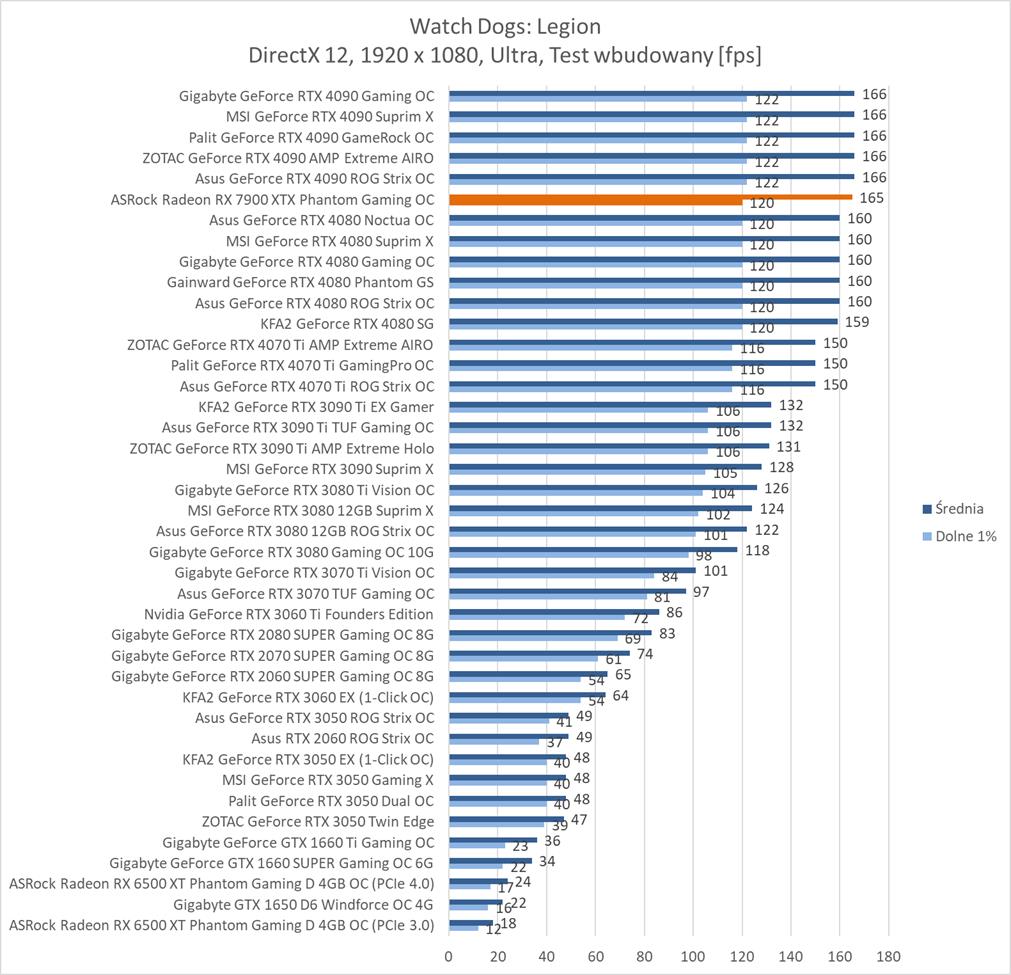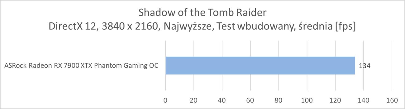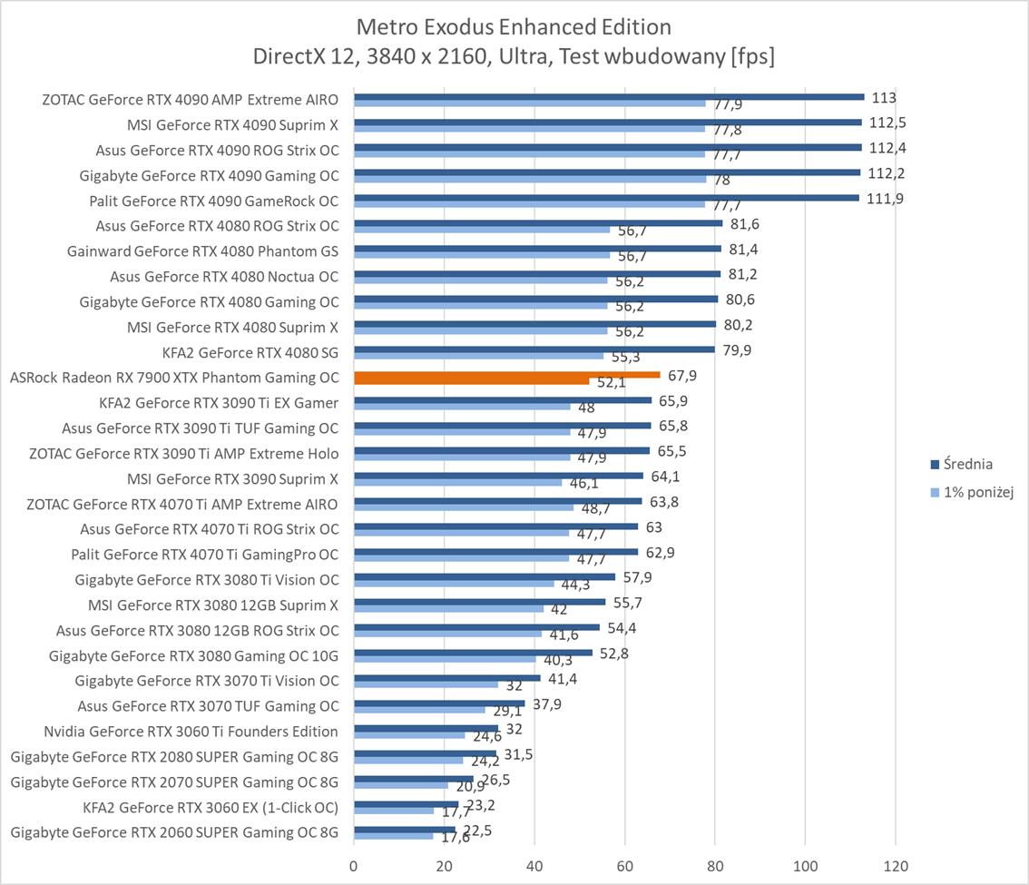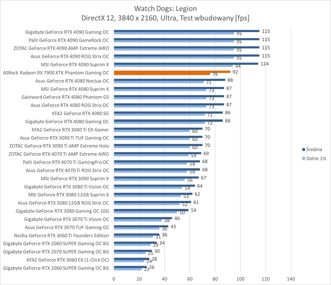 W rozdzielczościach 1920 x 1080 i 2560 x 1440 ASRock Radeon RX 7900 XTX Phantom Gaming OC wypada średnio blisko, ale trochę słabiej od RTX 4080. W 3840 x 2160 karta wygrywa z najsłabszym RTX 4080, ale jest słabsza od pozostałych. Wydajność jest więc bardzo dobra, choć też wiele zależy od samej gry. Warto też zwrócić uwagę na Metro (gra z RT), gdzie w wyższych rozdzielczościach grafika przegrywa mocniej z RTX 4080. Tak też będzie niestety we wszystkich grach z ray tracingiem.