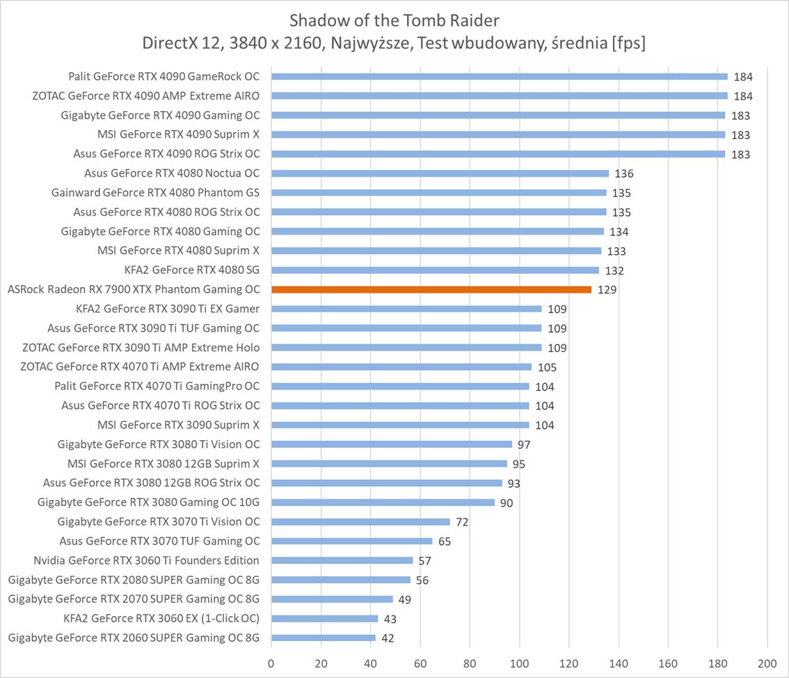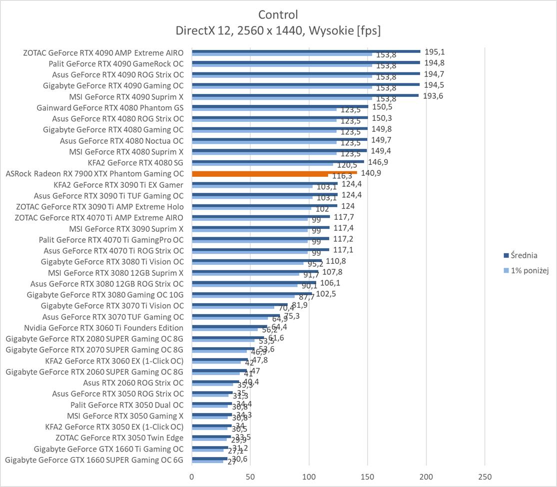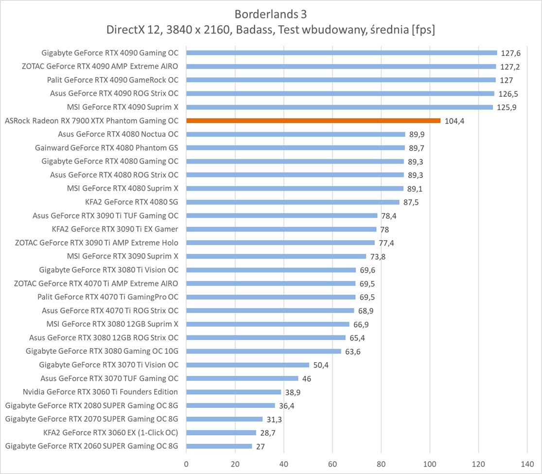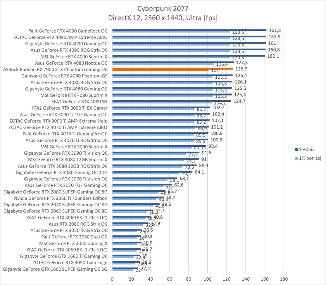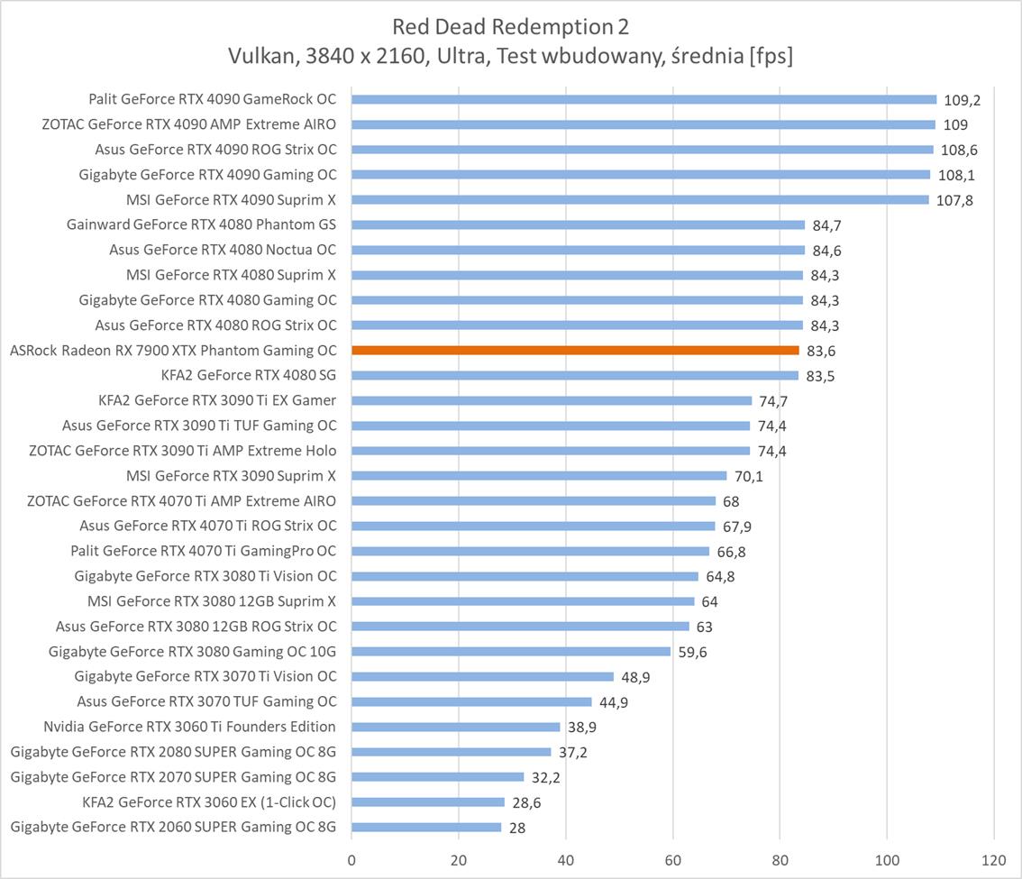 W rozdzielczościach 1920 x 1080 i 2560 x 1440 ASRock Radeon RX 7900 XTX Phantom Gaming OC wypada średnio blisko, ale trochę słabiej od RTX 4080. W 3840 x 2160 karta wygrywa z najsłabszym RTX 4080, ale jest słabsza od pozostałych. Wydajność jest więc bardzo dobra, choć też wiele zależy od samej gry. Warto też zwrócić uwagę na Metro (gra z RT), gdzie w wyższych rozdzielczościach grafika przegrywa mocniej z RTX 4080. Tak też będzie niestety we wszystkich grach z ray tracingiem.