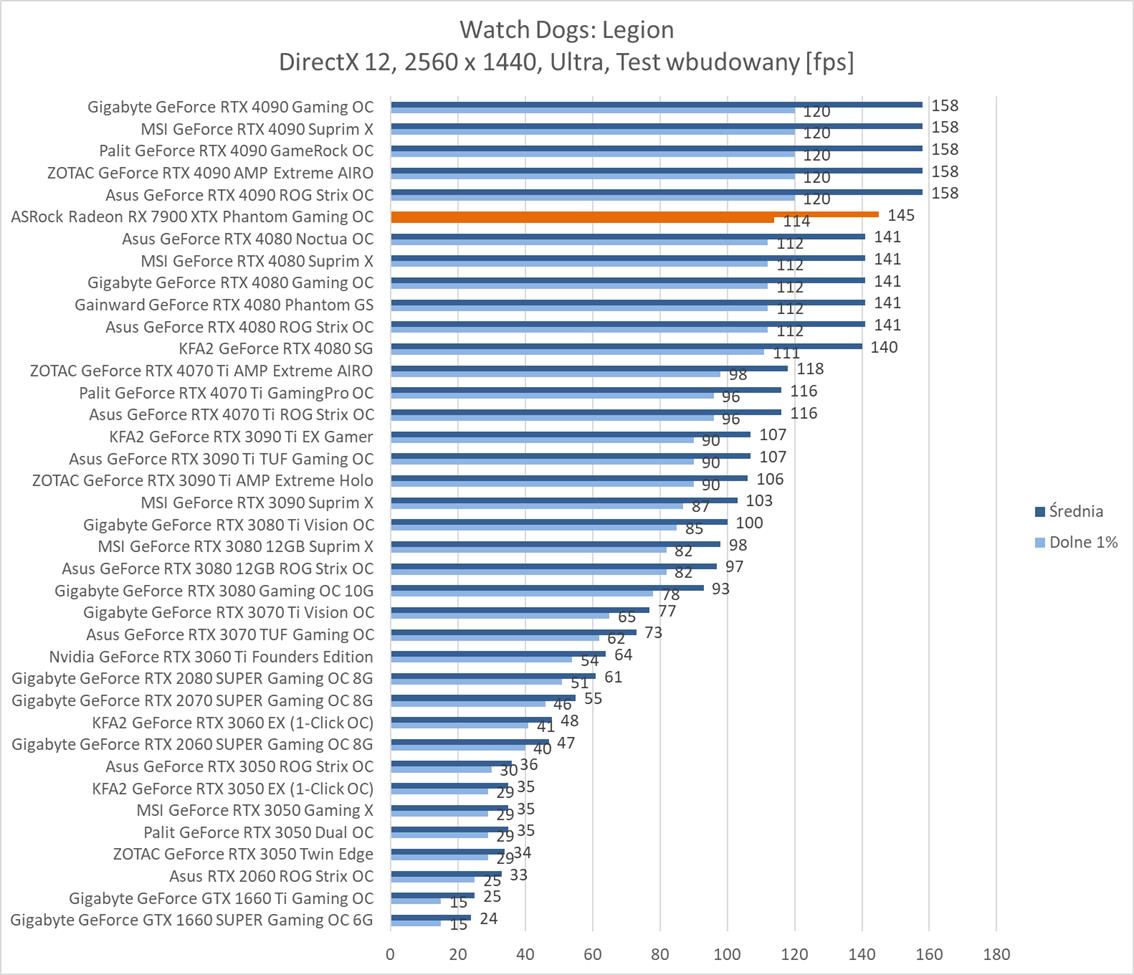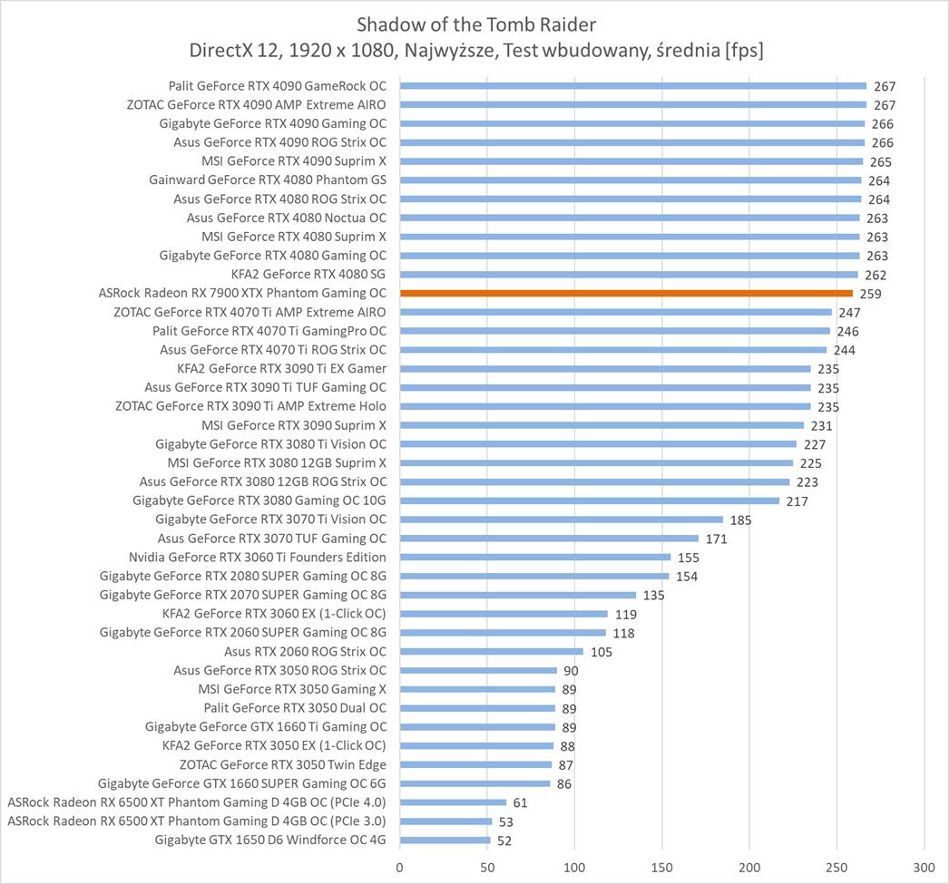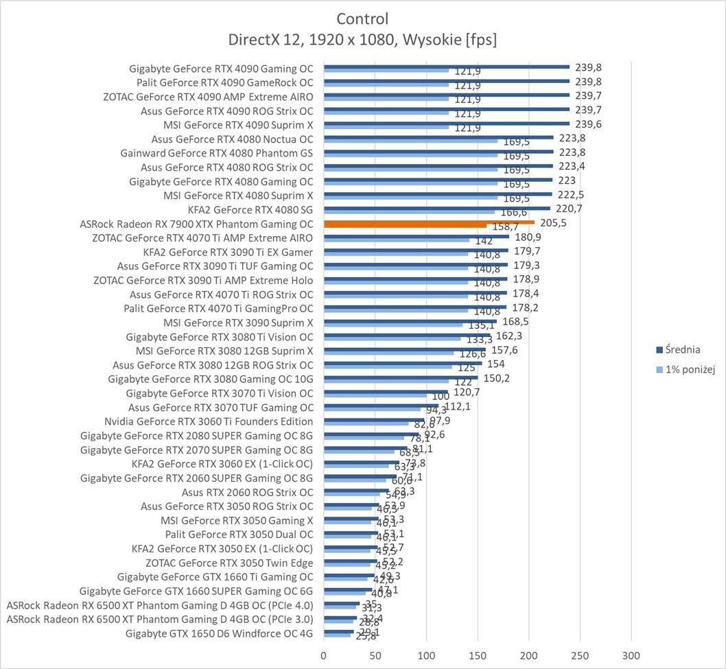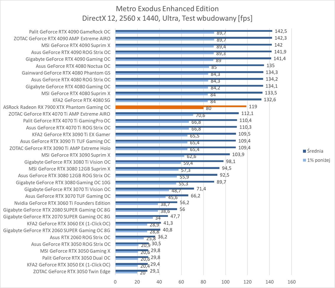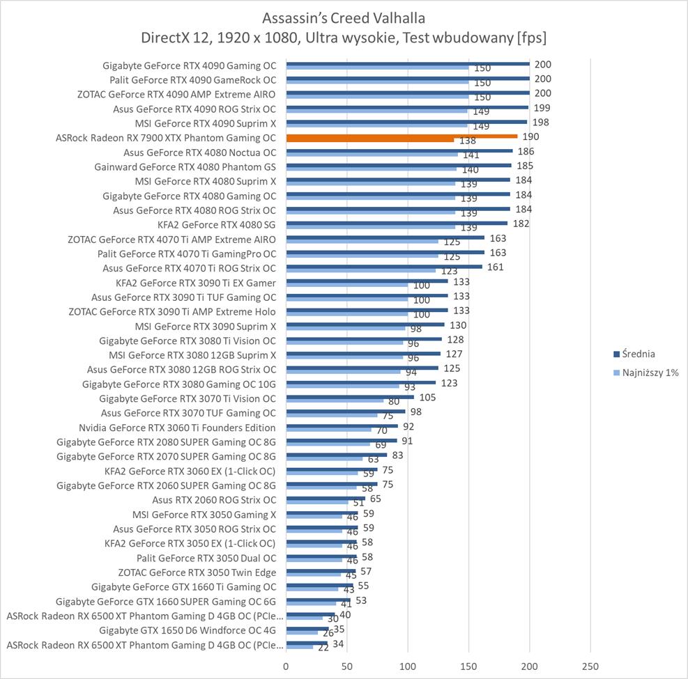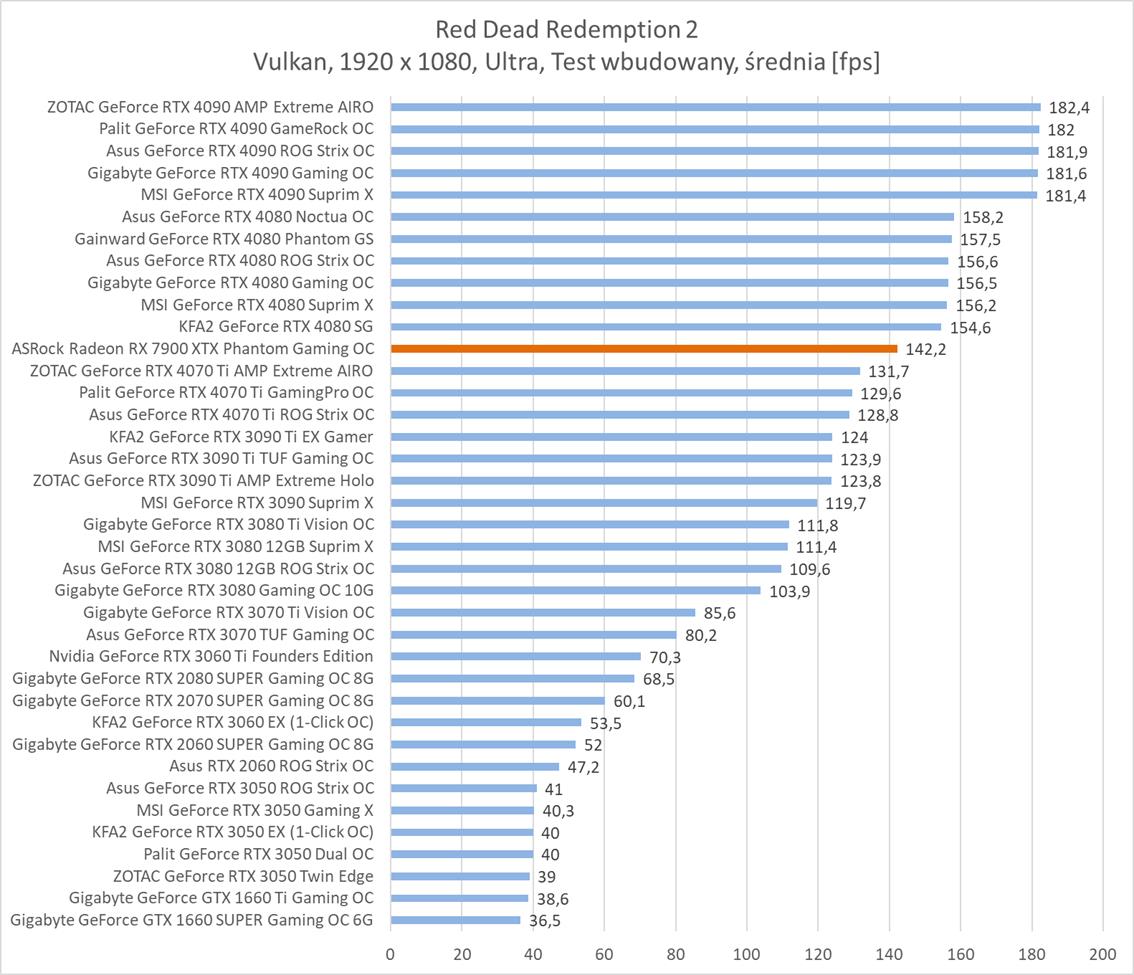 W rozdzielczościach 1920 x 1080 i 2560 x 1440 ASRock Radeon RX 7900 XTX Phantom Gaming OC wypada średnio blisko, ale trochę słabiej od RTX 4080. W 3840 x 2160 karta wygrywa z najsłabszym RTX 4080, ale jest słabsza od pozostałych. Wydajność jest więc bardzo dobra, choć też wiele zależy od samej gry. Warto też zwrócić uwagę na Metro (gra z RT), gdzie w wyższych rozdzielczościach grafika przegrywa mocniej z RTX 4080. Tak też będzie niestety we wszystkich grach z ray tracingiem.