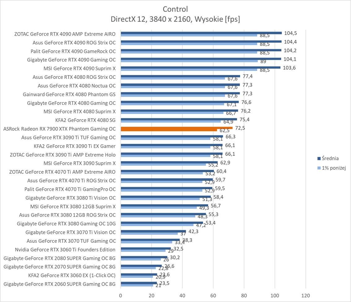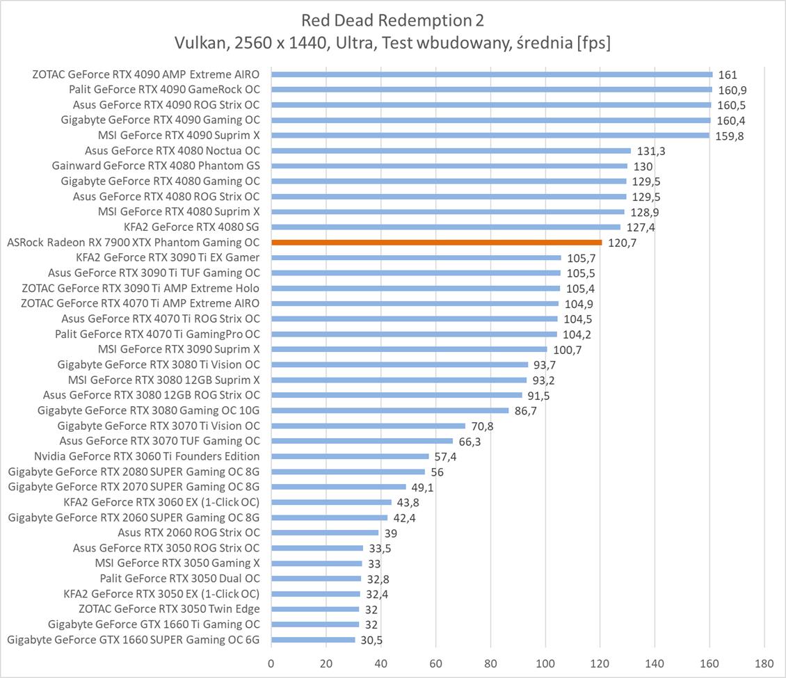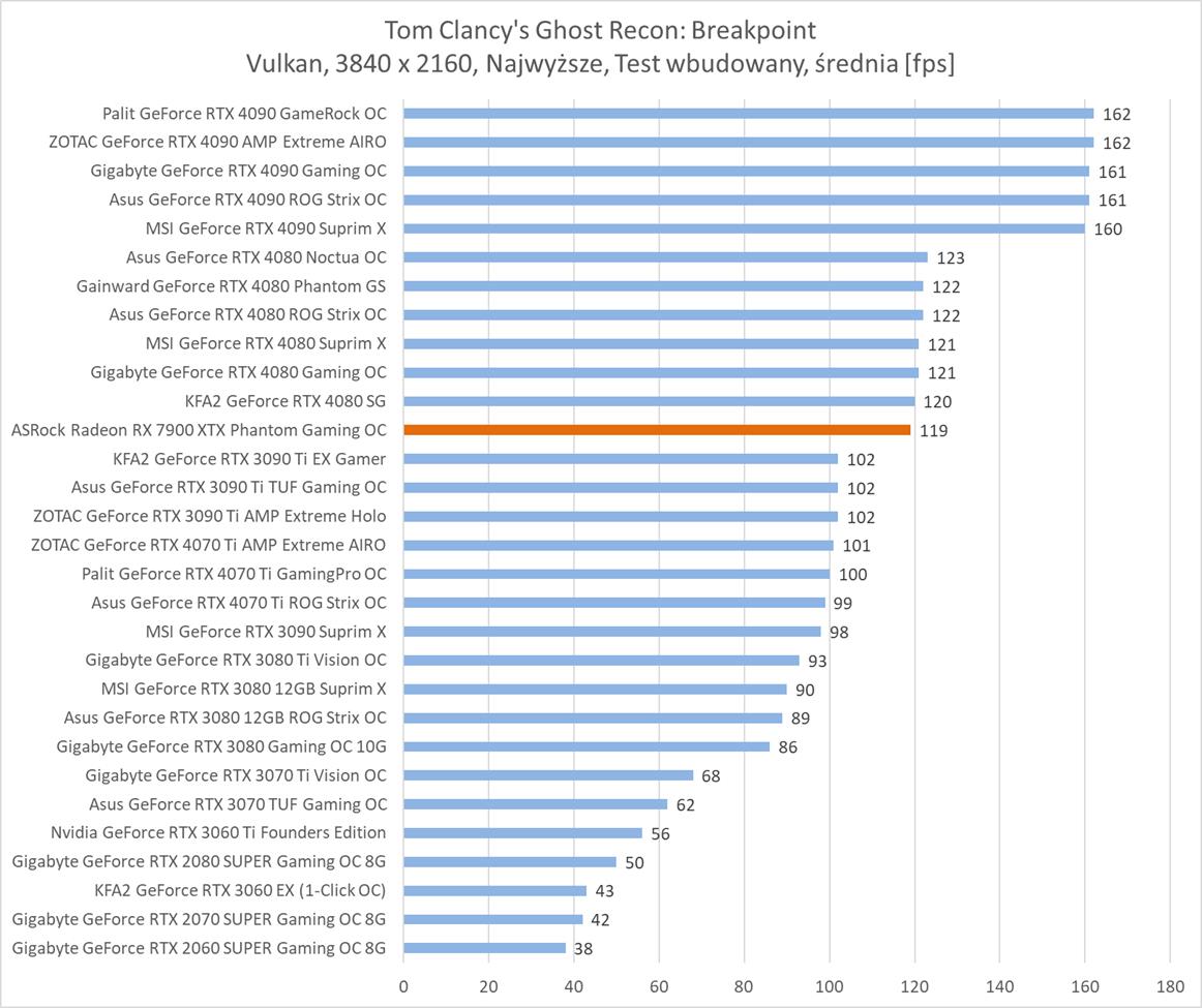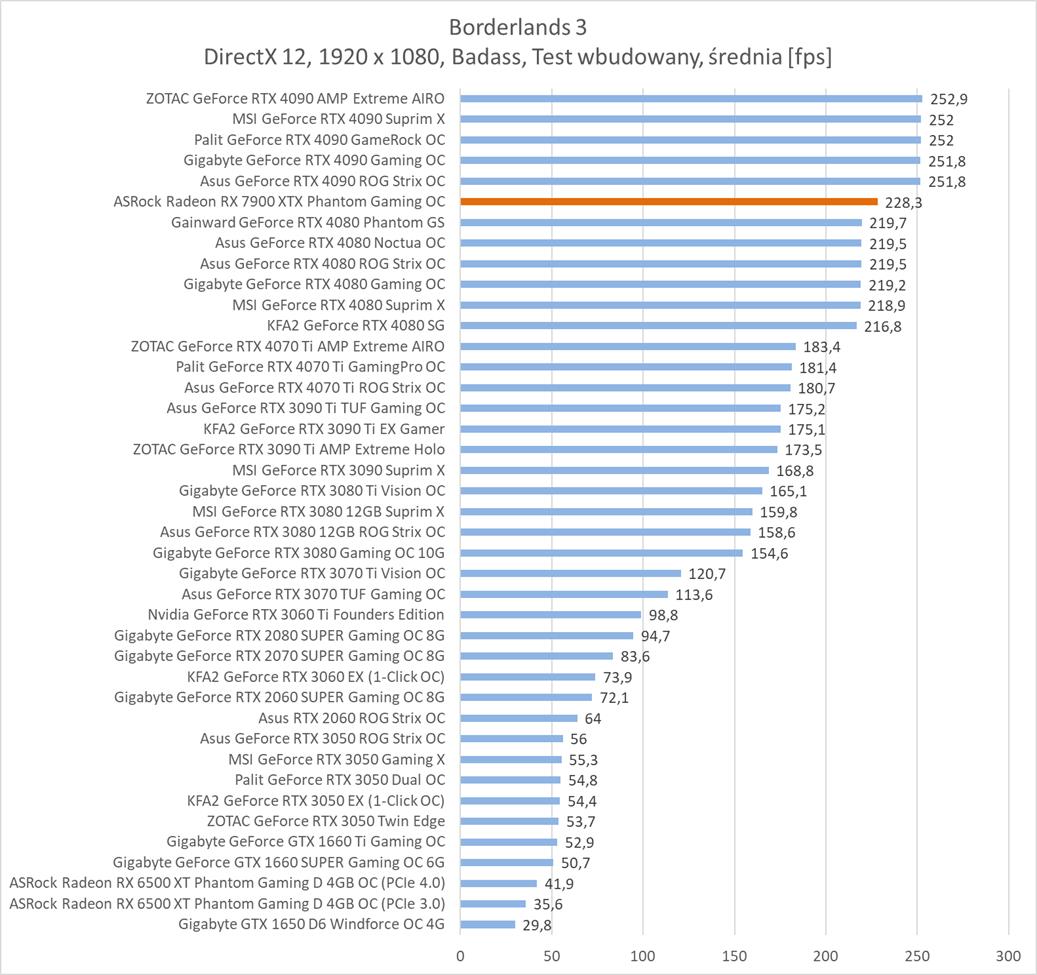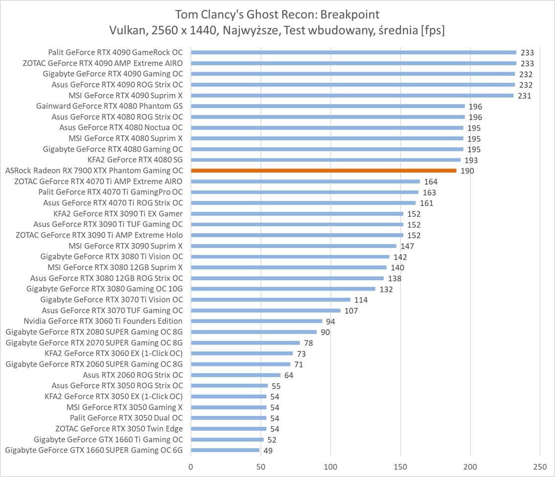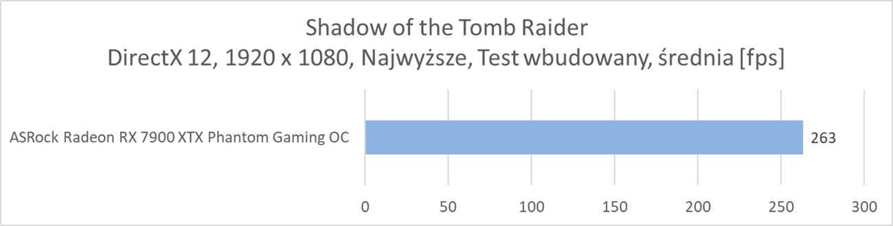 W rozdzielczościach 1920 x 1080 i 2560 x 1440 ASRock Radeon RX 7900 XTX Phantom Gaming OC wypada średnio blisko, ale trochę słabiej od RTX 4080. W 3840 x 2160 karta wygrywa z najsłabszym RTX 4080, ale jest słabsza od pozostałych. Wydajność jest więc bardzo dobra, choć też wiele zależy od samej gry. Warto też zwrócić uwagę na Metro (gra z RT), gdzie w wyższych rozdzielczościach grafika przegrywa mocniej z RTX 4080. Tak też będzie niestety we wszystkich grach z ray tracingiem.