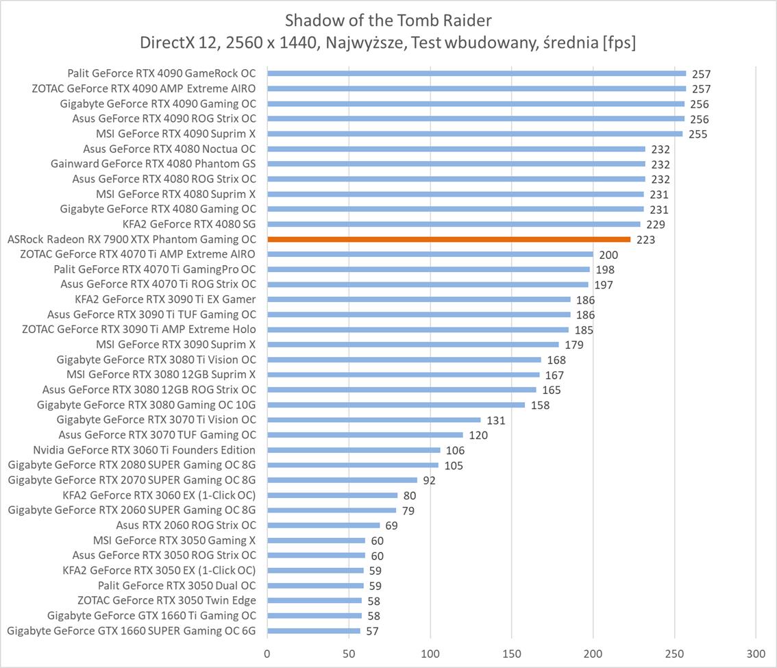 W kolejnej rozdzielczości nie ma zaskoczenia – we wszystkich grach możecie liczyć na średnio sporo ponad 60 fps. W większości gier karta wypada jednak słabiej niż RTX 4080.