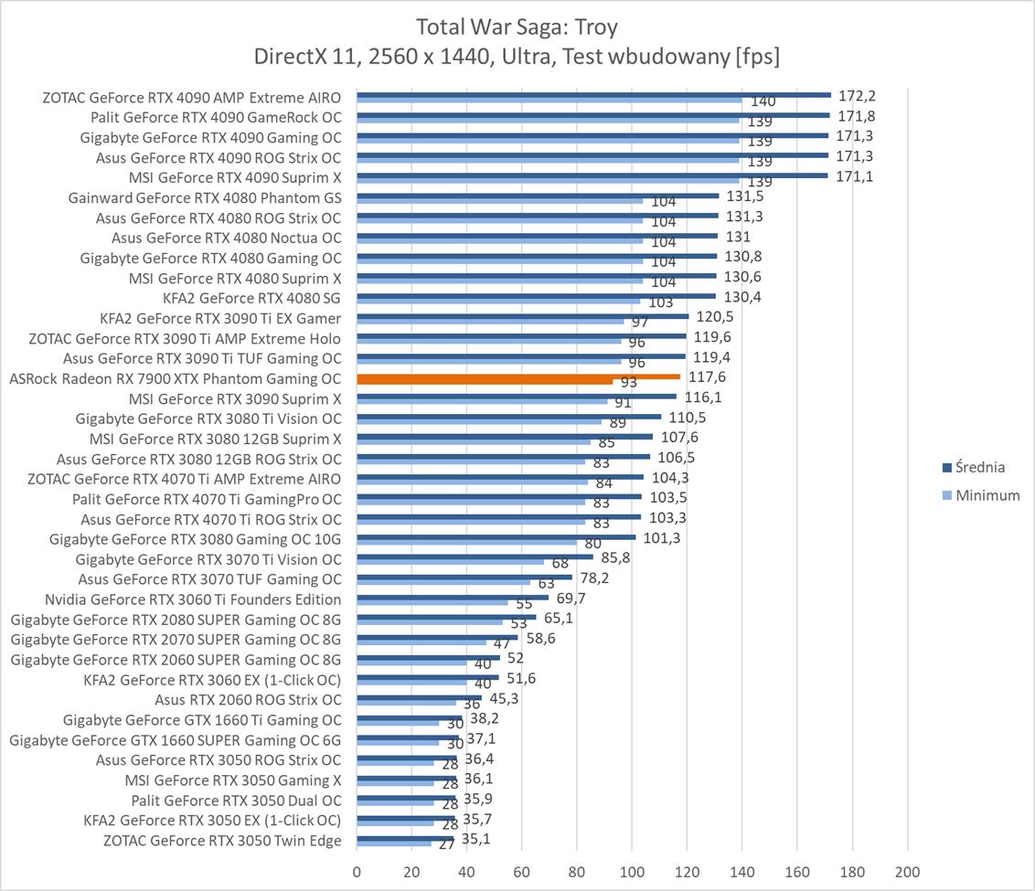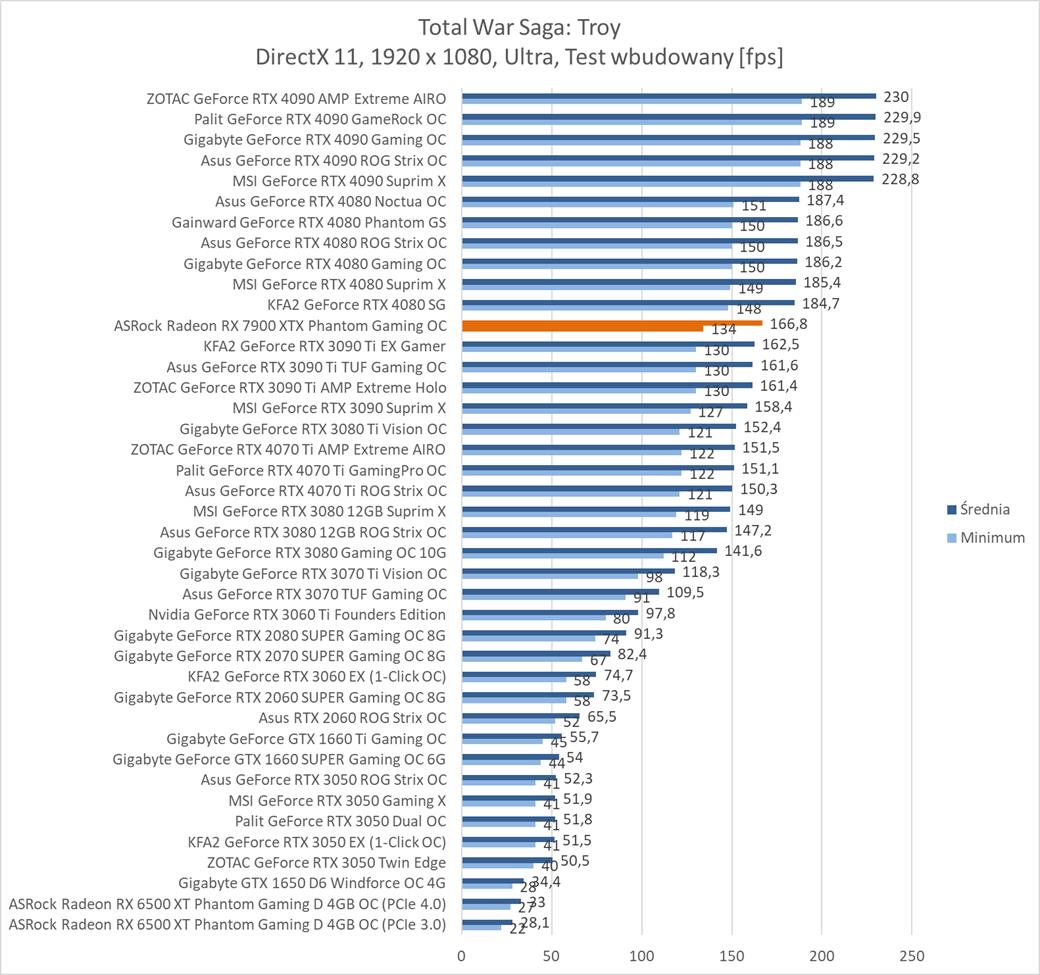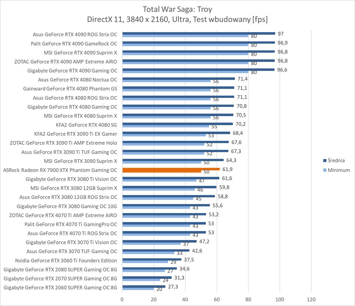 We wszystkich grach karta osiągnęła średnio powyżej 60 fps. Jednakże w takich tytułach jak Total War: Saga czy Cyberpunk 2077 ta liczba była tylko lekko większa niż wspomniana. Karta bez wątpienia jednak nadaje się do grania w 3840 x 2160.