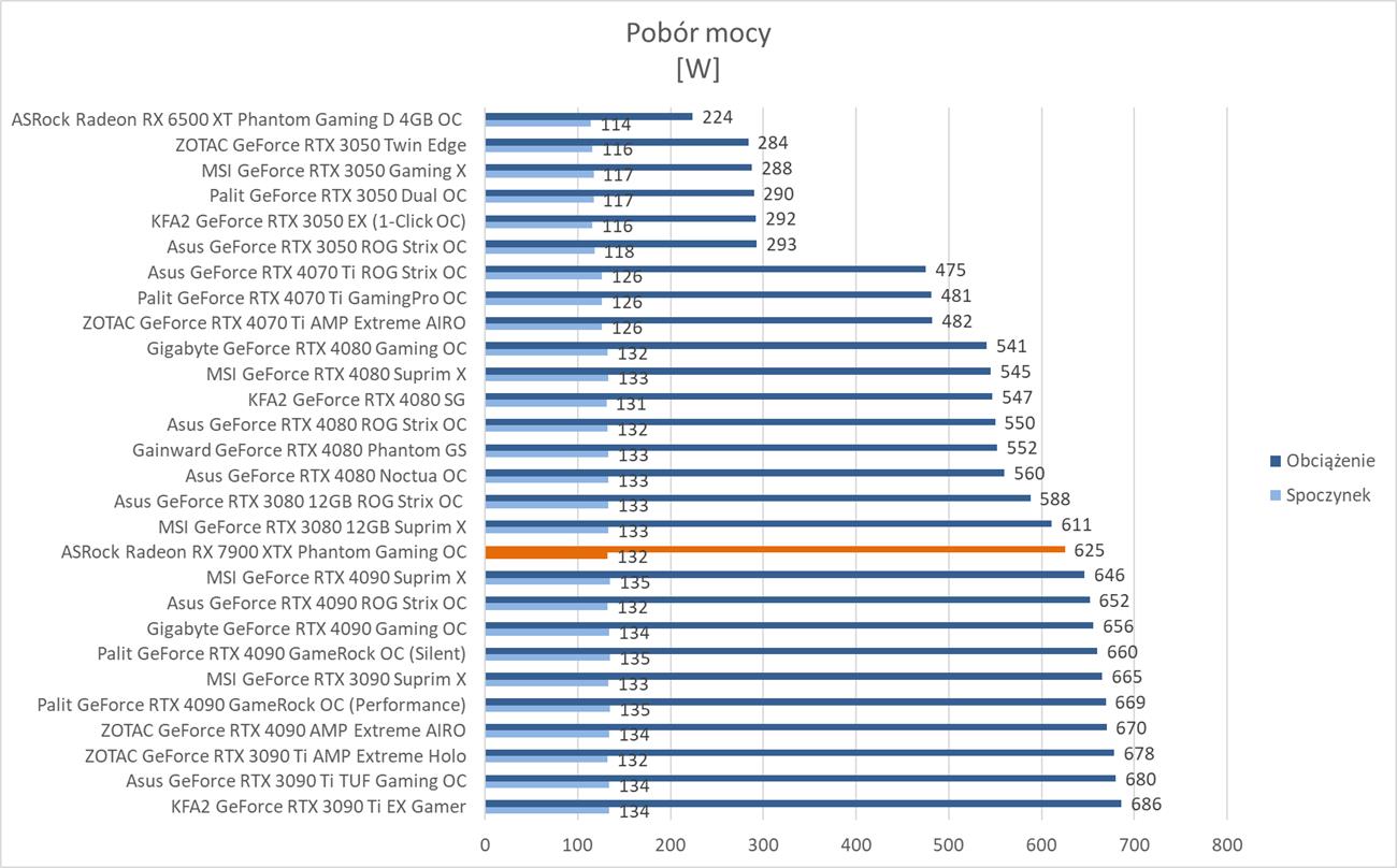 Pobór mocy jest wyższy niż w przypadku RTX 4080 – tutaj również mogło by być lepiej. Karcie jest wręcz bliżej do RTX 4090 pod tym względem. AMD zdecydowanie pod tym względem się nie popisało.