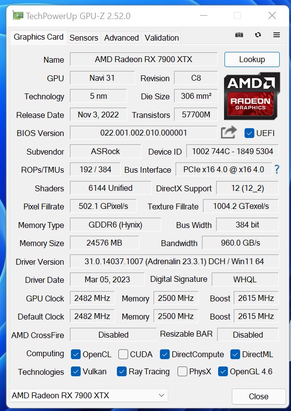 - Radeon RX 7900 XTX: Adrenalin 23.3.1