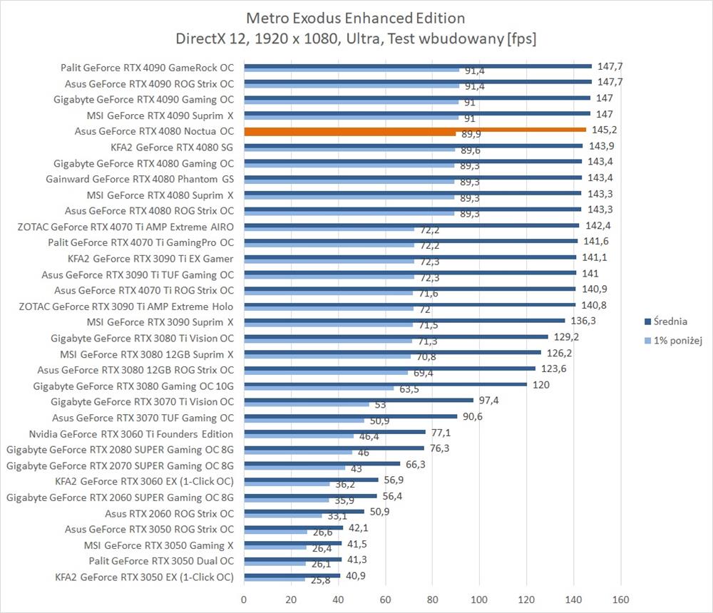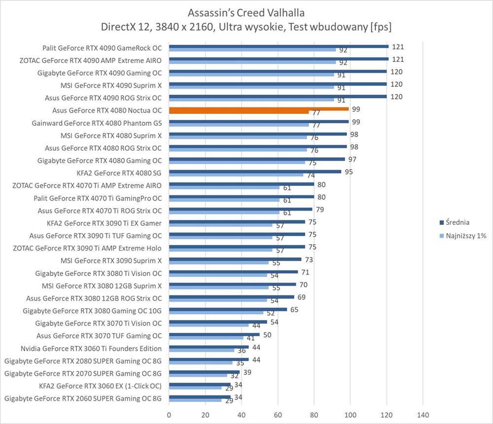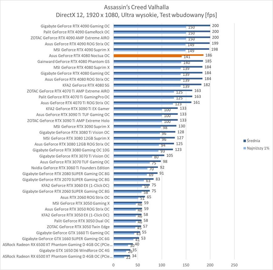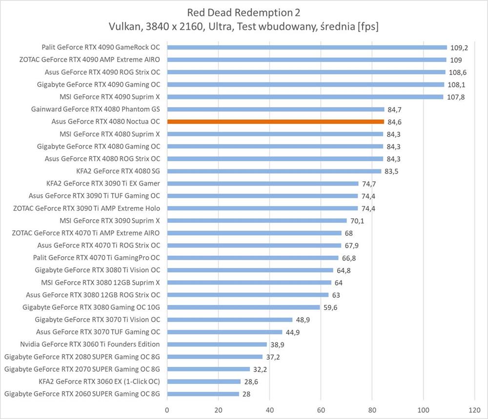 Asus GeForce RTX 4080 Noctua OC to najwydajniejszy RTX 4080 spośród wszystkich testowanych. Dotyczy to trzech rozdzielczości, gdzie karta po prostu pokonuje konkurencję i przegrywa tylko z RTX 4090. Wyniki są więc świetne i bez wątpienia możecie liczyć na znakomitą wydajność testowanego modelu.