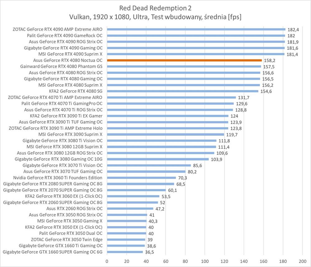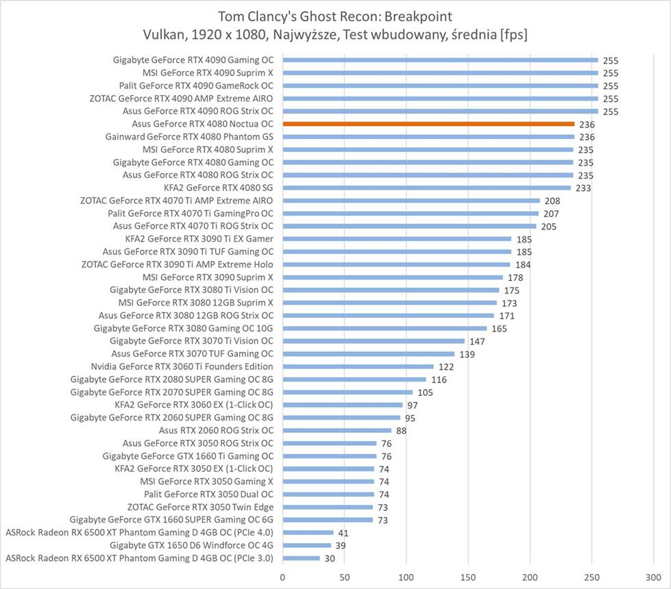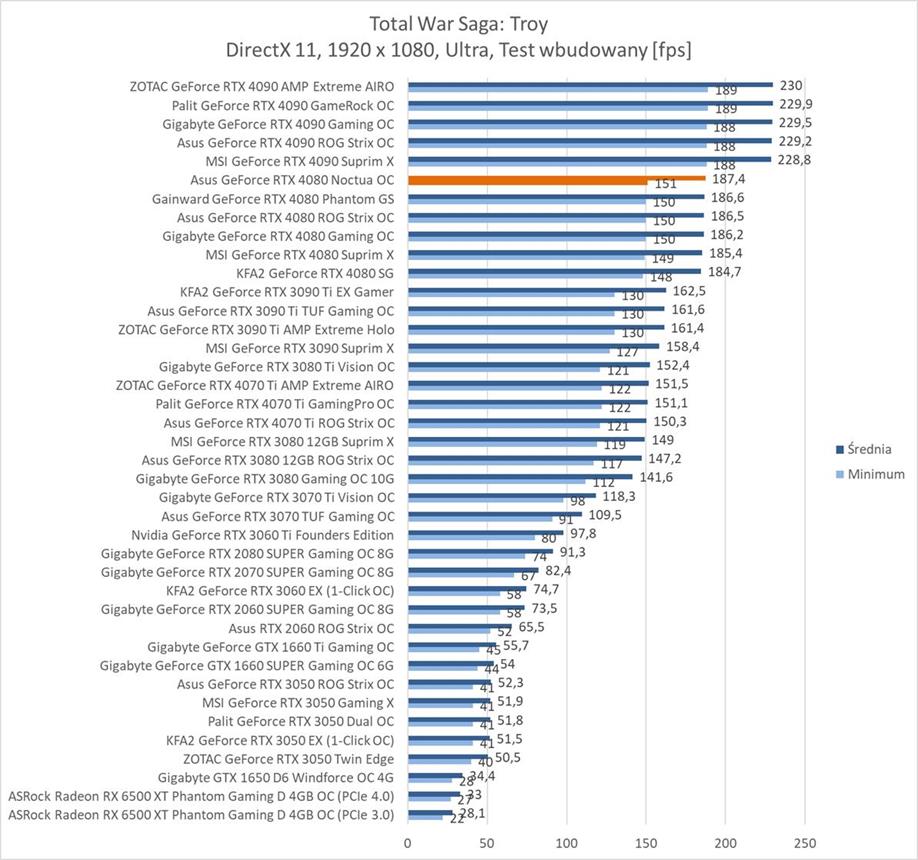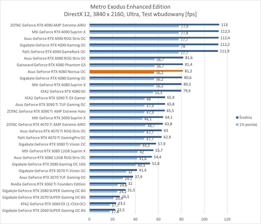 Asus GeForce RTX 4080 Noctua OC to najwydajniejszy RTX 4080 spośród wszystkich testowanych. Dotyczy to trzech rozdzielczości, gdzie karta po prostu pokonuje konkurencję i przegrywa tylko z RTX 4090. Wyniki są więc świetne i bez wątpienia możecie liczyć na znakomitą wydajność testowanego modelu.