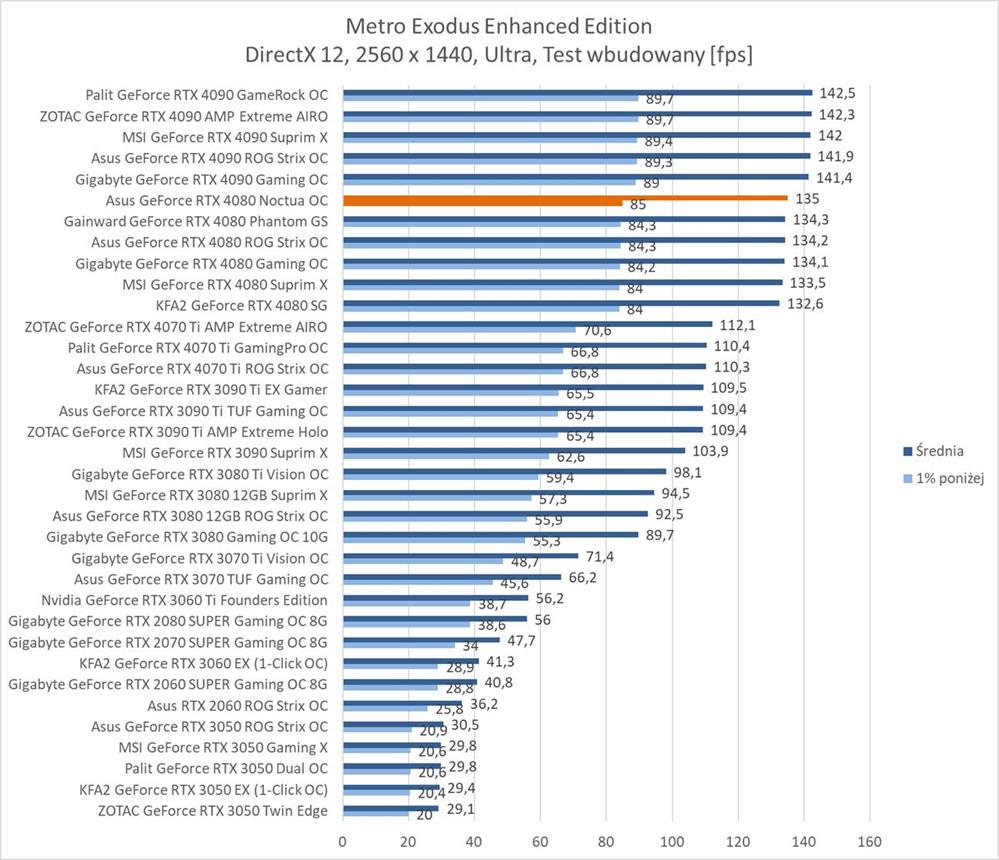 Asus GeForce RTX 4080 Noctua OC ma podwójny BIOS z fizycznym, wygodnym w użyciu przełącznikiem. Przy obu taktowanie boost jest takie samo i wynosi 2595 MHz. Natomiast w benchmarku Metro Exodus Enhanced Edition 2560 × 1440 px wynosiło ono średnio 2870 MHz. Jest to najwyższa wartość spośród wszystkich testowanych do tej pory RTX 4080.