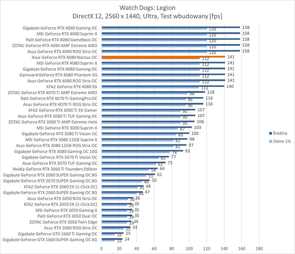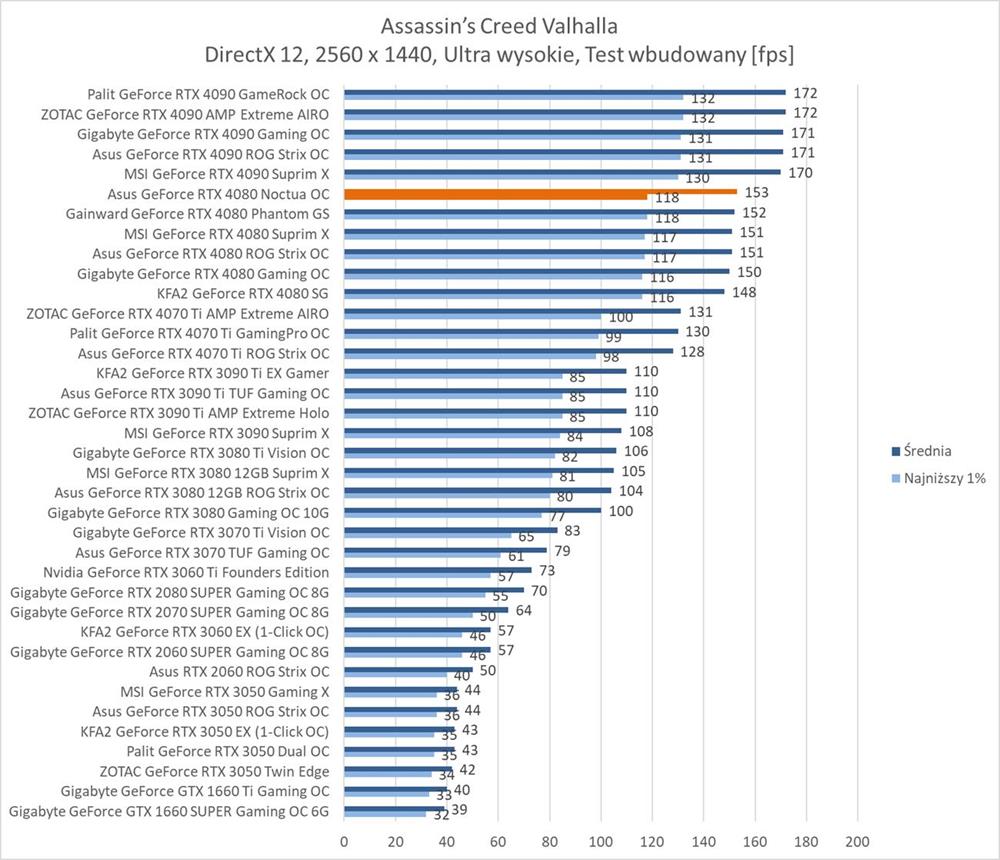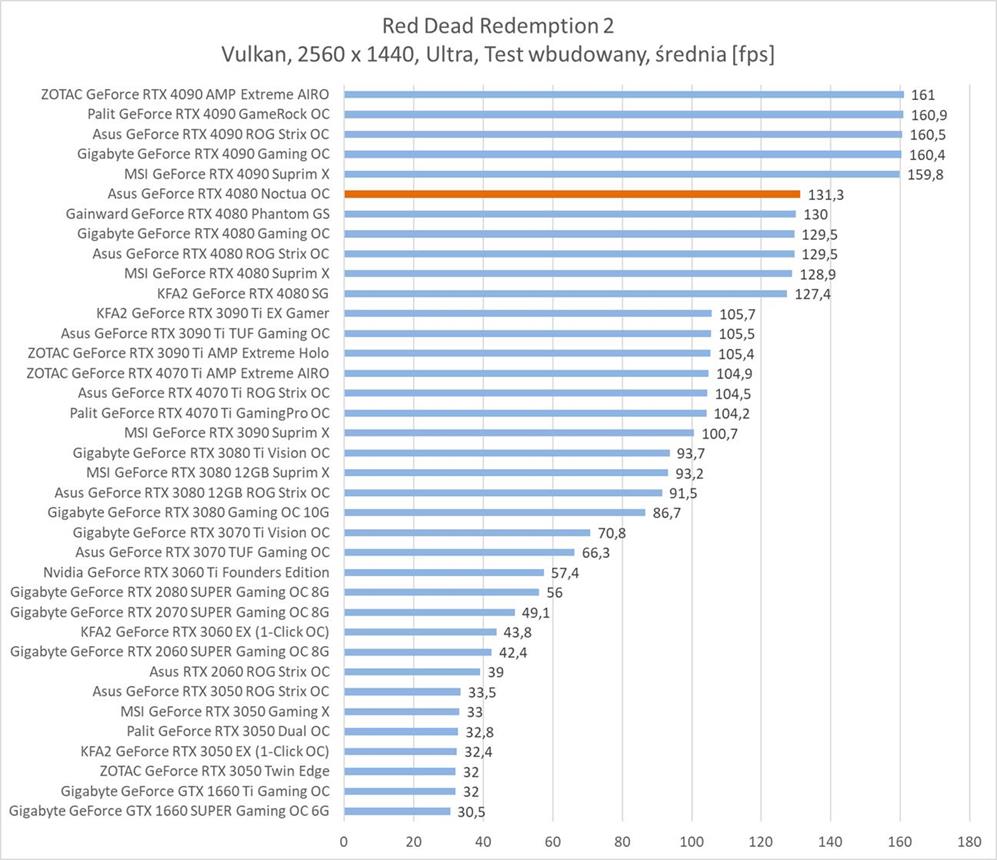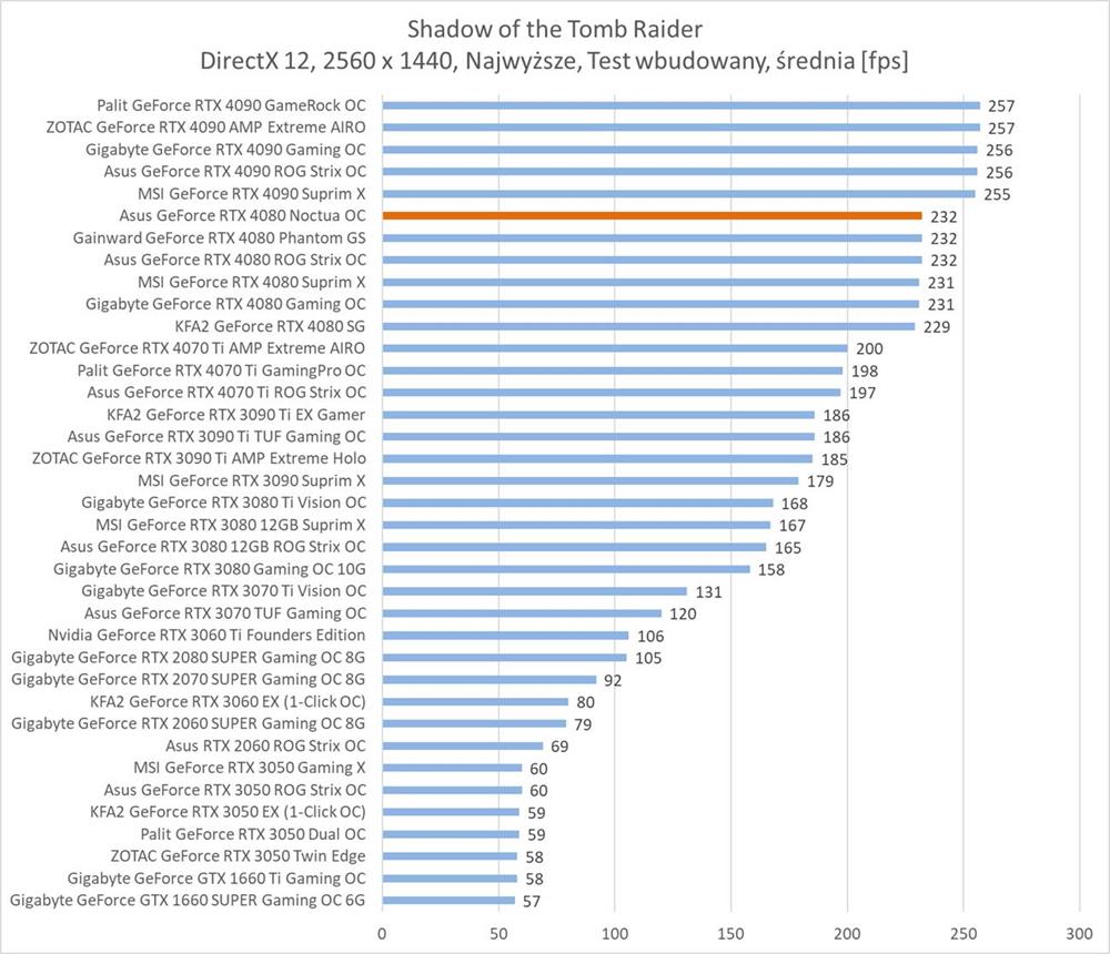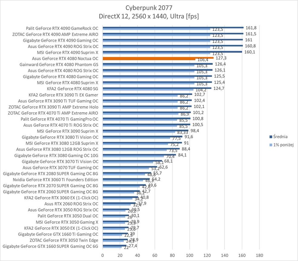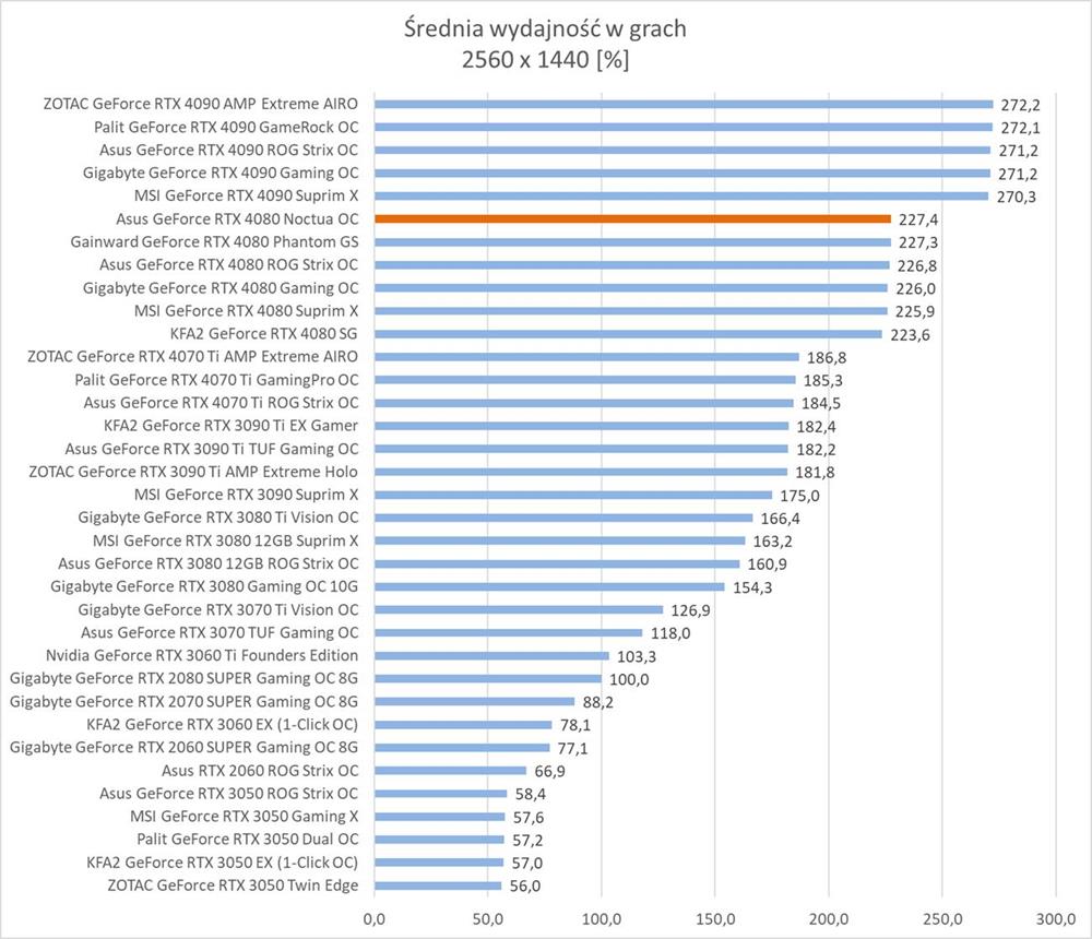 W 2560 x 1440 ponownie mamy do czynienia ze świetnymi wynikami. Asus GeForce RTX 4080 Noctua OC jest też jednym z najwydajniejszych RTX 4080, jakie miałem w testach.