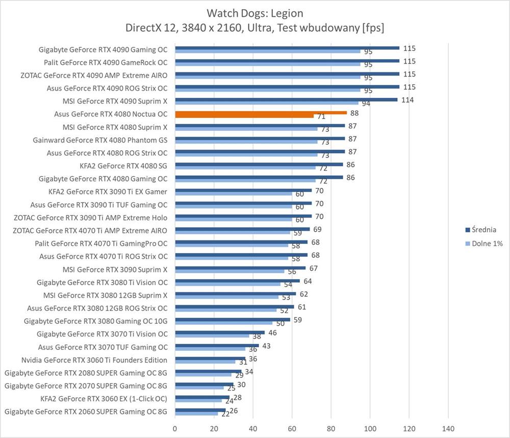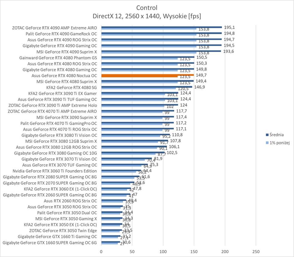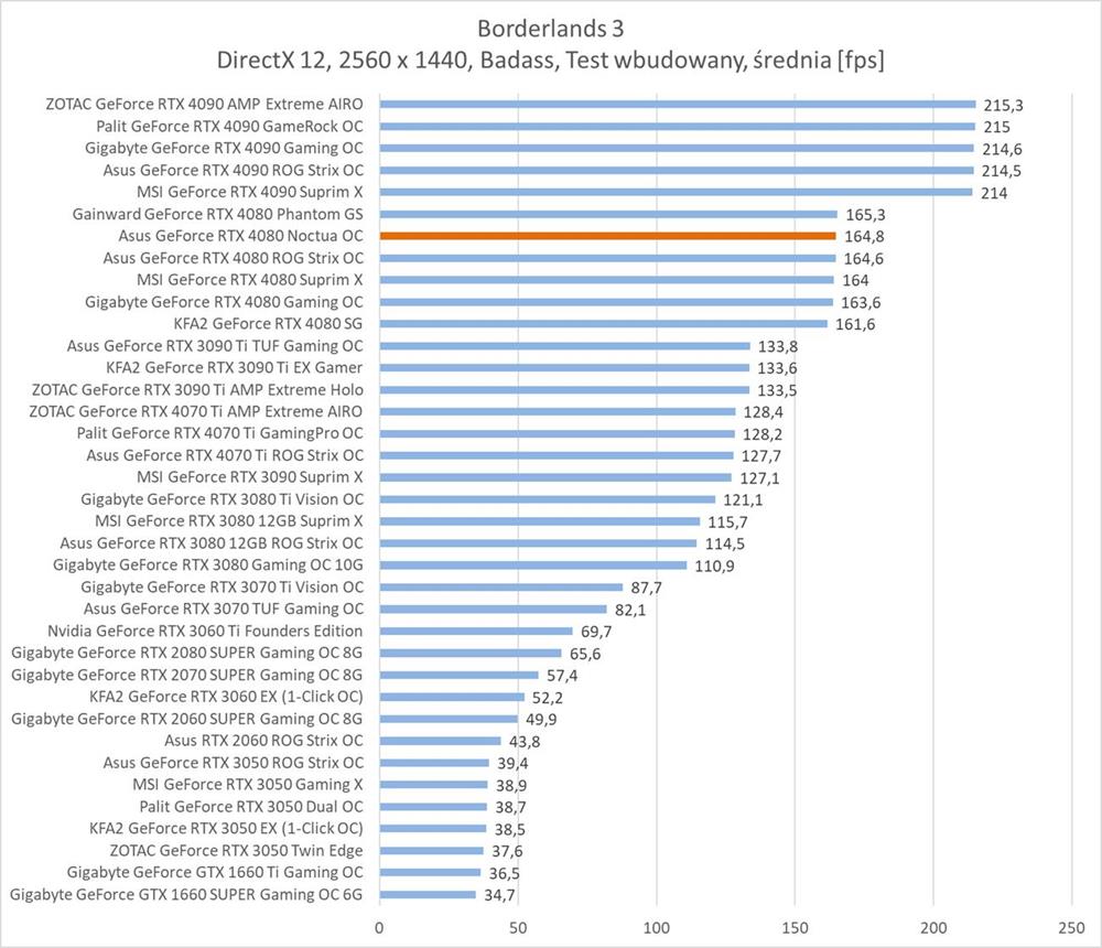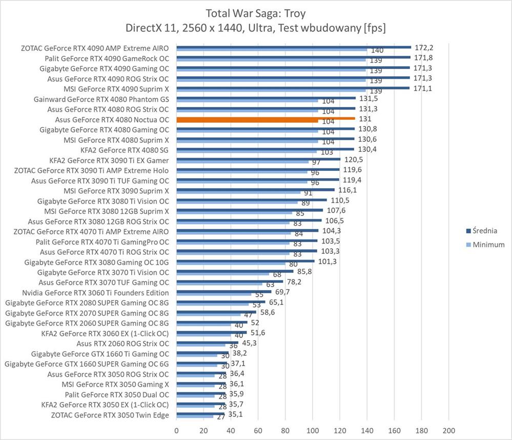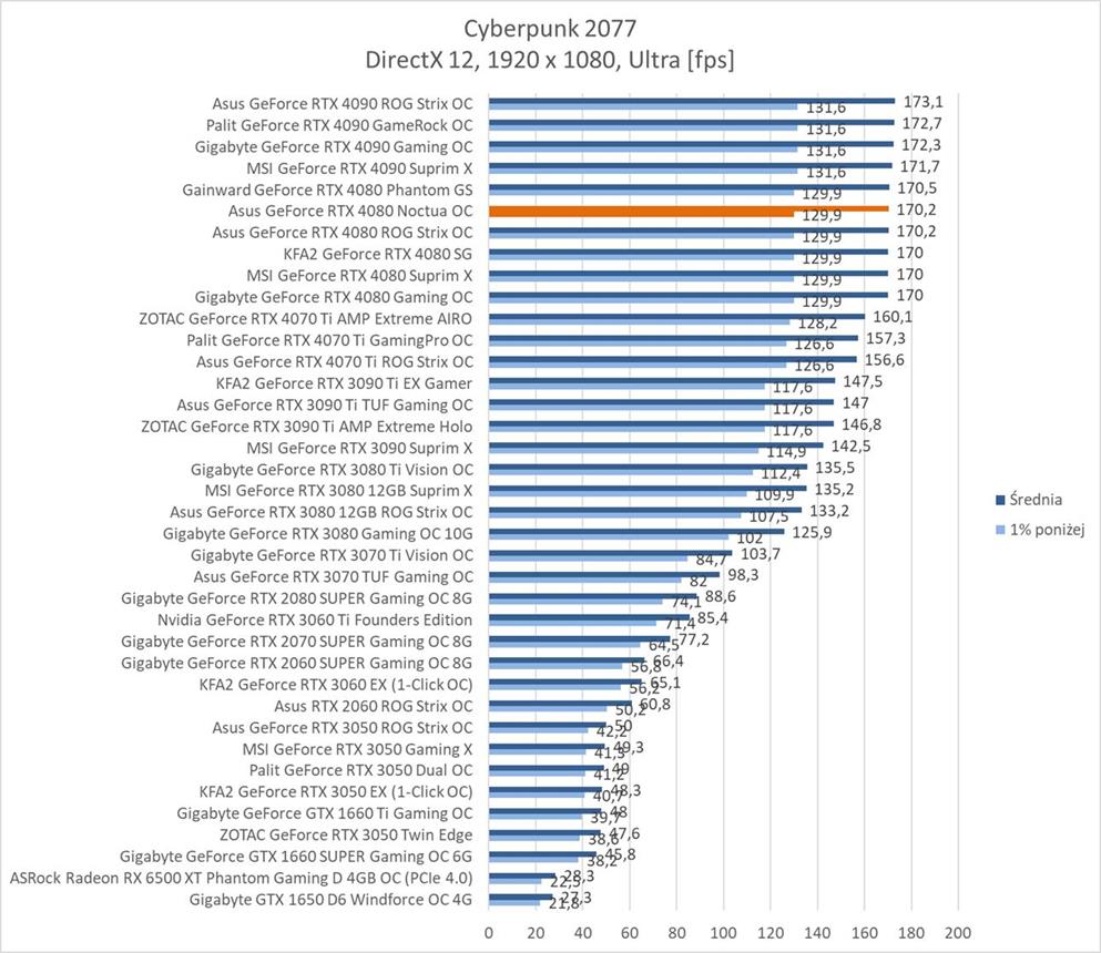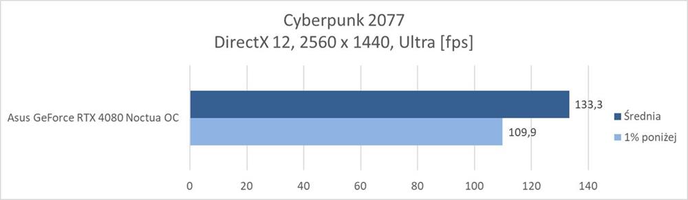 W 2560 x 1440 ponownie mamy do czynienia ze świetnymi wynikami. Asus GeForce RTX 4080 Noctua OC jest też jednym z najwydajniejszych RTX 4080, jakie miałem w testach.