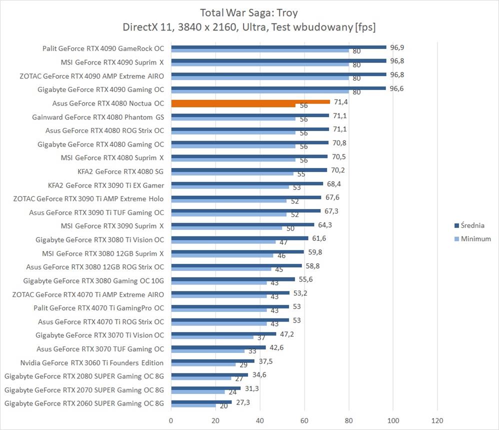 RTX 4080 zapewnia również bardzo dobrą wydajność w rozdzielczości 3840 x 2160. Średnie fps we wszystkich grach są powyżej 60.