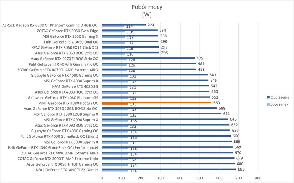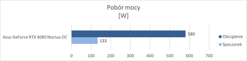 Pobór mocy pod obciążeniem jest na poziomie pozostałych RTX 4080, choć jest minimalnie wyższy od pozostałych. Jest to jednak nadal świetny wynik, niższy choćby od RTX 3080 12 GB.