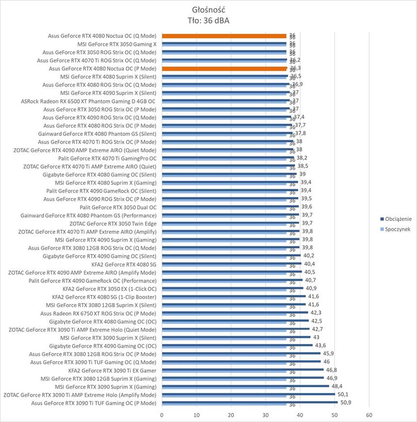 Asus GeForce RTX 4080 Noctua OC w spoczynku jest idealnie cicha – wentylatory nie działają. Pod obciążeniem, nawet przy BIOSie P jest naprawdę cicho i grafiki nie usłyszycie. Już tutaj mamy do czynienia prawie z tłem, więc różnice przy Q są niskie, ale w rzeczywistości obroty wentylatorów są znacznie niższe, przez co wzrosły temperatury. Grafika jest więc bez wątpienia najcichszym wydaniem RTX 4080, z jakim miałem do czynienia.