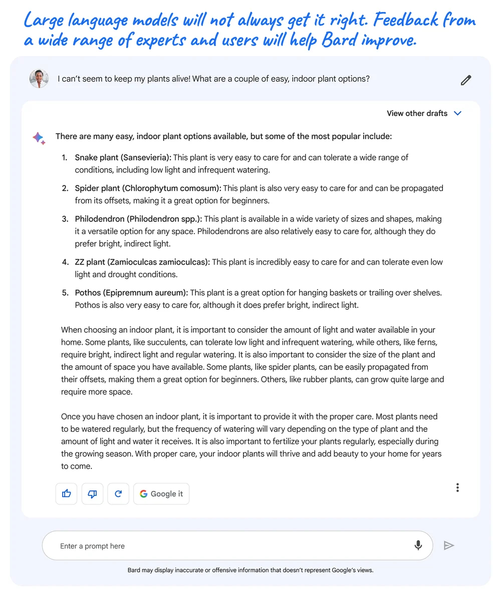 Chatbot Google’a bazuje na jednej z lekkich wersji modelu językowego z grupy LamDA. Interfejs prezentuje się analogicznie do tego co mogliśmy obserwować w wyszukiwarce Bing, ale za nią stoi inny duży model językowy: GPT-4. Na razie Bard generuje wyłącznie treści angielskojęzyczne, ale daje użytkownikowi większą swobodę w pisaniu zapytań w mniej syntetyczny sposób. Co ciekawe, w oficjalnej komunikacji Google dość otwarcie pozycjonuje chatbota jako rozwiązanie uzupełniające dla własnej wyszukiwarki.