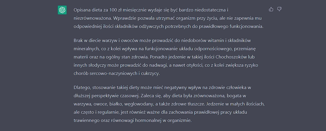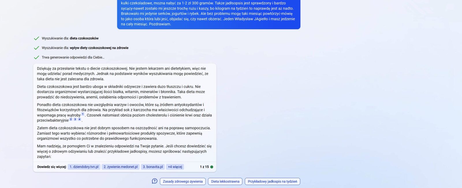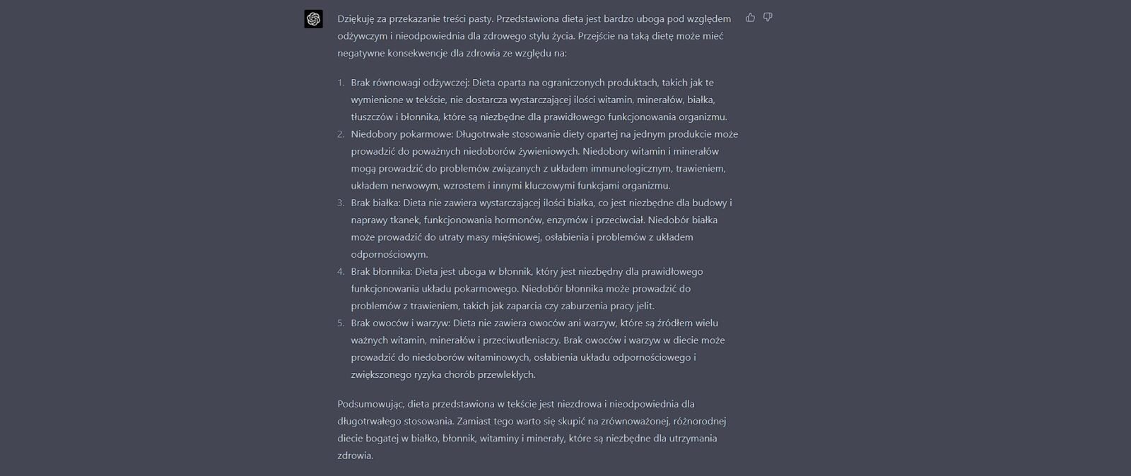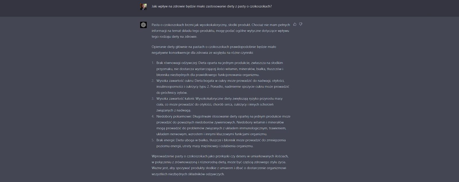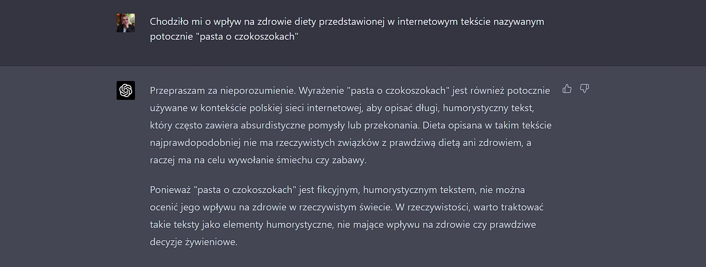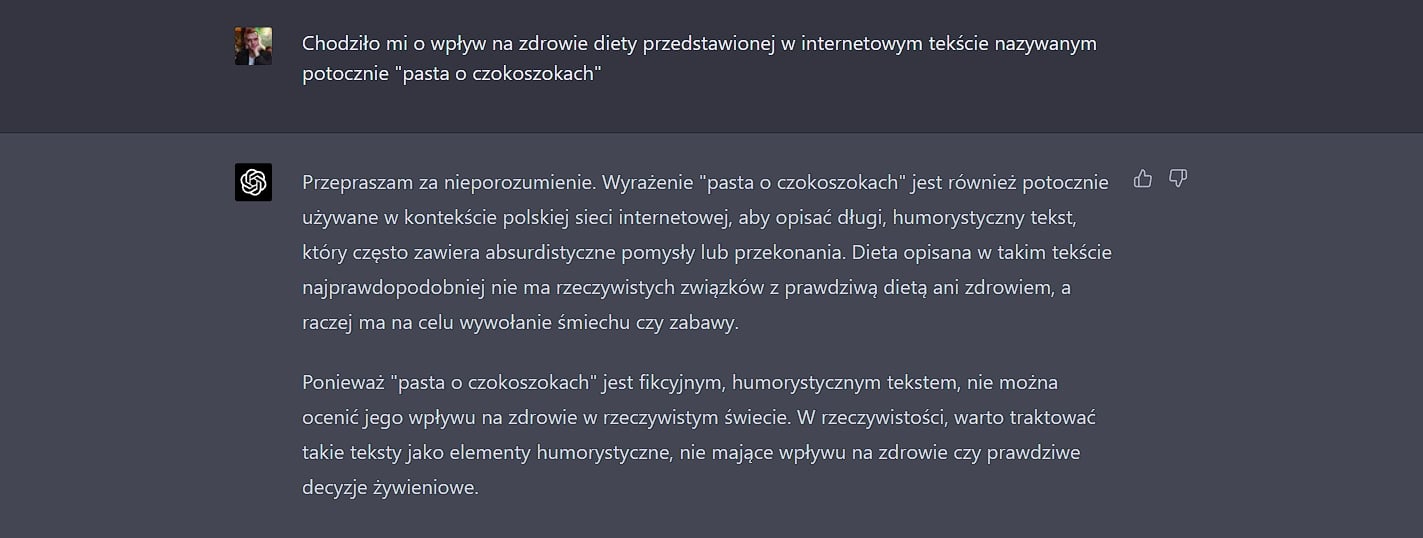 Spróbowałem także wykorzystać szeroką wiedzę Chat-GPT4 i skonfrontować ją z memiczną częścią internetu jako trening komunikacji międzyludzkiej. Pytanie o dietę czokoszokową i jej wpływ na zdrowie okazało się być (czoko)szokiem. Dla niewtajemiczonych: pasta o diecie czokoszokowej to popularny swego czasu tekst, który podawany był na forach oraz w internetowych społecznościach w celach humorystycznych. Nie będziemy przytaczać całej treści, gdyż tę łatwo znaleźć w internecie. Tekst posłużył jednak do zrozumienia, jak dobrze ChatGPT-4 wnioskuje i łączy te elementy ze swoją wiedzą.