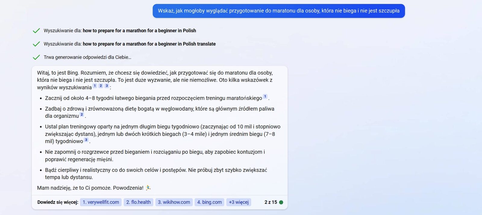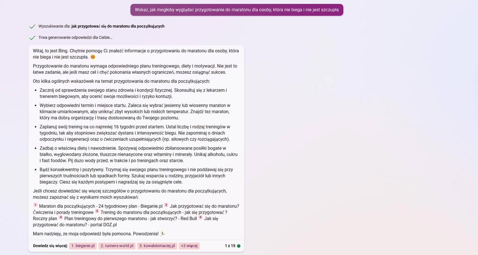 Porównałem odpowiedź z tym, co mogę otrzymać od funkcji chatu z narzędziem Bing, także opartym o GPT-4. Czas otrzymania odpowiedzi wyniósł 52 sekundy w trybie Zrównoważonym, minutę i 27 sekund w trybie Kreatywnym i po kilkanaście sekund na każdą odpowiedź w trybie Precyzji. Co ciekawe, w trybie Zrównoważonym oraz Kreatywnym Bing w wyszukiwaniu nazwał “osobę nie szczupłą i nie biegającą” początkującym, co zapewne ułatwiło wyszukiwanie, ale odebrało nieco z precyzji. Ponadto tryb Zrównoważony korzystał z porad w języku angielskim. W trybie Precyzyjnym Bing odpowiadał krócej i zadawał na końcu pytania nakierowujące na konkretne dziedziny. Najbardziej holistyczną odpowiedź zapewnił tryb Kreatywny, który przygotował plan od pierwszego do ostatniego kroku.