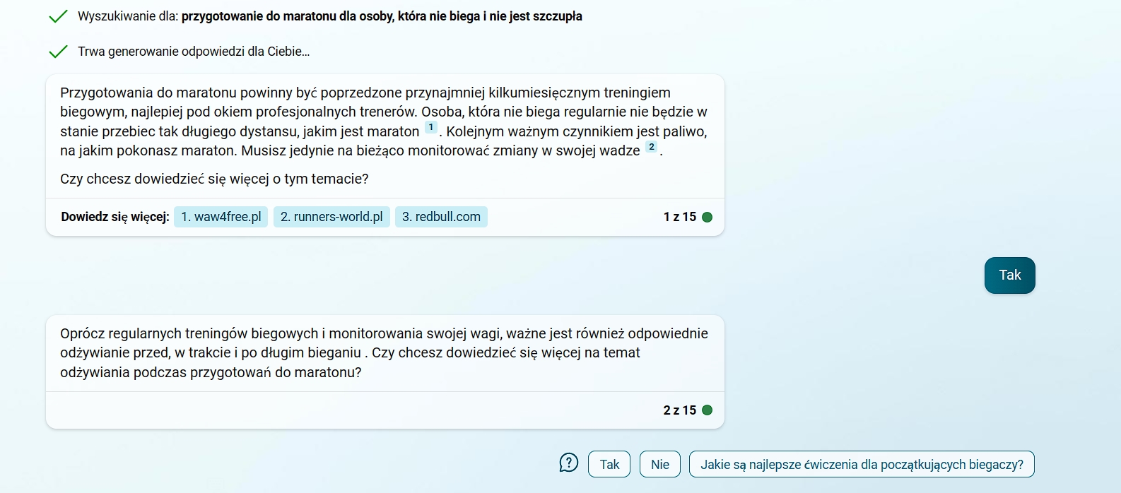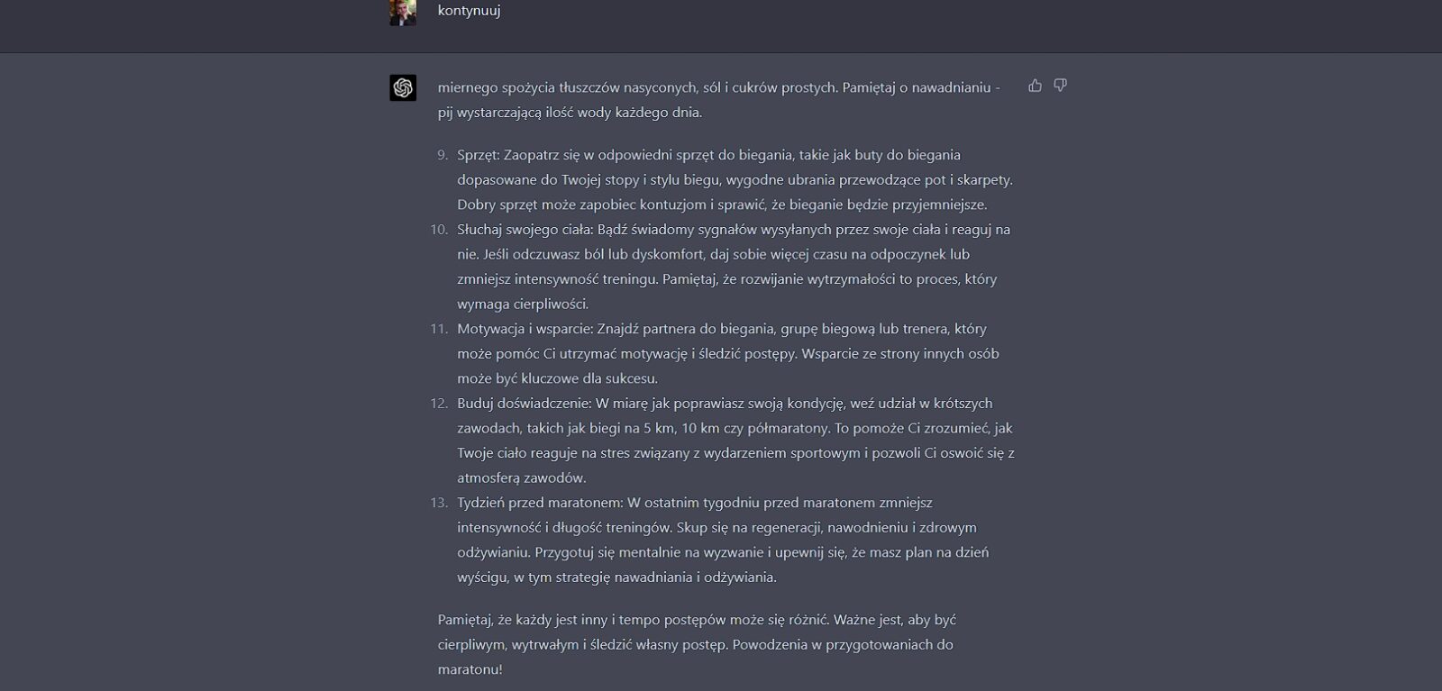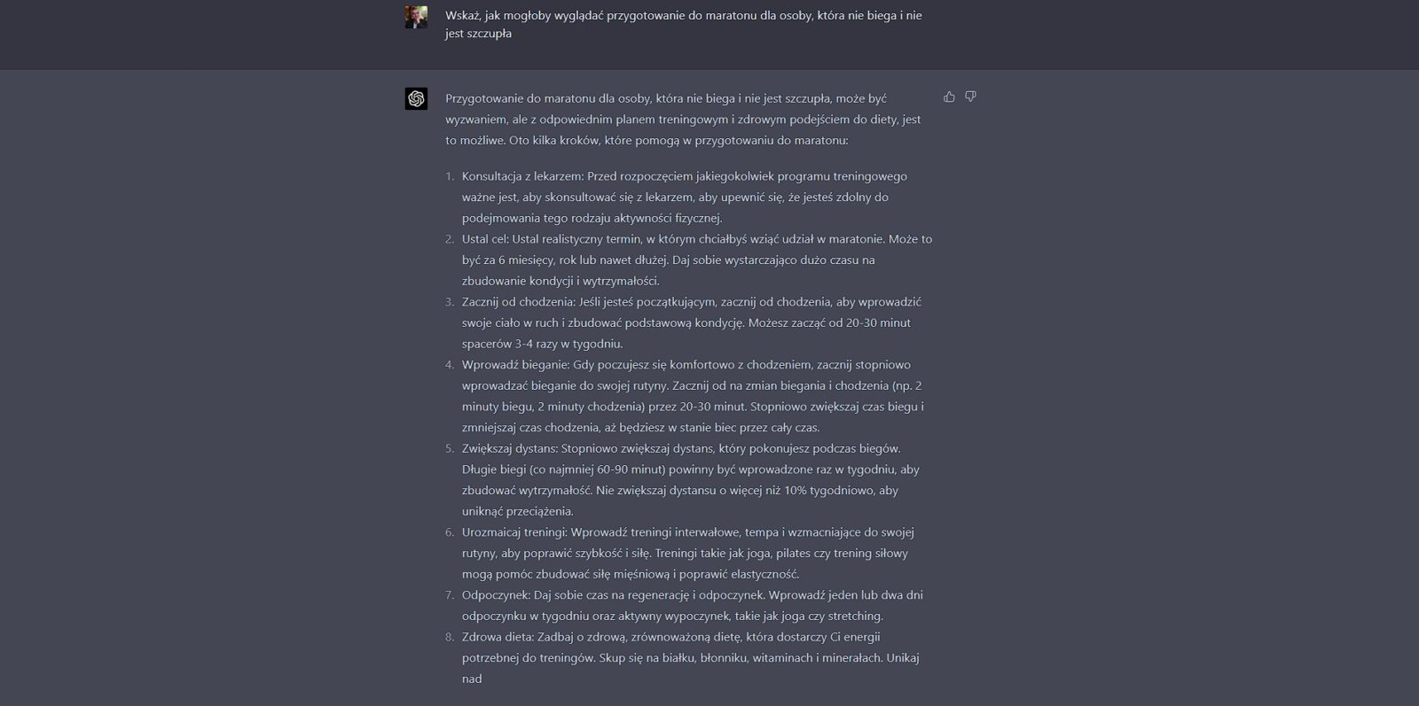 ChatGPT-4 brzmi rozsądnie i przekonująco. Jako osoba, która nie specjalizuje się w maratonach, zapytałem o kroki niezbędne do przygotowania się do maratonu. Nie były to porady dalece spersonalizowane, ale wydają się spełniać założenia poprawnego przygotowania do biegu długodystansowego. Odpowiedź ponownie została rozbita na dwie wiadomości, a do tego udzielanie jej zajęło łącznie blisko cztery i pół minuty.