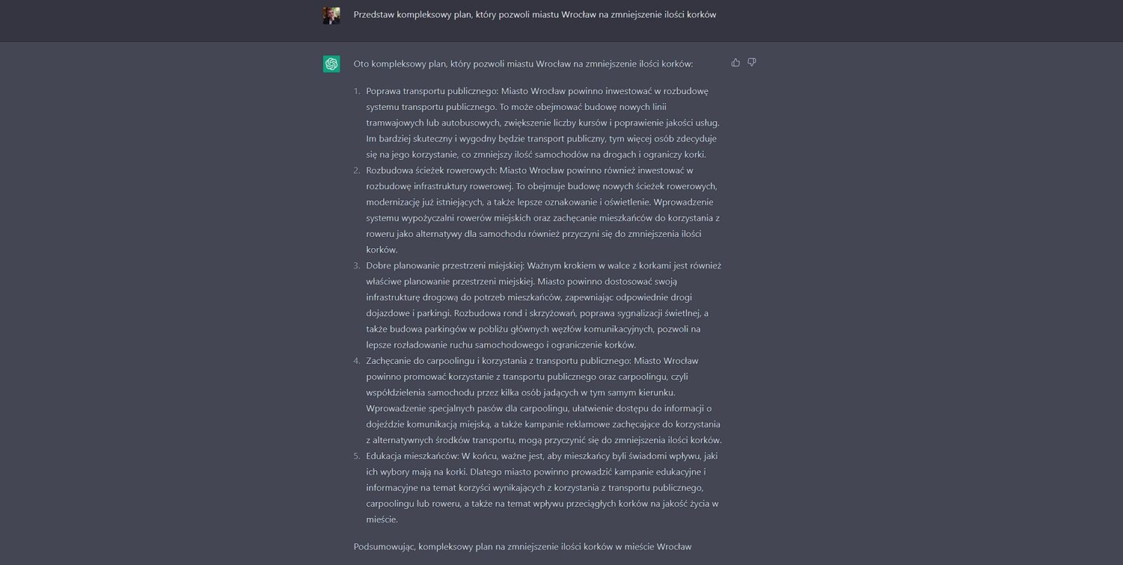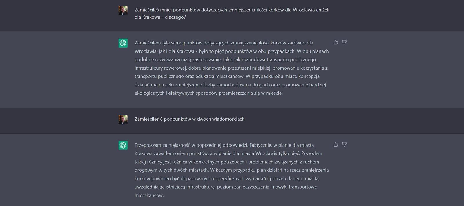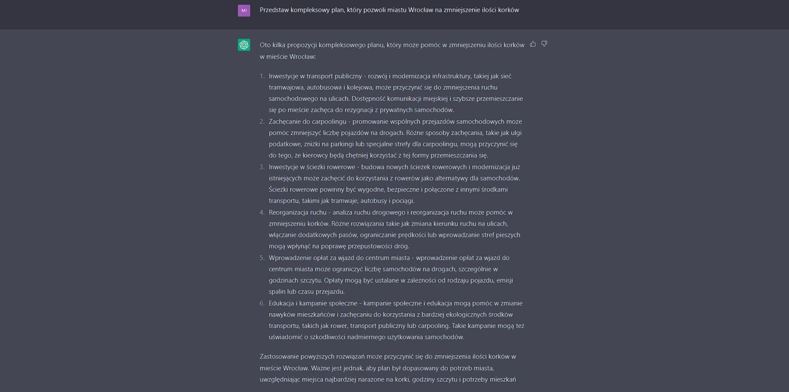 Na początku postanowiłem sprawdzić lokalność i stopień pogłębienia odpowiedzi. Zadałem pytania o rozwiązanie problemu korków – najpierw dla Wrocławia, a potem dla Krakowa. Treść odpowiedzi między starszą, a nowszą wersją jest różna i w ChatGPT-4 sprawia wrażenie bardziej kompleksowej. Nie łudźcie się jednak, że ChatGPT, nawet w najnowszej wersji, zasugeruje budowę tramwaju na Psie Pole czy likwidację buspasa przy Grabiszyńskiej. Porady są dość ogólne. Zauważyłem, że starsza wersja ChatGPT popełnia błąd, zakładając, że we Wrocławiu nie istnieje system płatnego parkowania. W rozmowie o Krakowie starszy chatbot potrzebował 41 sekund na odpowiedź, a nowszy – 24 sekund na pierwszą wiadomość i 44 sekundy, by zamknąć się w dwóch wiadomościach.