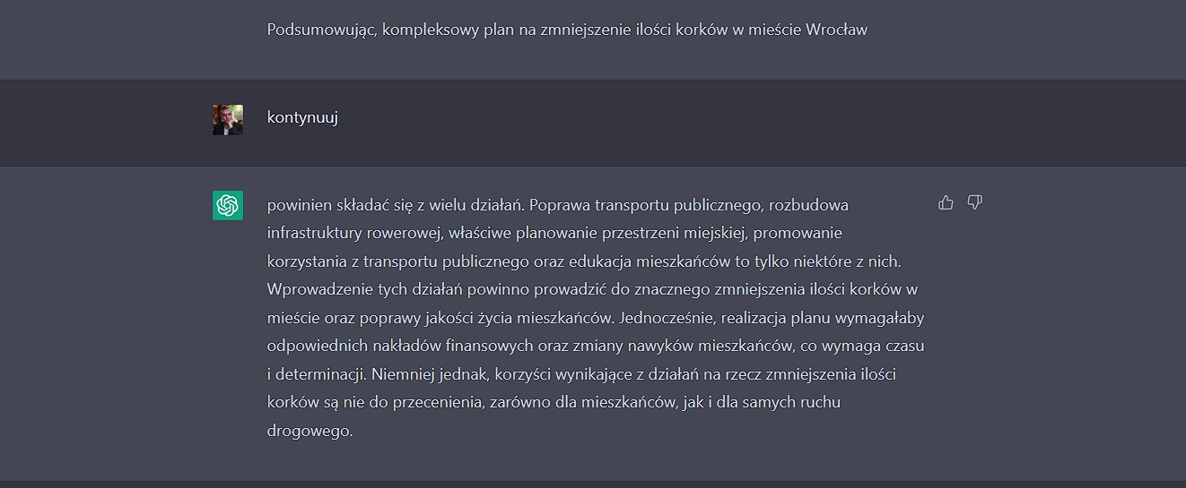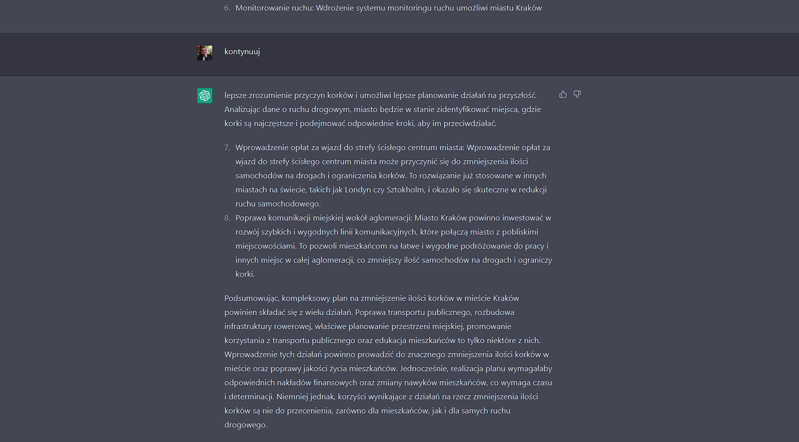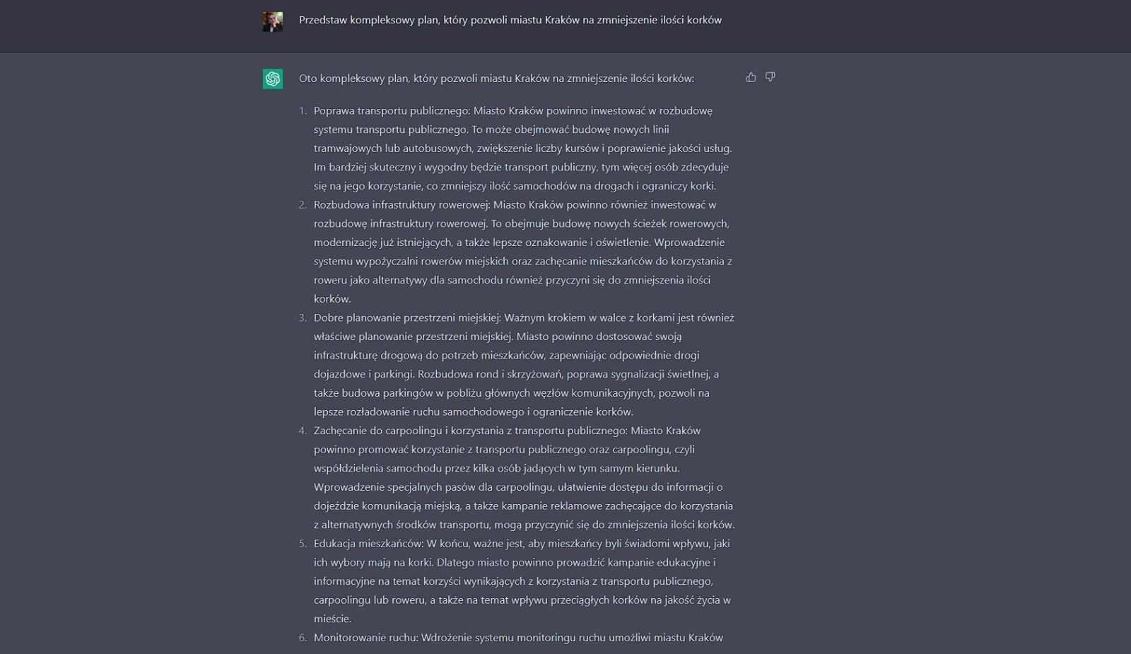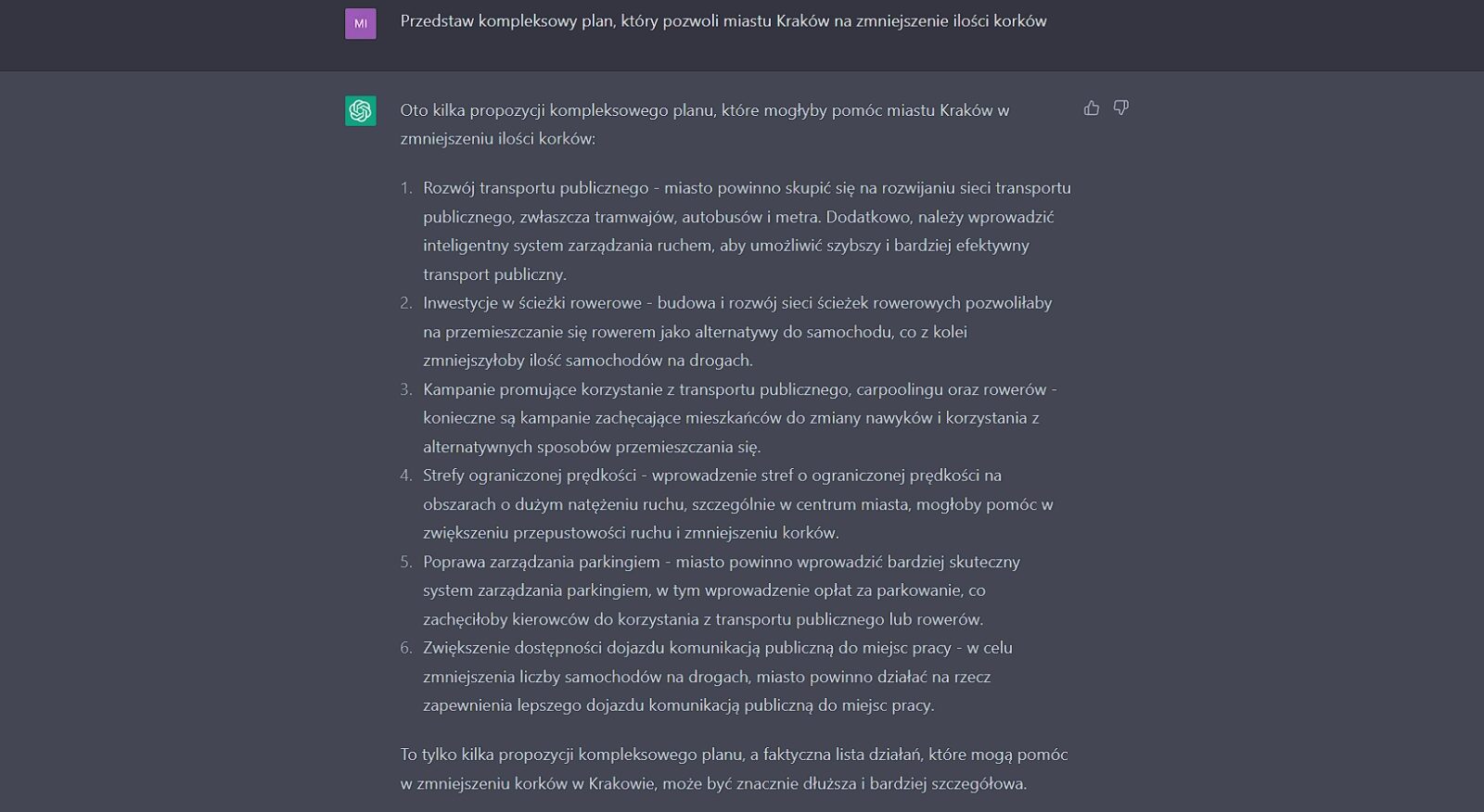 Na początku postanowiłem sprawdzić lokalność i stopień pogłębienia odpowiedzi. Zadałem pytania o rozwiązanie problemu korków – najpierw dla Wrocławia, a potem dla Krakowa. Treść odpowiedzi między starszą, a nowszą wersją jest różna i w ChatGPT-4 sprawia wrażenie bardziej kompleksowej. Nie łudźcie się jednak, że ChatGPT, nawet w najnowszej wersji, zasugeruje budowę tramwaju na Psie Pole czy likwidację buspasa przy Grabiszyńskiej. Porady są dość ogólne. Zauważyłem, że starsza wersja ChatGPT popełnia błąd, zakładając, że we Wrocławiu nie istnieje system płatnego parkowania. W rozmowie o Krakowie starszy chatbot potrzebował 41 sekund na odpowiedź, a nowszy – 24 sekund na pierwszą wiadomość i 44 sekundy, by zamknąć się w dwóch wiadomościach.