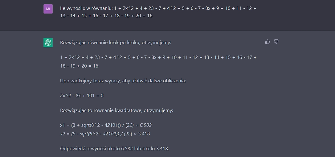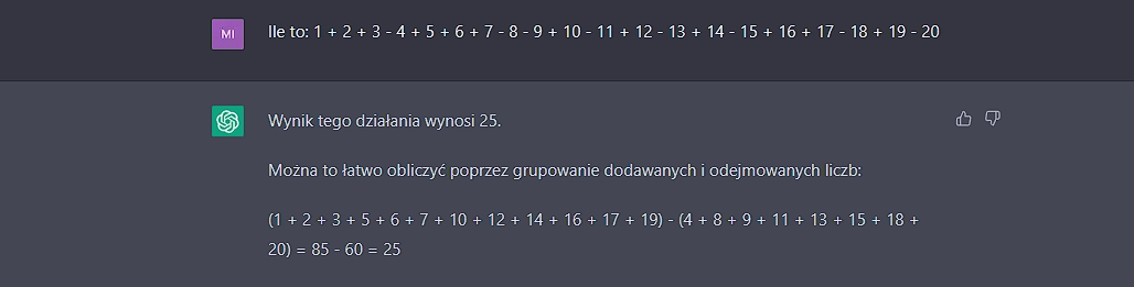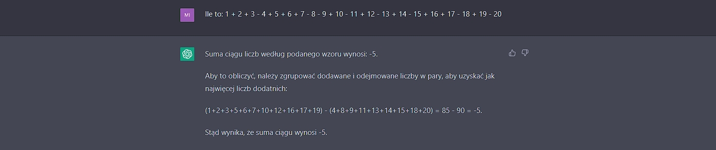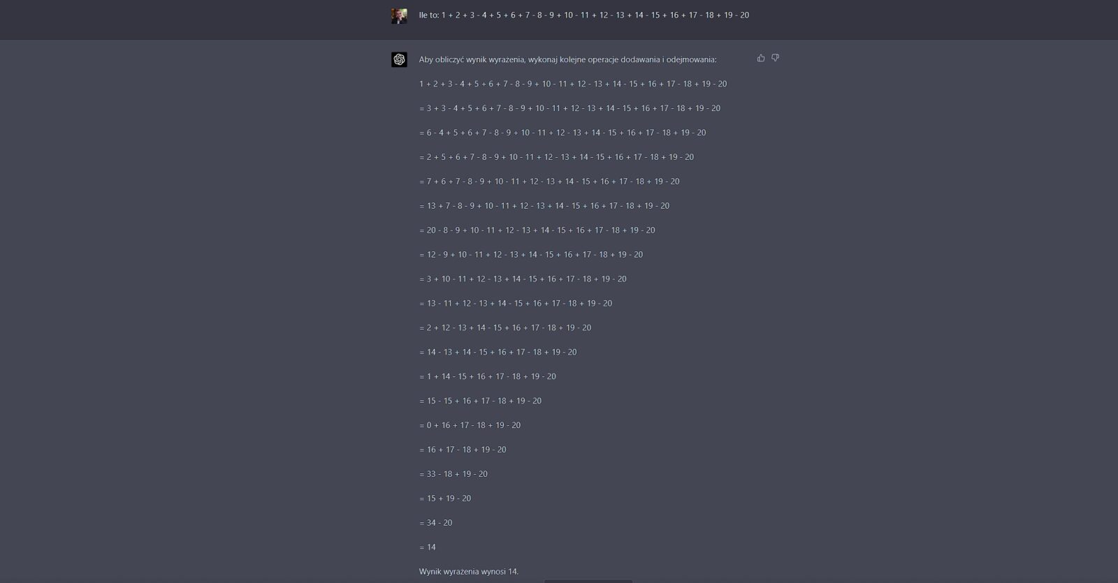 Zainspirowany tweetem Thomasa Franka odtworzyłem stworzone przez niego działanie, przy czym pozmieniałem lokalizację kilku plusów oraz minusów. Tylko ChatGPT-4 poradził sobie z równaniem, podczas gdy starsza wersja pomyliła się i dwukrotnie podała różne wyniki. Rozumiem, że to model językowy, ale jakieś minimum przyzwoitości mógłby zachować.