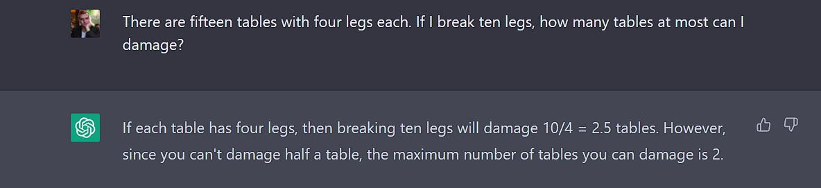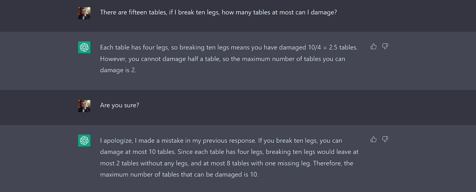Bez problemu da się stworzyć zadania, które zbiją ChatGPT-4 z tropu. Przejrzałem Twittera w poszukiwaniu inspiracji i tam znalazłem wyzwanie doktoranta Politechniki Wrocławskiej, Piotra Szymańskiego. Chodzi o powyższy Tweet. Dość oczywistym wydaje się, że łamanie po jednej nodze uszkodzi maksymalnie 10 stołów, niezależnie od tego, ile nóg ma taki mebel.