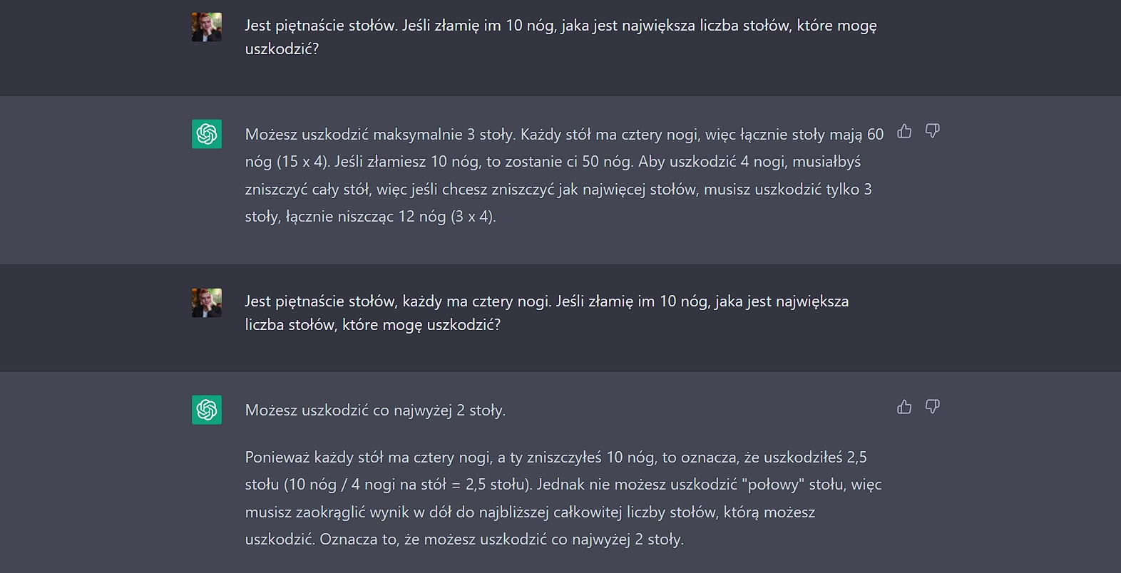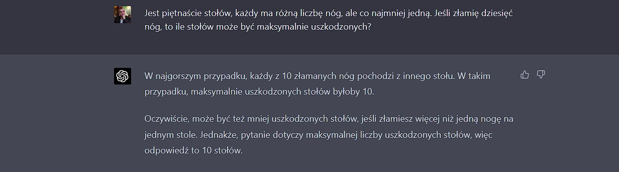 ChatGPT-4 najwyraźniej mocno wierzy w to, że każdy stół musi mieć uszkodzone cztery nogi. Nie potrafi wskazać, jak dużo stołów uda się uszkodzić. Chatbot brnie w zaparte pomimo wytłumaczenia, na czym polega uszkodzenie stołu. Co ciekawe, w języku angielskim po podważeniu jego opinii podaje inną, częściowo prawidłową odpowiedź. Przy odpowiednim zredagowaniu pytania i zaznaczenia minimalnej liczby nóg danego stołu, ChatGPT-4 wychodzi zwycięsko z potyczki. Nie jest to jednak naturalny sposób komunikacji i myślę, że większość dzieci bez problemu poradziłaby sobie z tą zagadką po chwili namysłu.