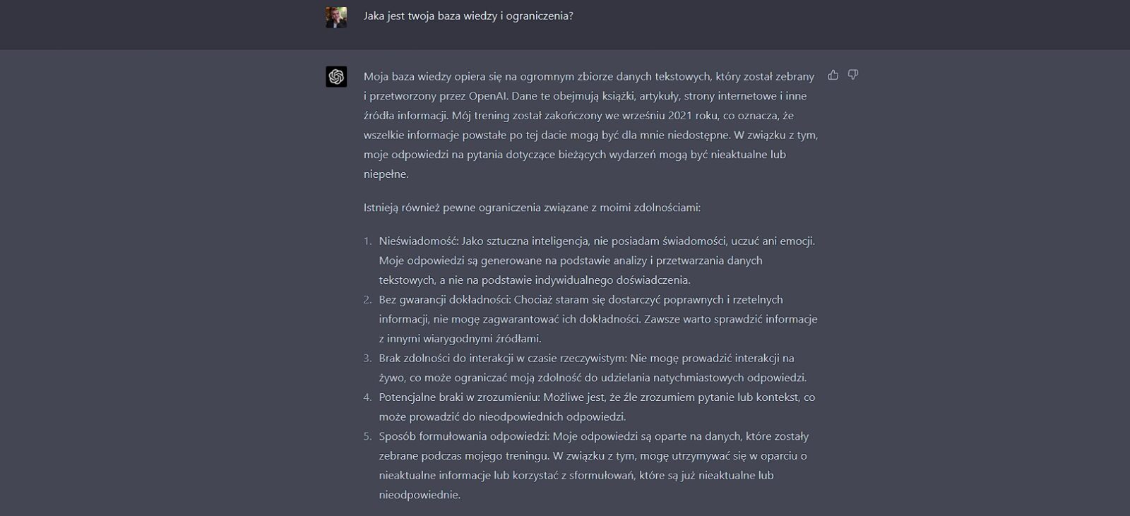 To, co różni obydwie wersje, to rozbudowanie odpowiedzi. ChatGPT-4 na to samo pytanie odpowie nie tylko większą ilością tekstu, ale i postara się rozbić go na większą liczbę akapitów lub podpunktów. Zdarza się, że odpowiedź, która w wersji 3.5 zajmowała jedną wiadomość, w ChatGPT-4 skończy się w drugiej, a nawet trzeciej wiadomości. To także zdarza się w przypadku ChatGPT-3.5, ale rzadziej i wiadomości najczęściej są krótsze. W najnowszej odsłonie w jednej wiadomości zawarto maksymalnie 2287 znaków ze spacjami.