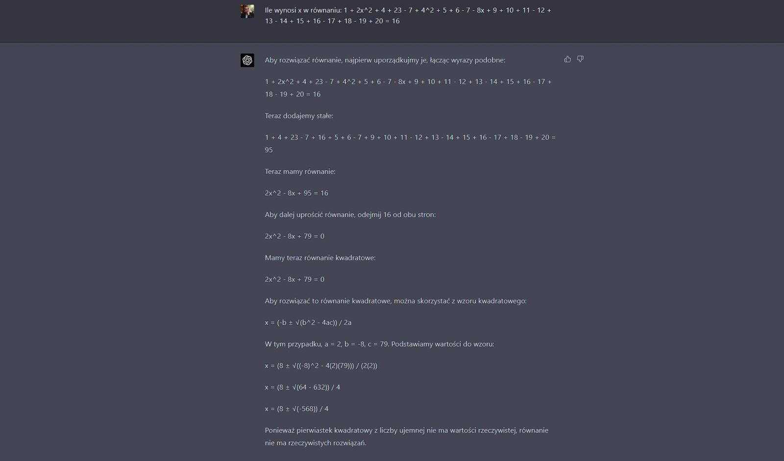 Jest pewna zmiana, która może okazać się istotna z perspektywy poszukujących dokładnych odpowiedzi. ChatGPT-4 sprawniej tłumaczy, jakimi metodami doszedł do swoich obliczeń. W dokładniejszy sposób opisuje poszczególne etapy. Dzięki temu wydaje się, że na nowszej wersji łatwiej polegać, gdy chodzi o weryfikację działań. Mógłbym powiedzieć, że jest potencjał na korepetytora, ale nawet najnowszy model od OpenAI lubi popełniać błędy.