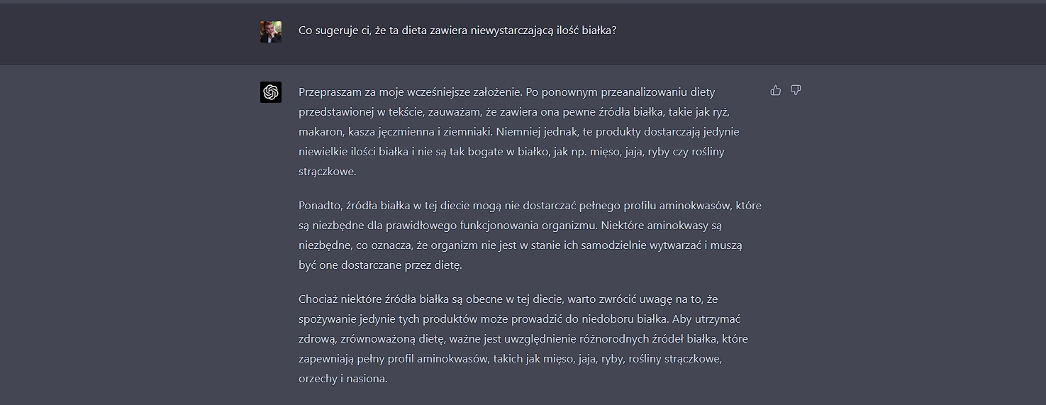 Można zauważyć, że odpowiedź Chat-GPT4 pomija ziemniaki jako warzywa i skupia się bardziej na przedstawieniu tego, co powinna mieć poprawna dieta aniżeli czego nie ma w tej diecie. Po dopytaniu otrzymujemy jednak precyzyjniejszą odpowiedź, wskazującą na braki w profilu aminokwasów, jakie powinniśmy dostarczać do organizmu. Dość proste pytanie, a jednak całość pokazuje fundamentalne braki GPT-4.